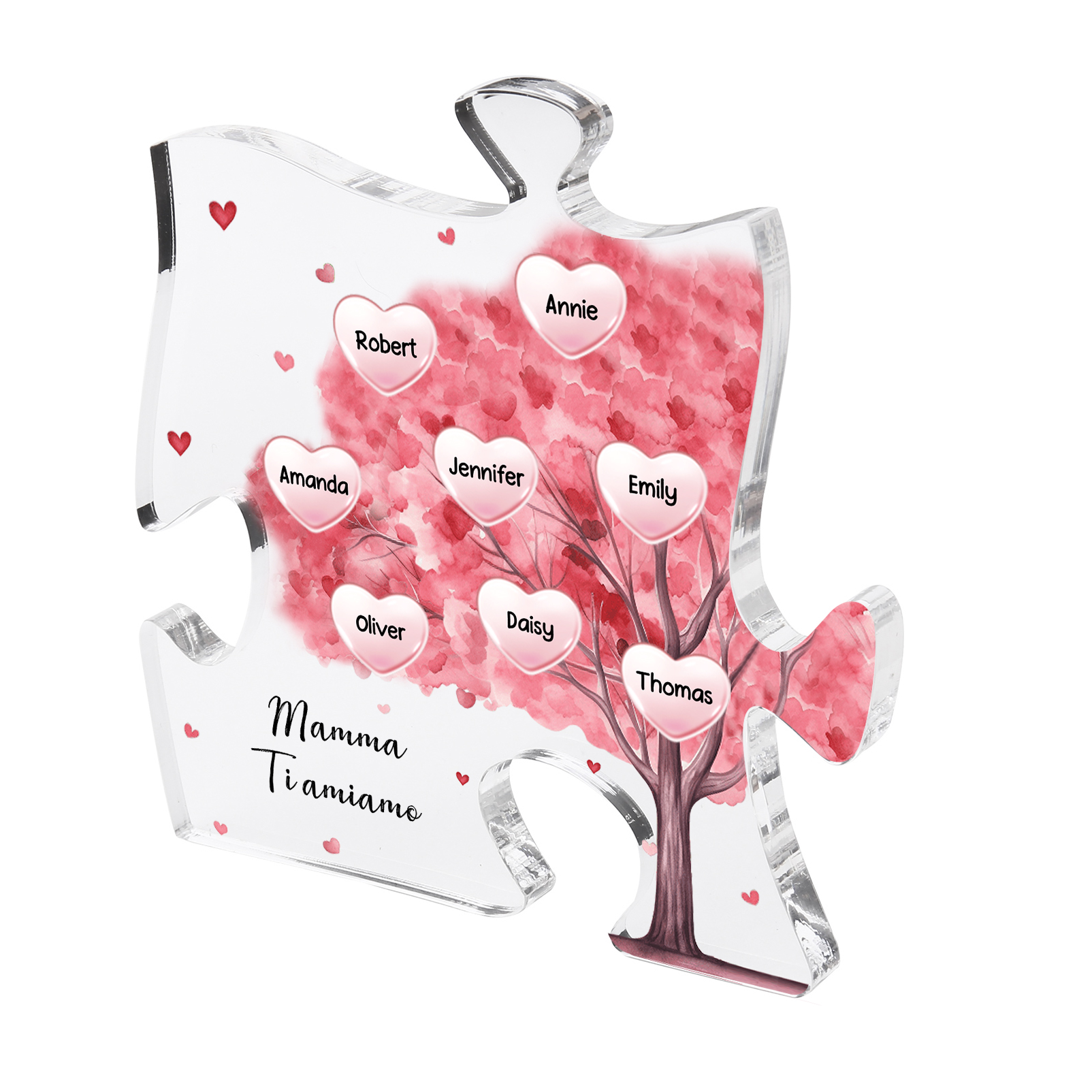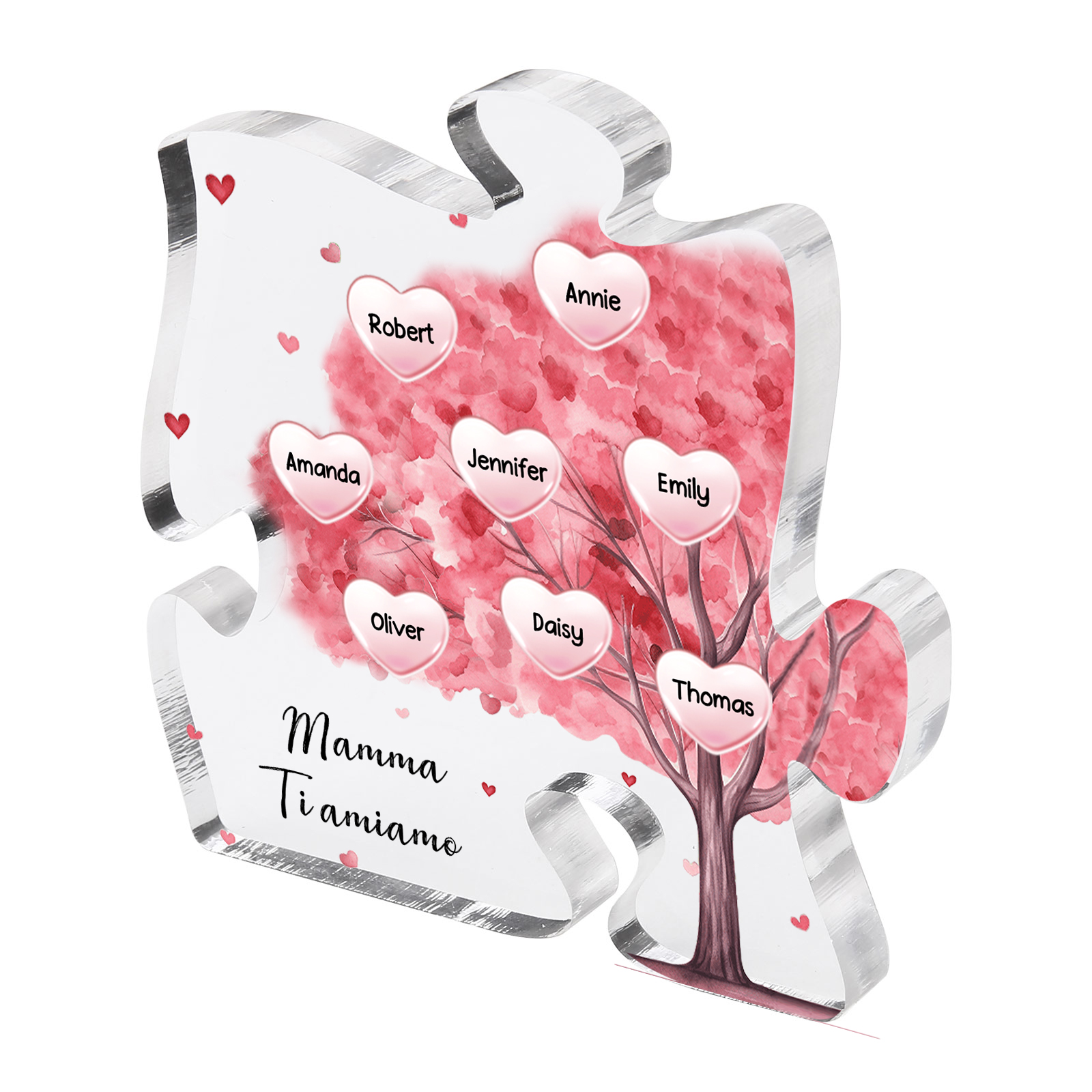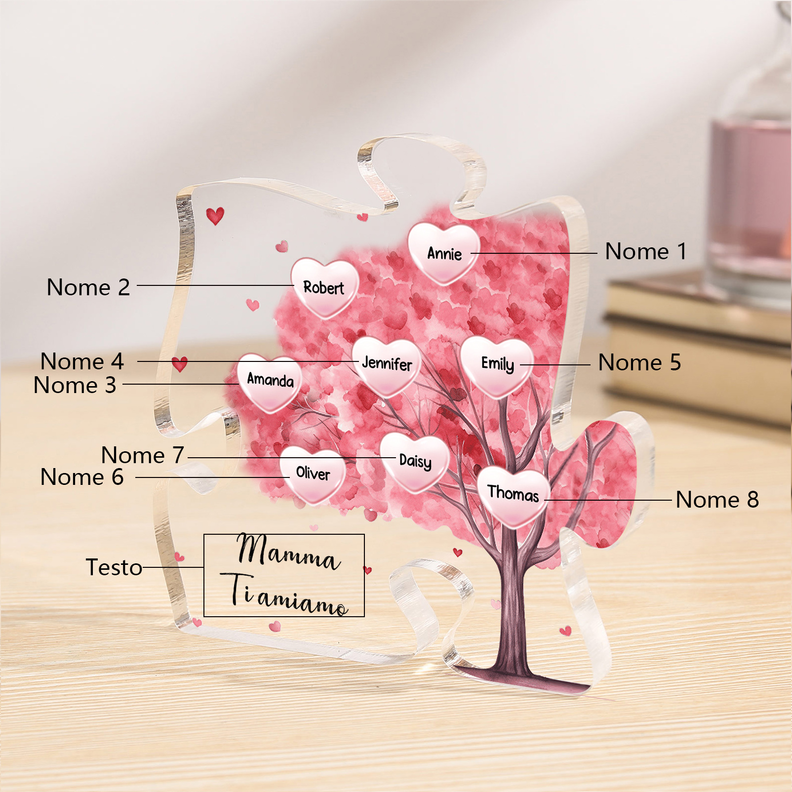Decorazione acrilica a forma di puzzle con albero rosa e 8 nomi e 1 testo personalizzati per mamma/nonna