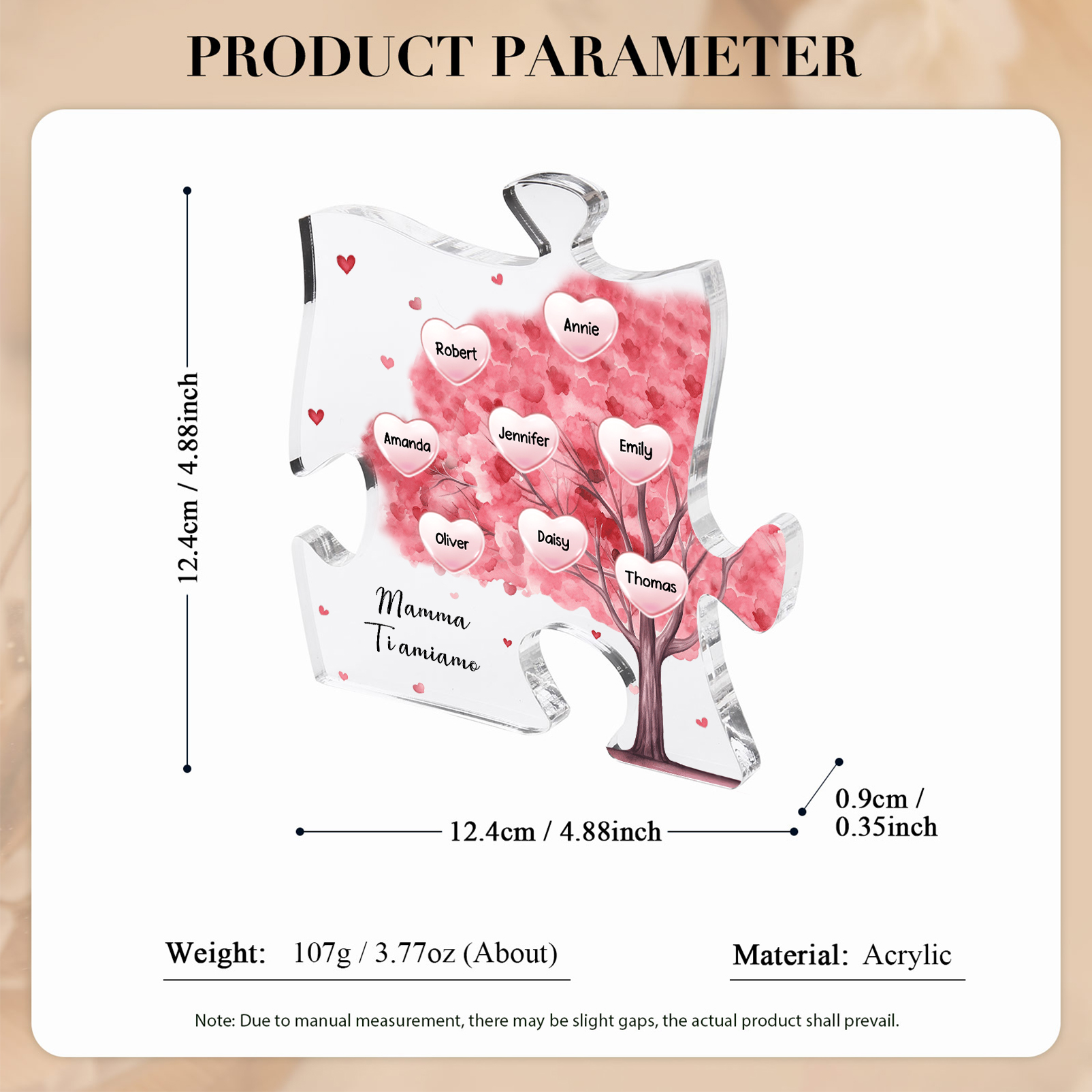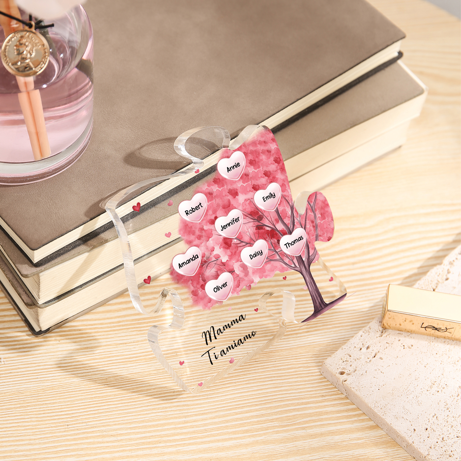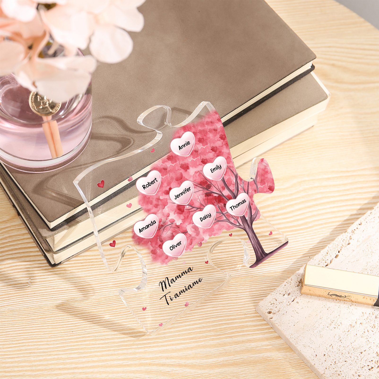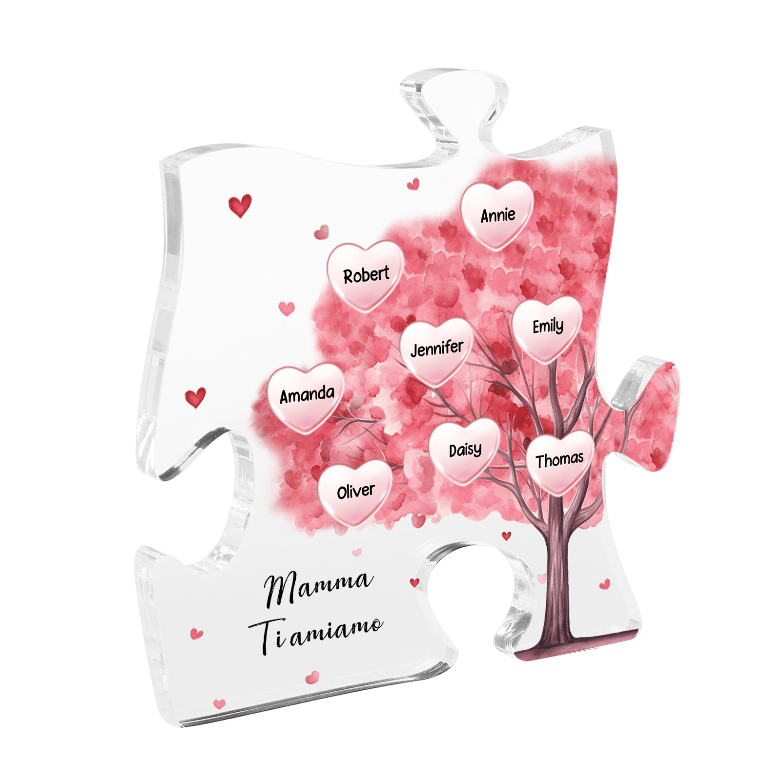Decorazione acrilica a forma di puzzle con albero rosa e 8 nomi e 1 testo personalizzati per mamma/nonna