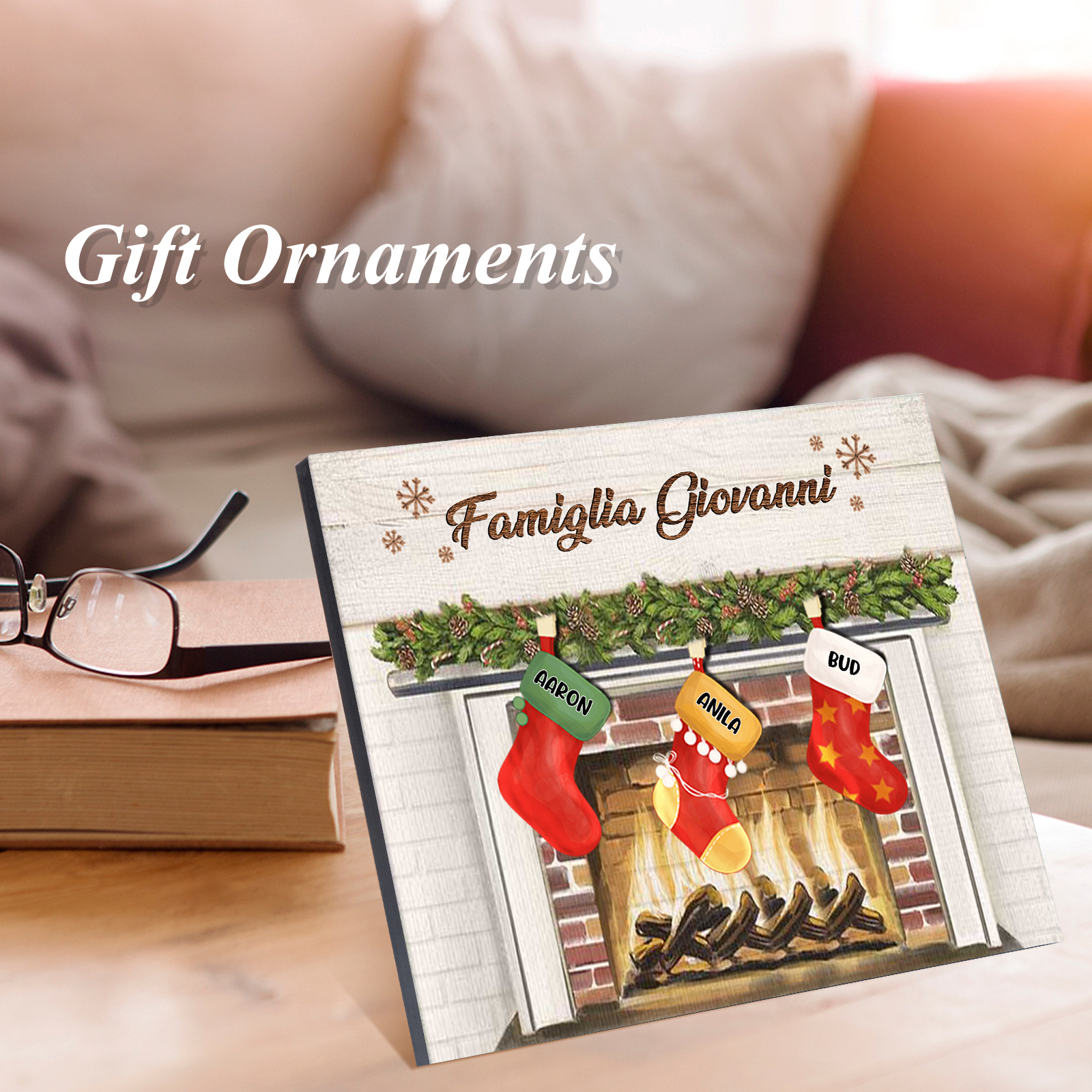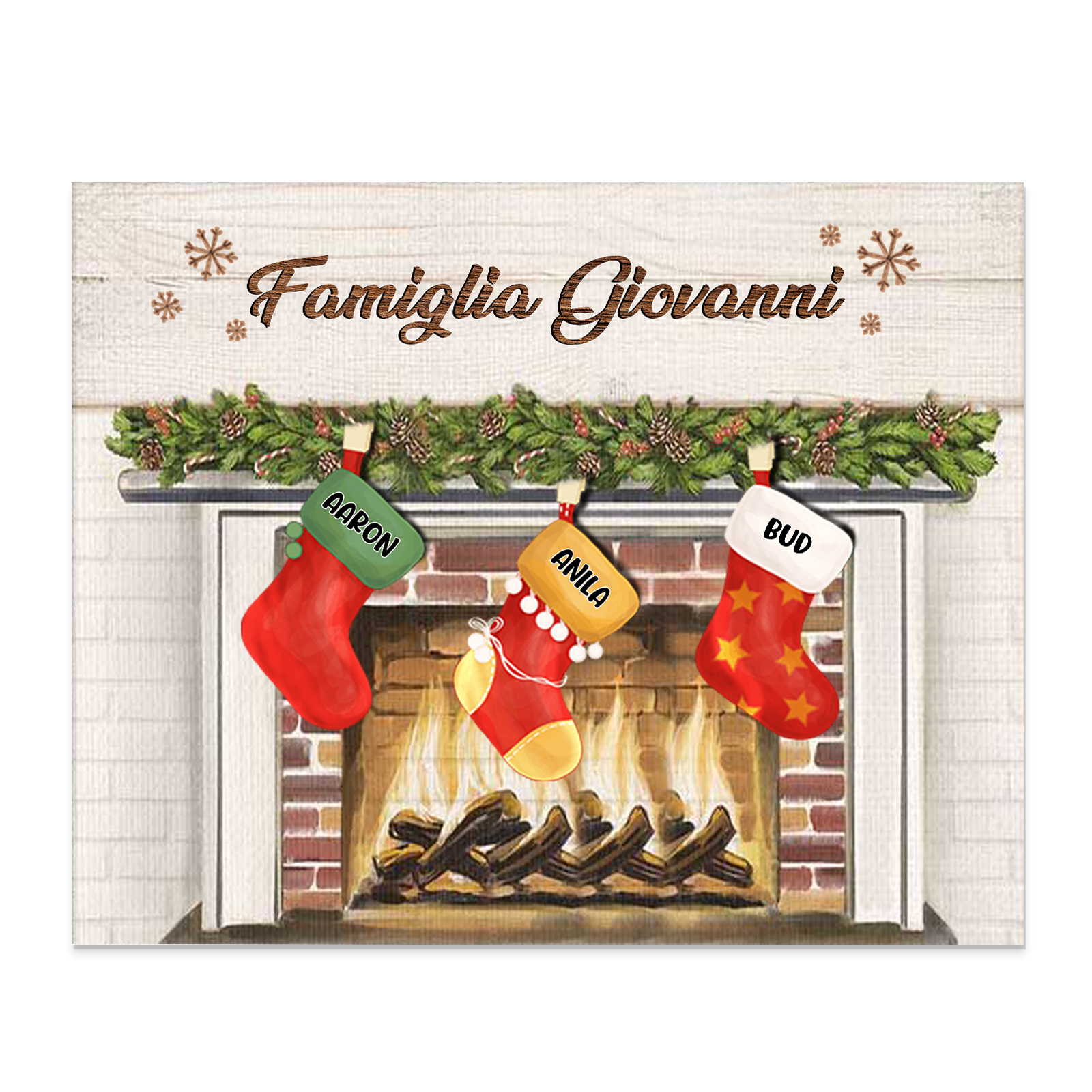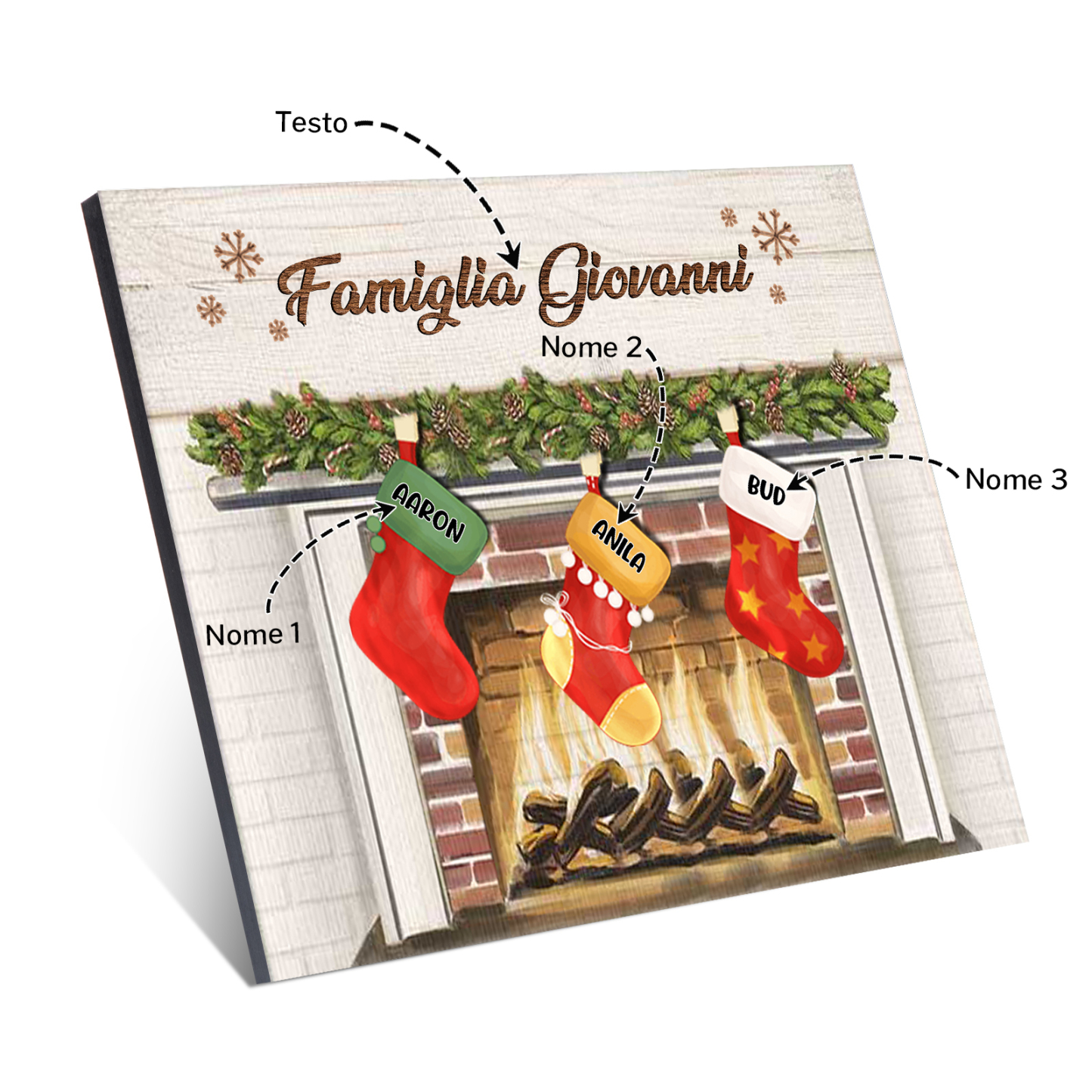Decorazione🎄FAMIGLIA GIOVANNI sotto il camino calzini pieni di regali 3 nomi e 1 testo personalizzabili