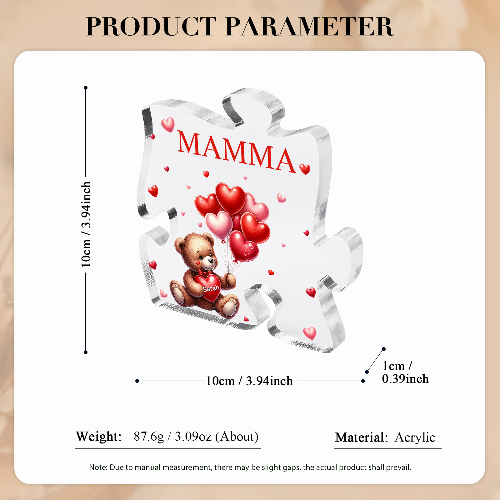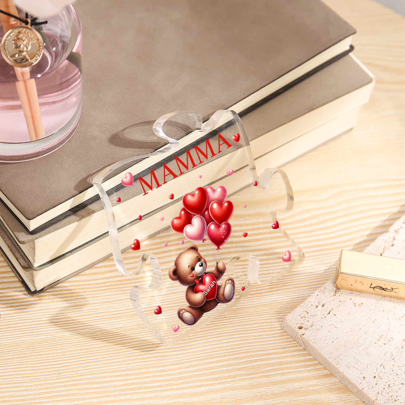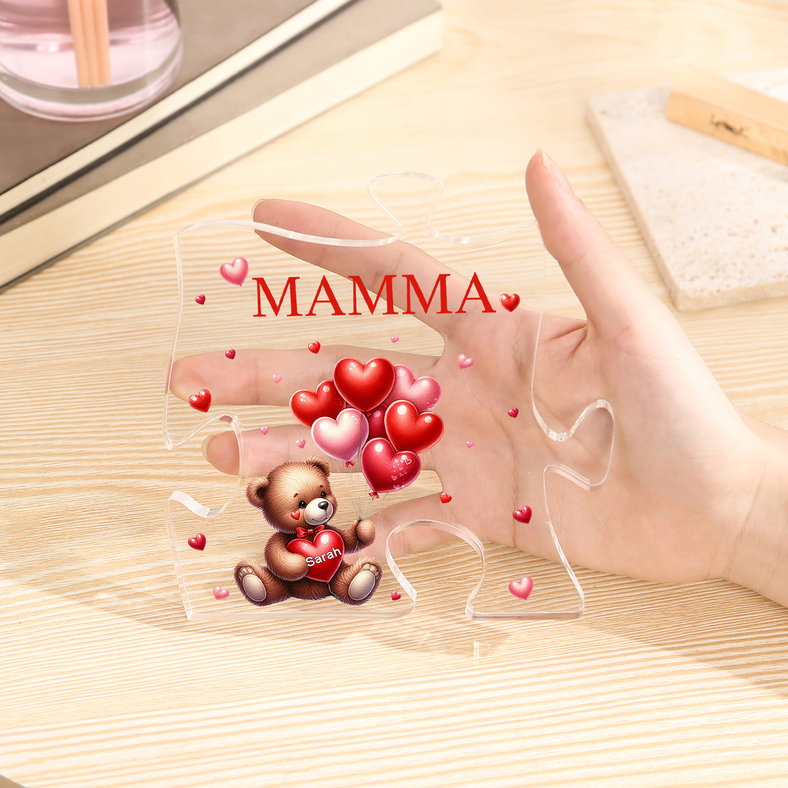 Decorazione acrilica a forma di puzzle con orsacchiotto e 1 nome e 1 testo personalizzati per mamma/nonna