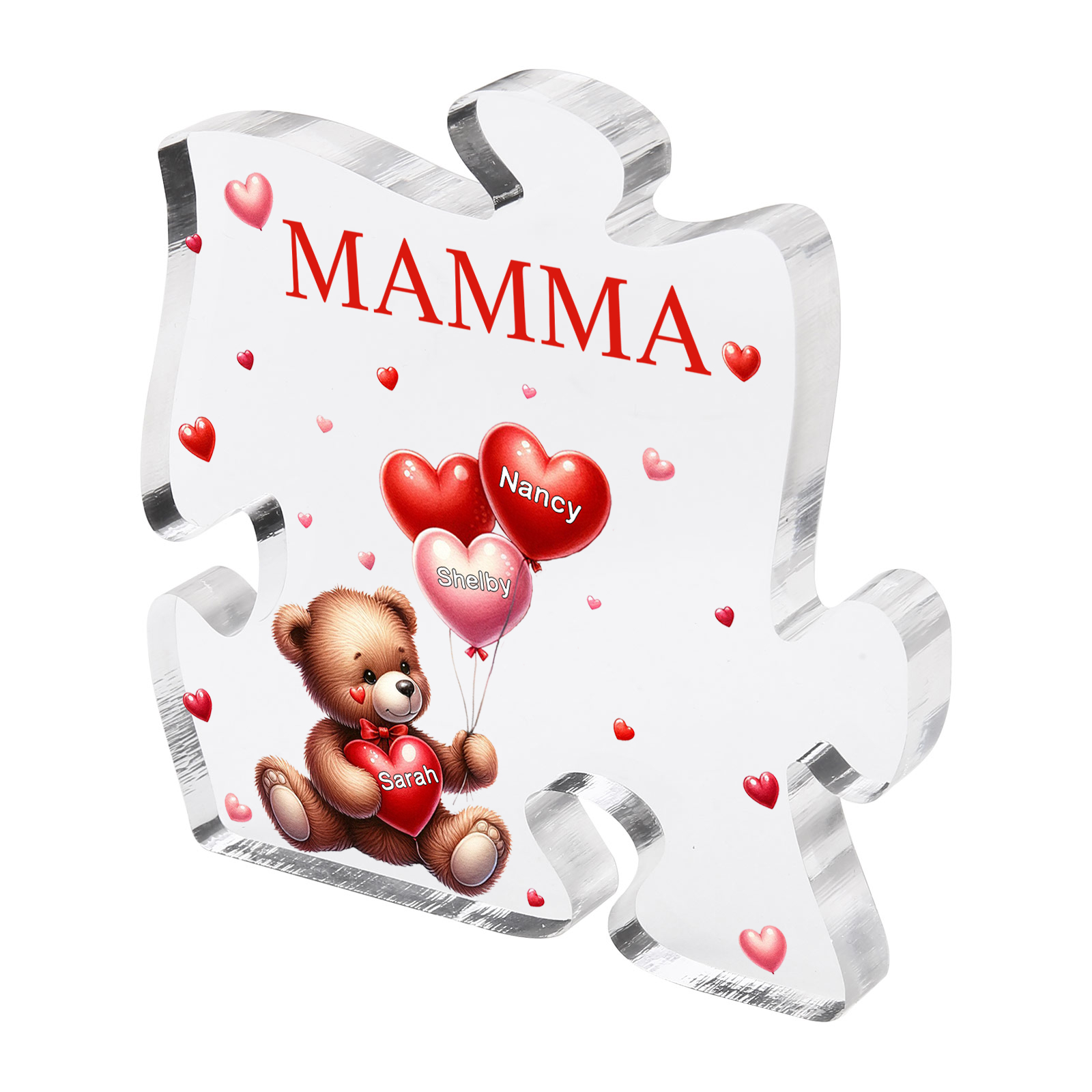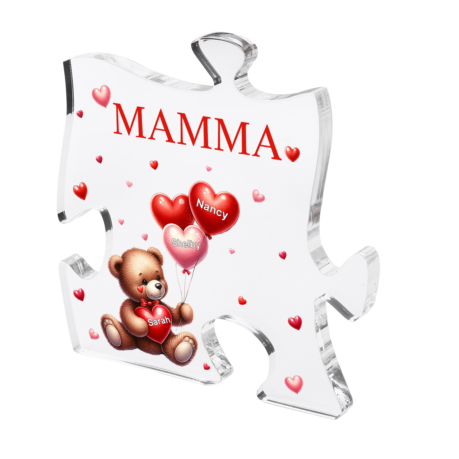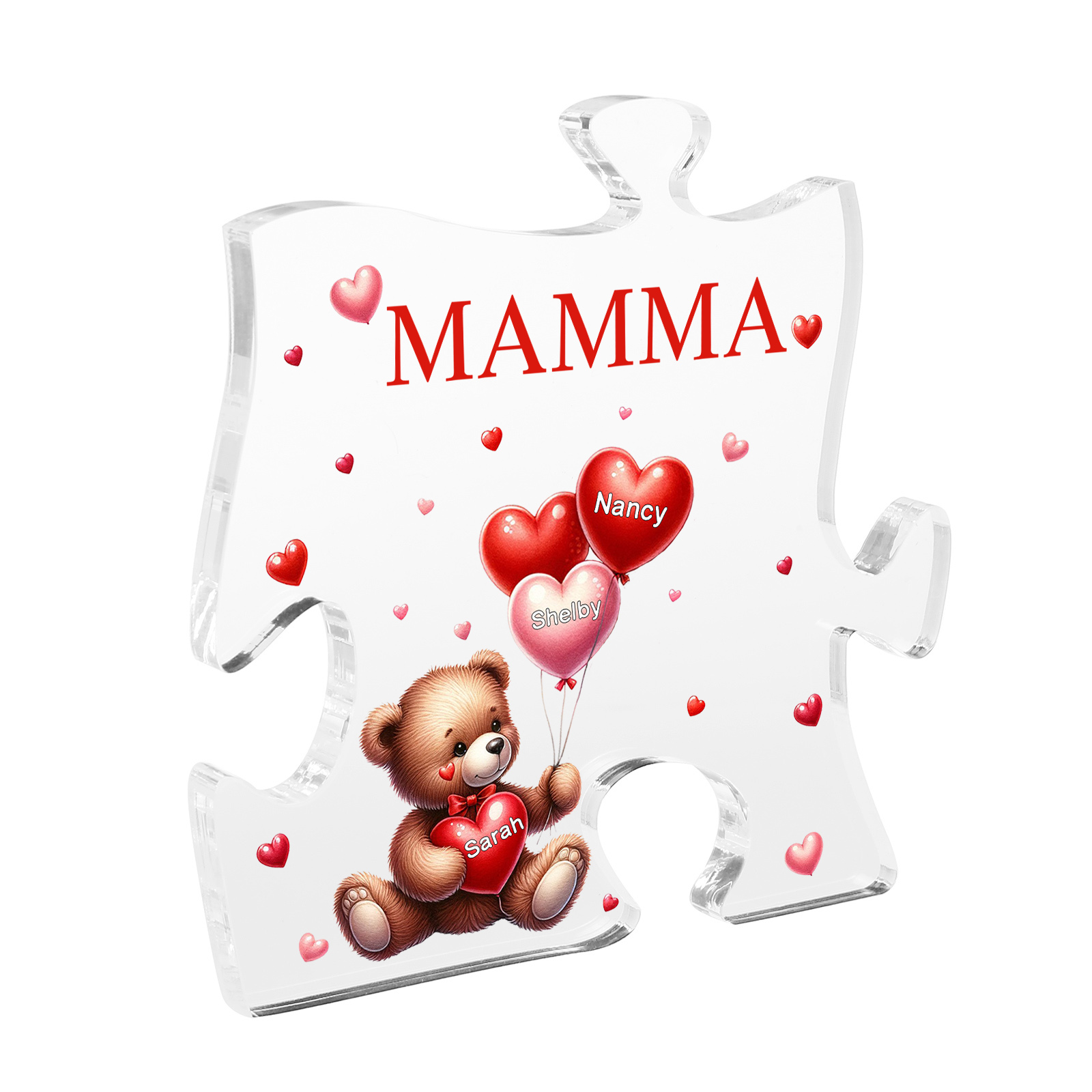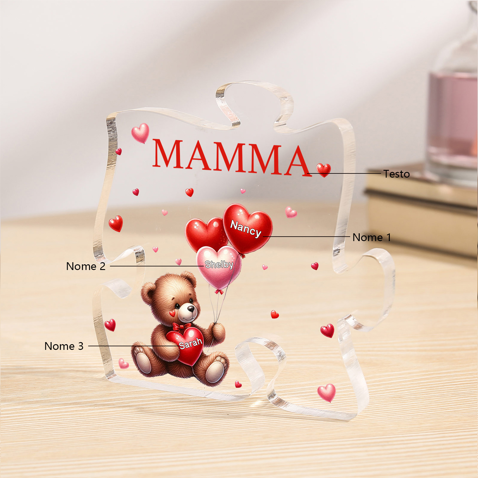 Decorazione acrilica a forma di puzzle con orsacchiotto e 3 nomi e 1 testo personalizzati per mamma/nonna