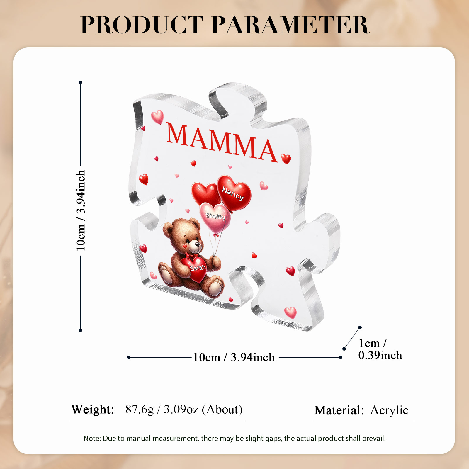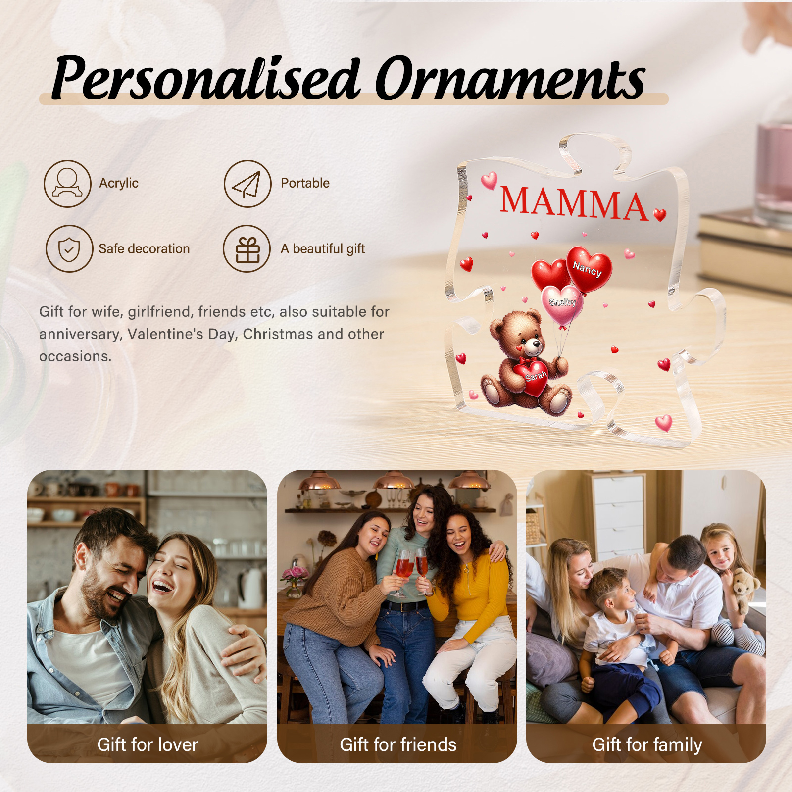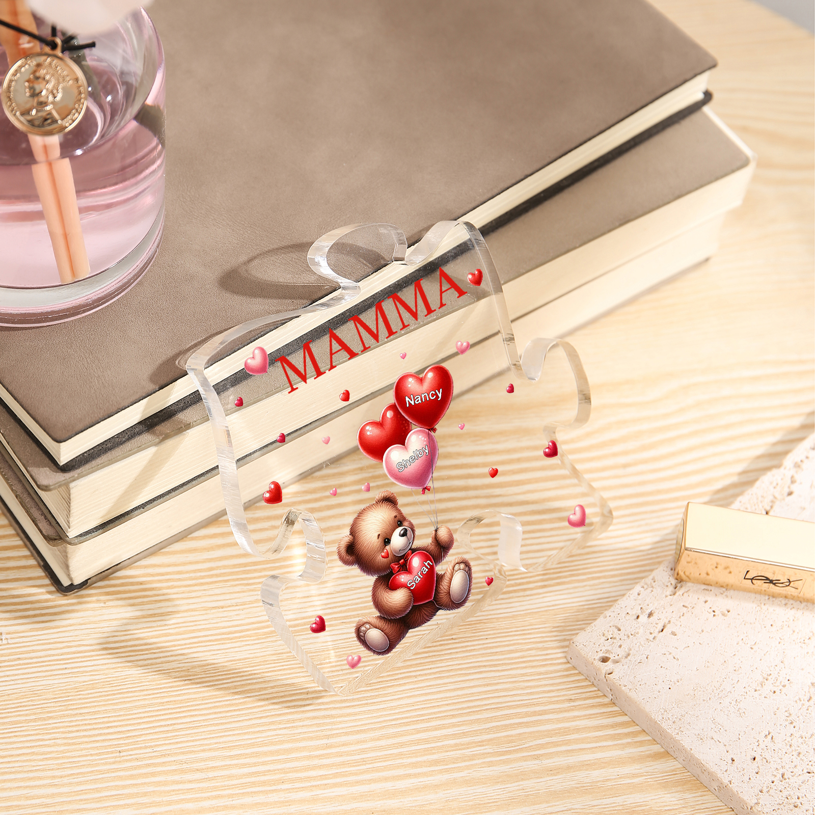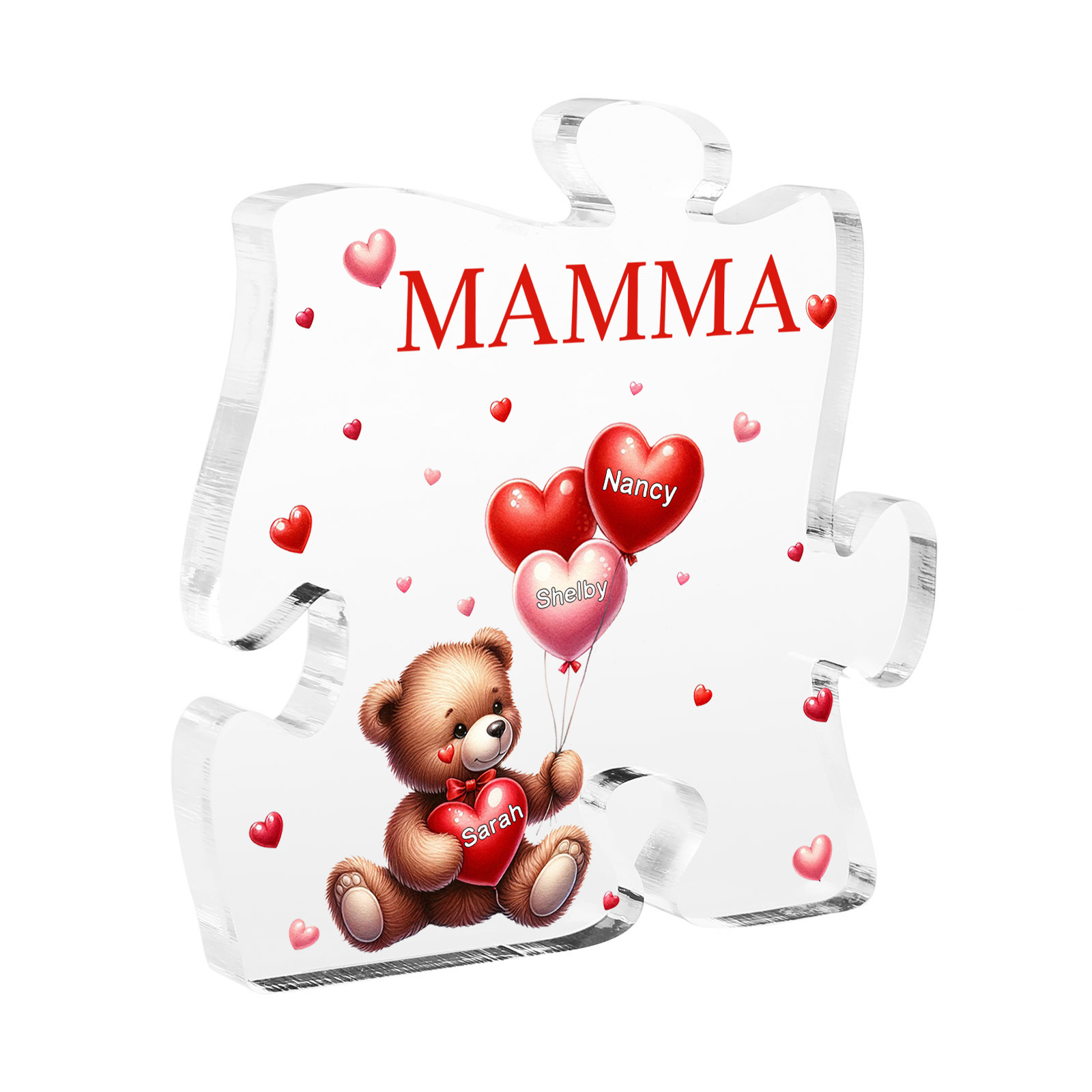 Decorazione acrilica a forma di puzzle con orsacchiotto e 3 nomi e 1 testo personalizzati per mamma/nonna