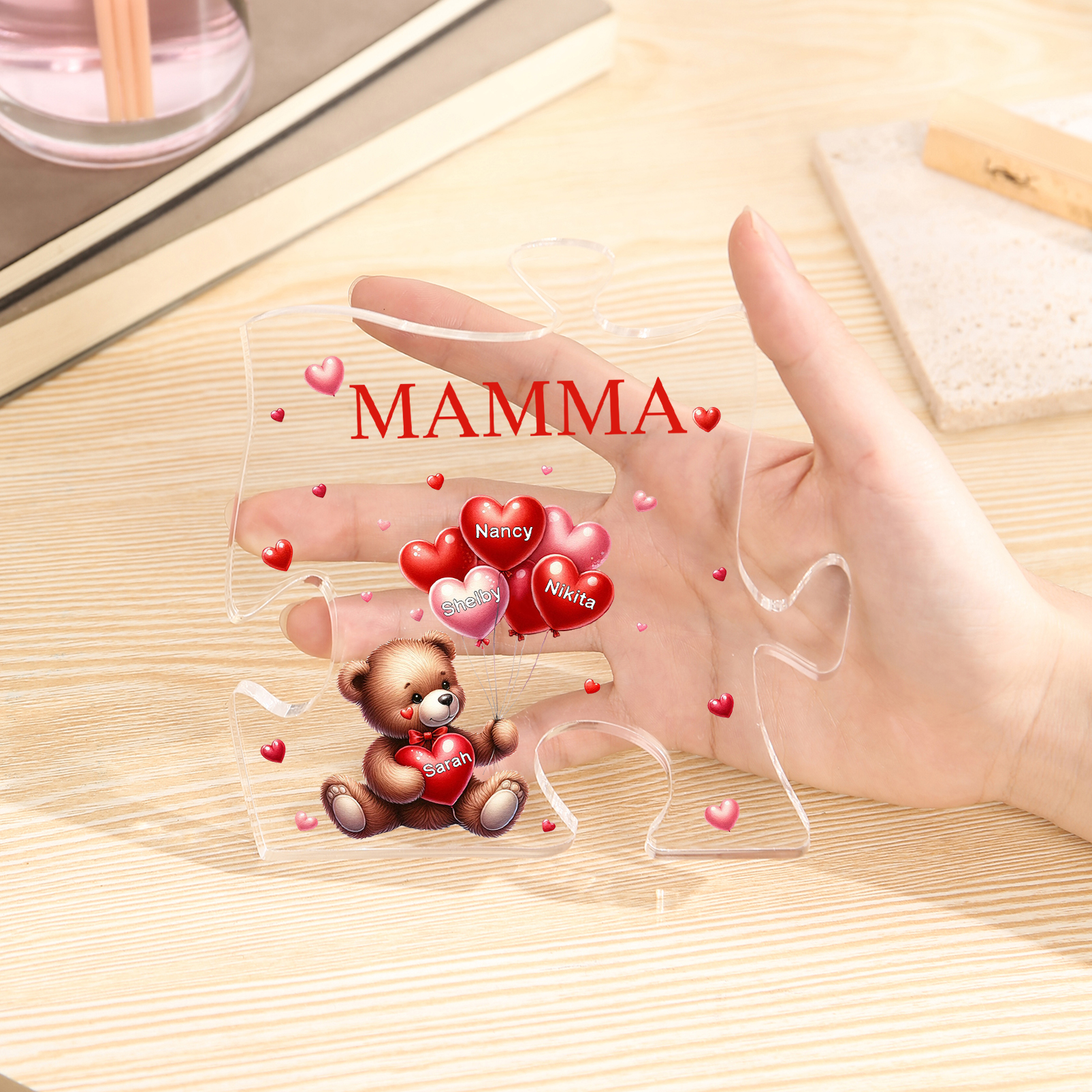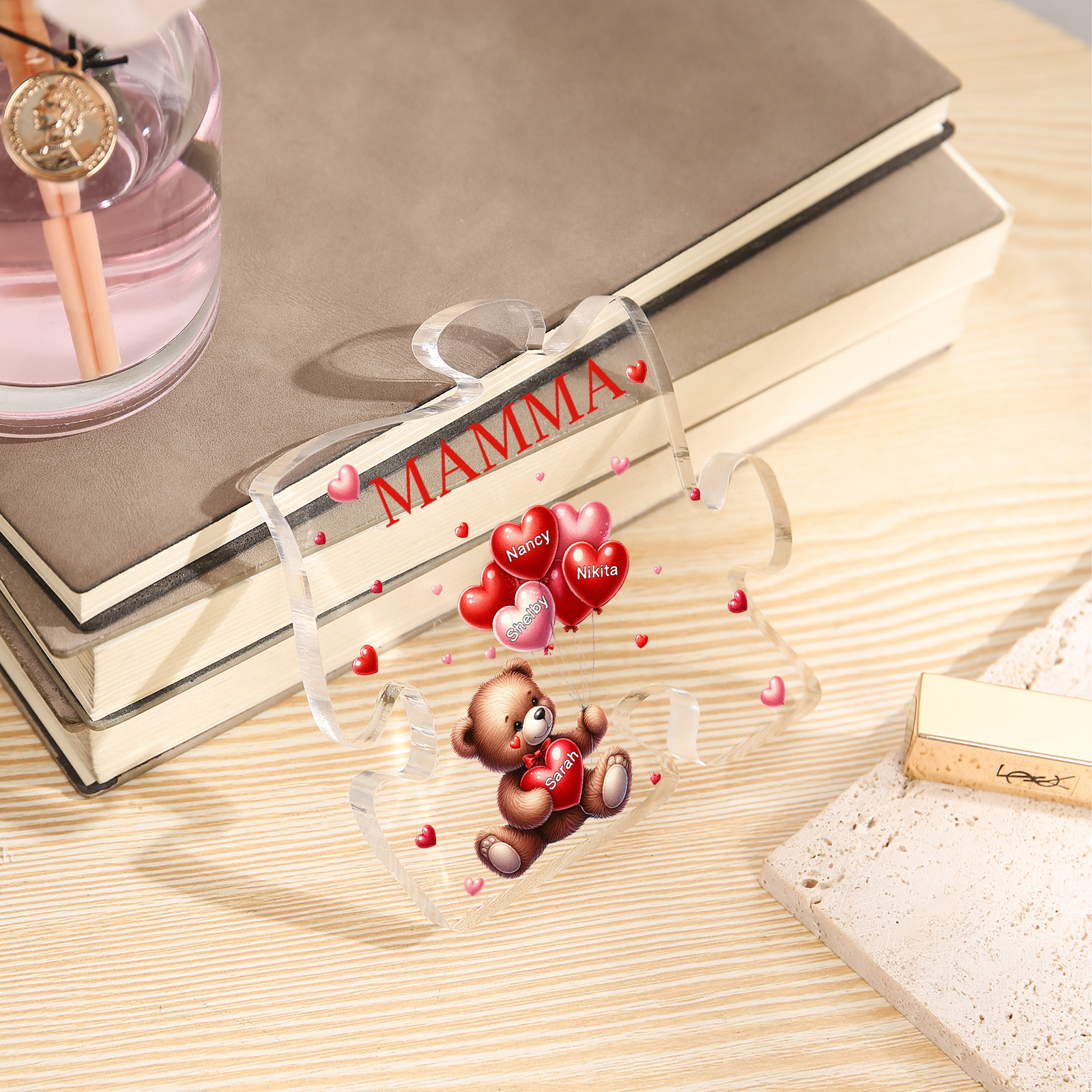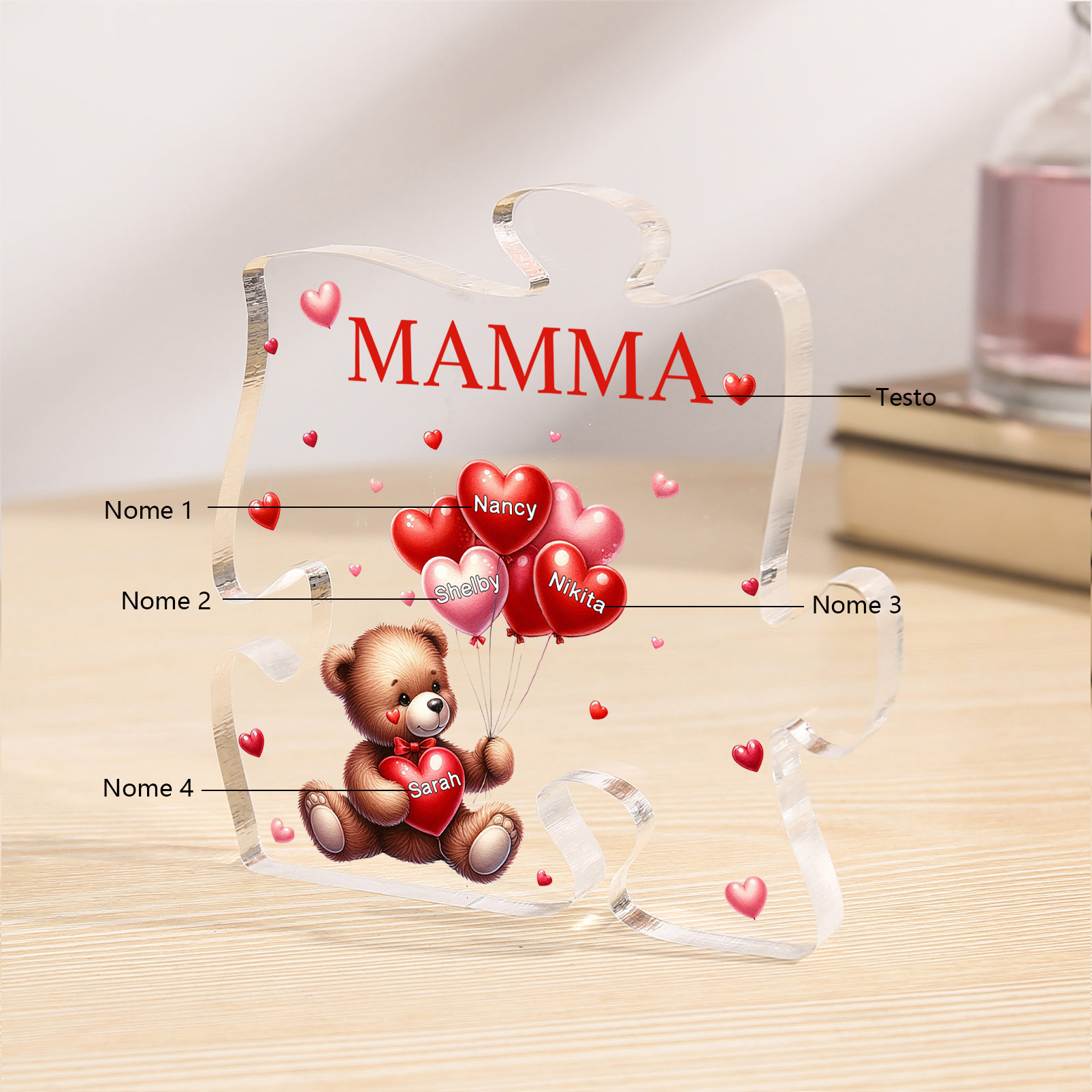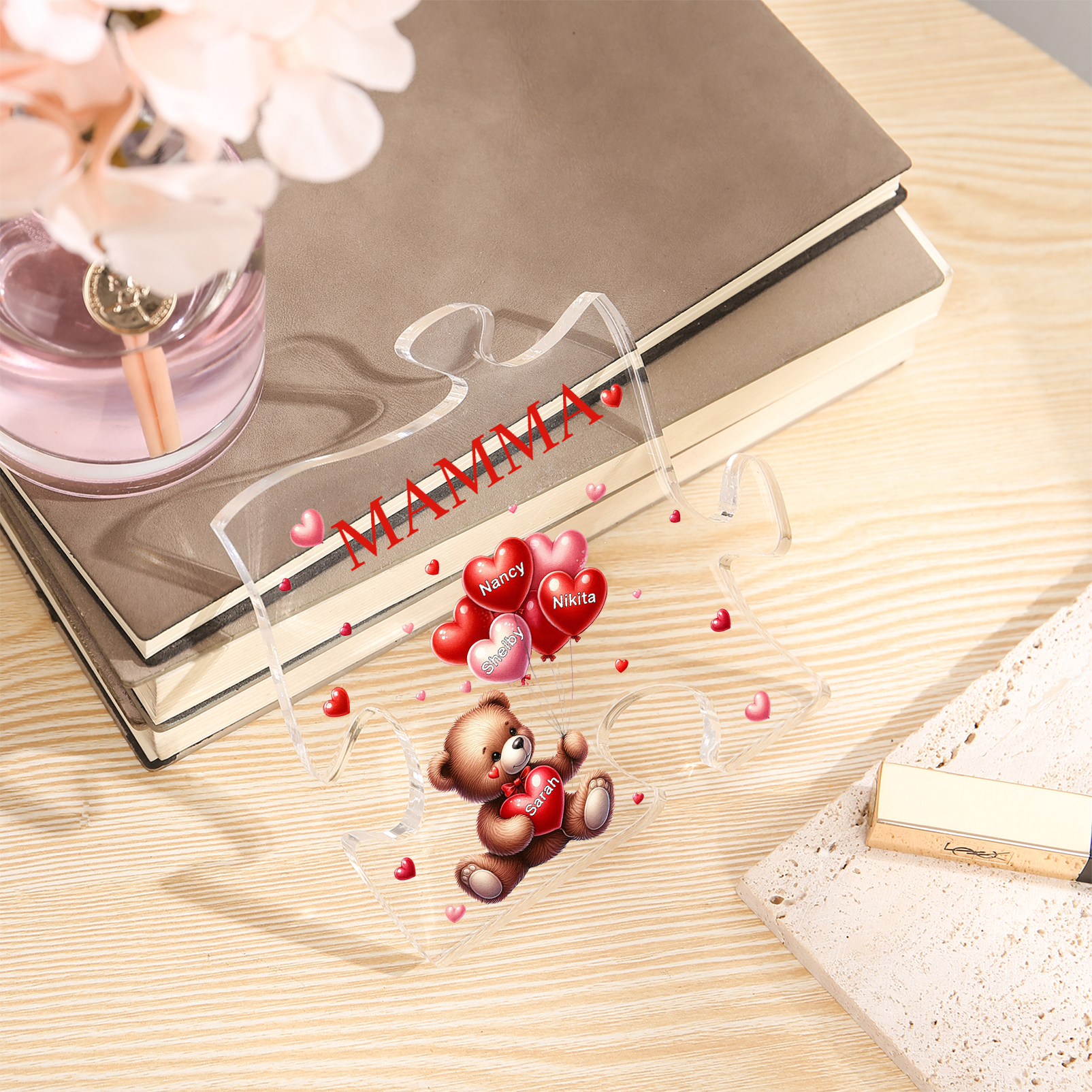Decorazione acrilica a forma di puzzle con orsacchiotto e 4 nomi e 1 testo personalizzati per mamma/nonna