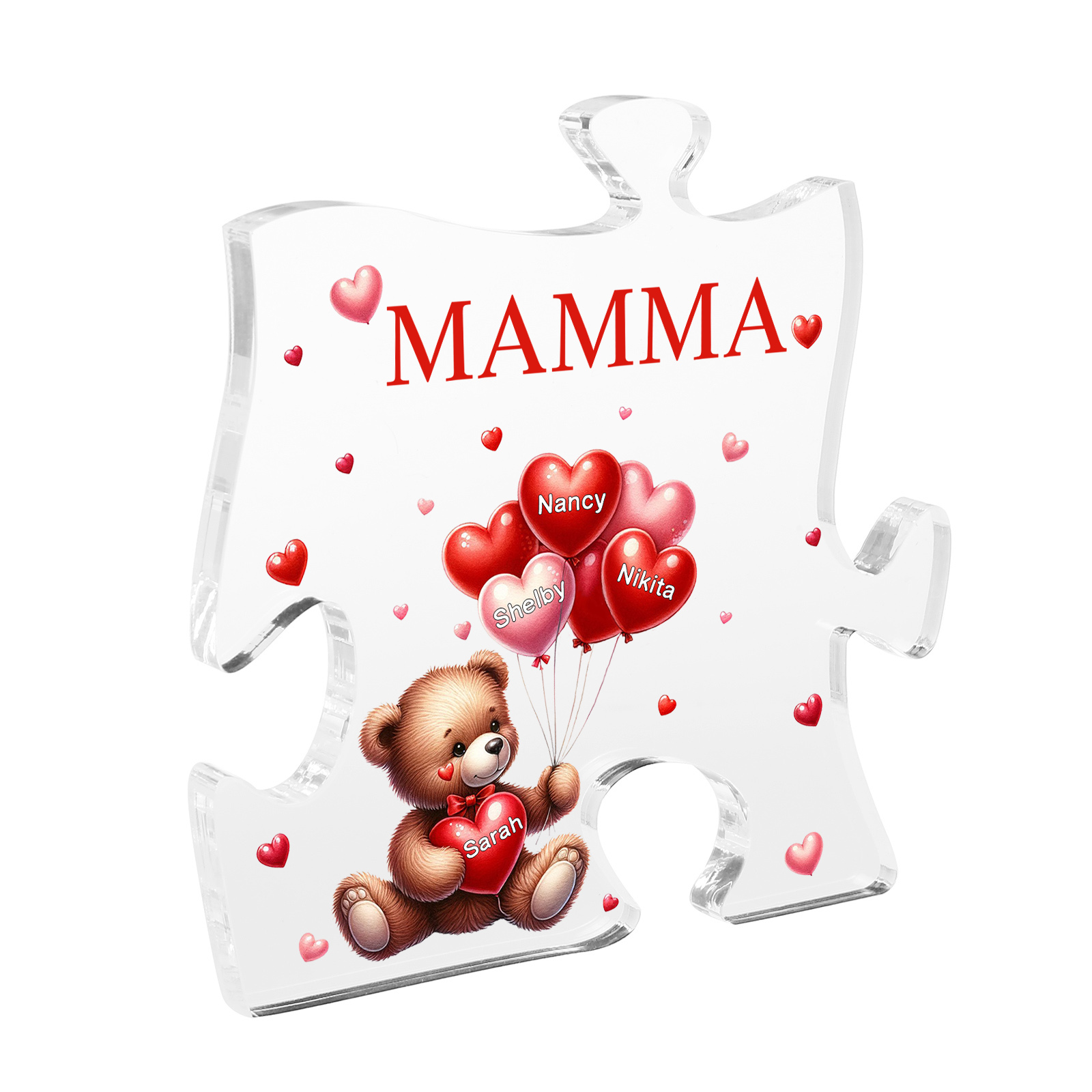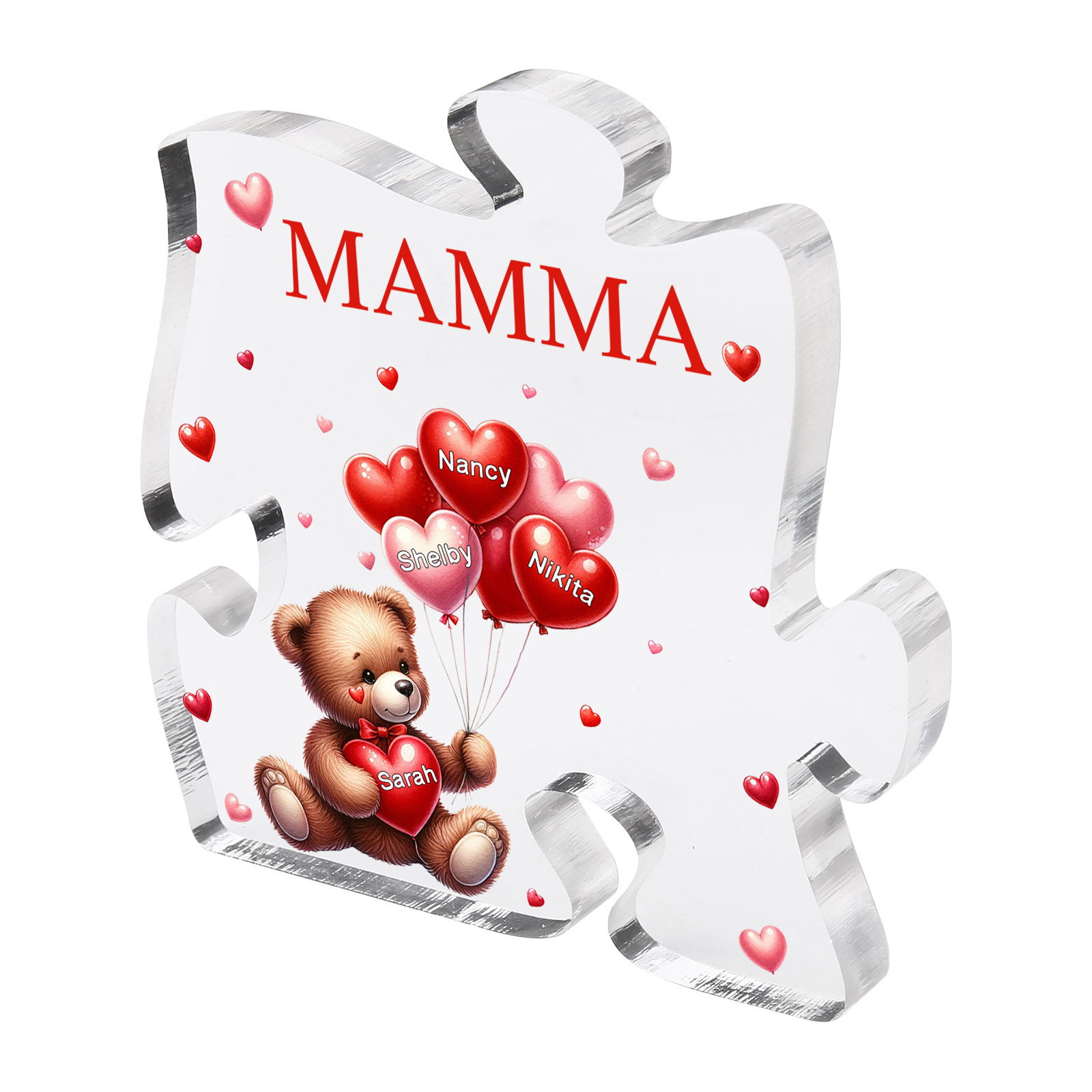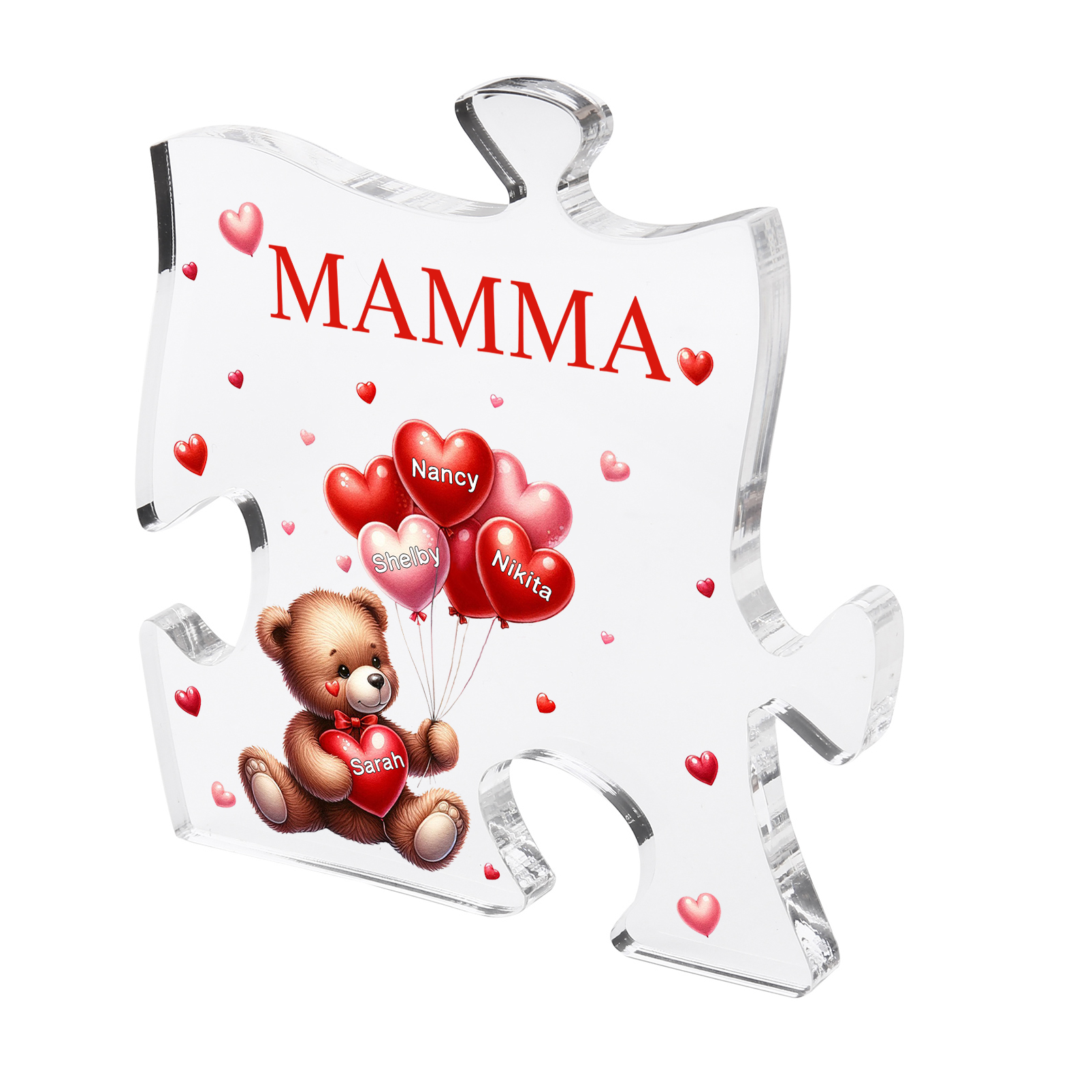 Decorazione acrilica a forma di puzzle con orsacchiotto e 4 nomi e 1 testo personalizzati per mamma/nonna