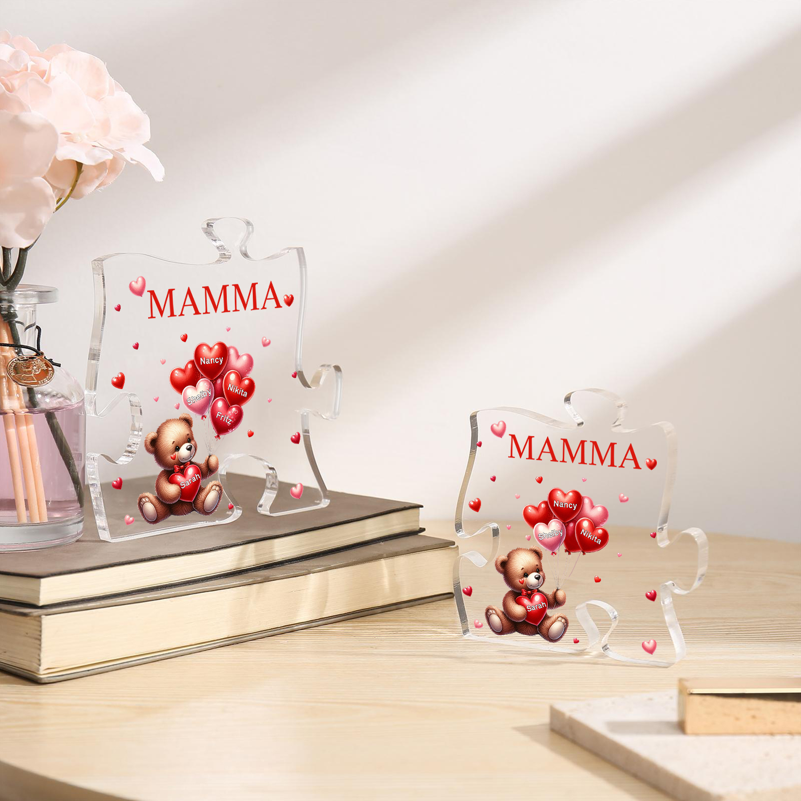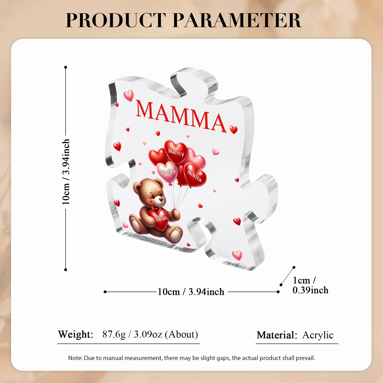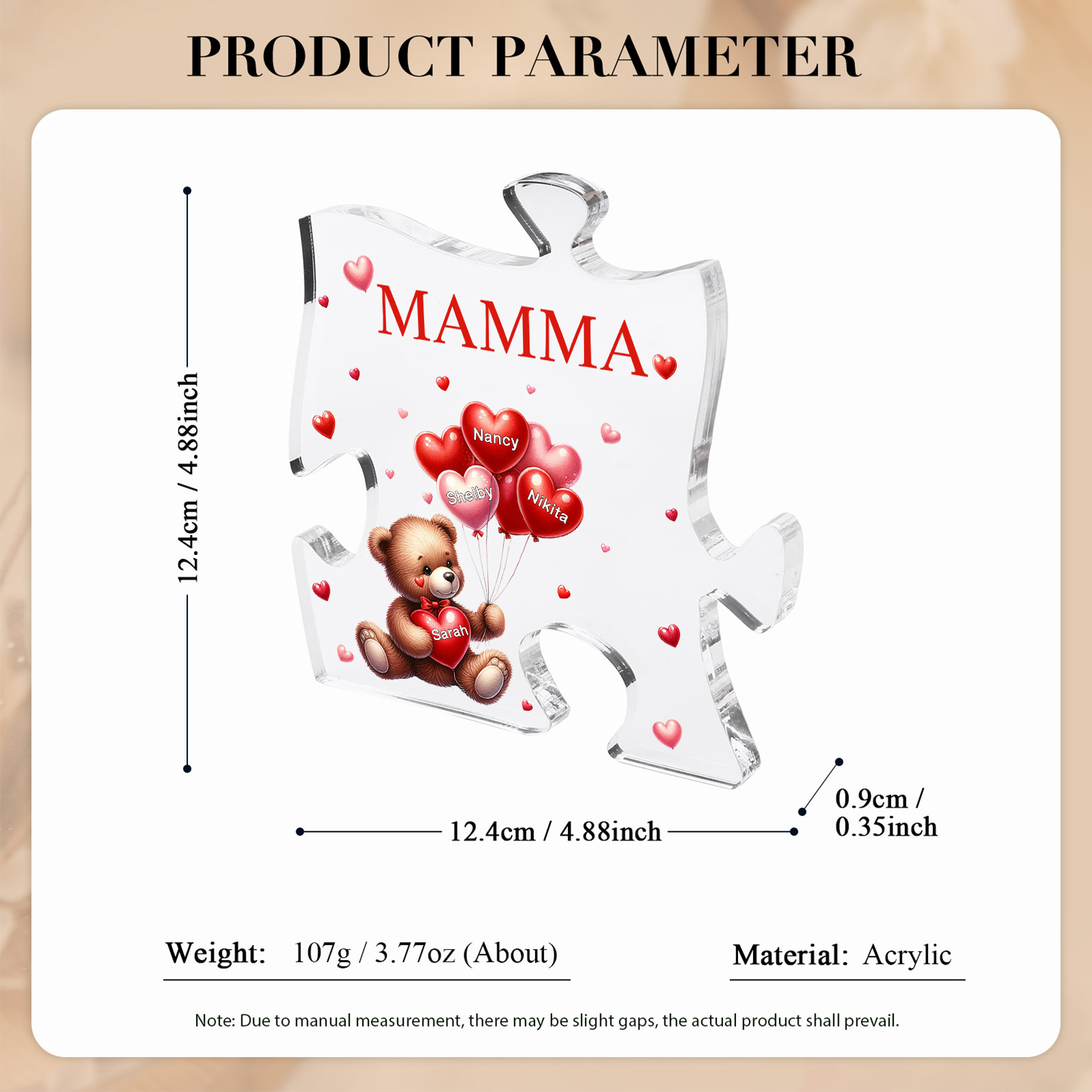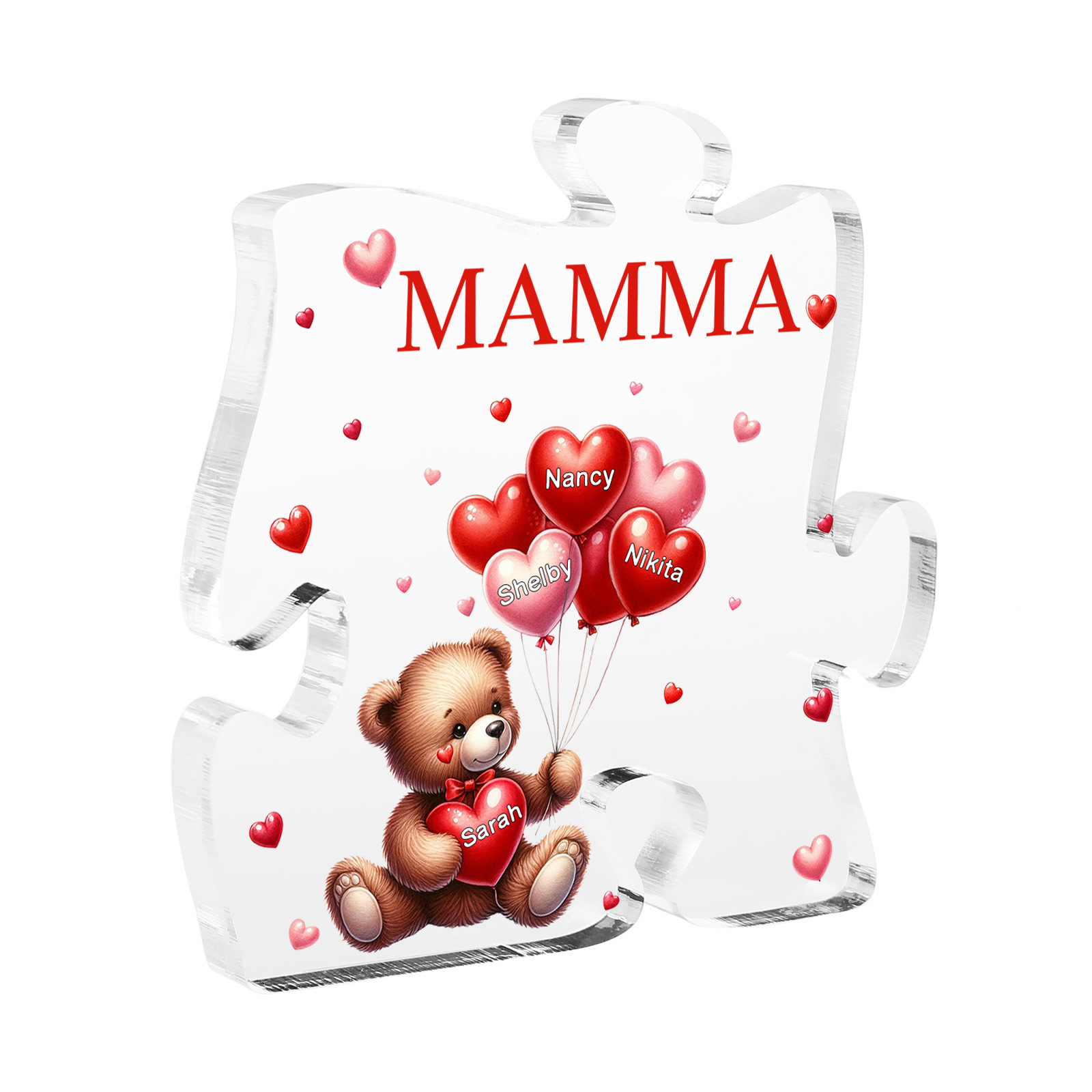 Decorazione acrilica a forma di puzzle con orsacchiotto e 4 nomi e 1 testo personalizzati per mamma/nonna