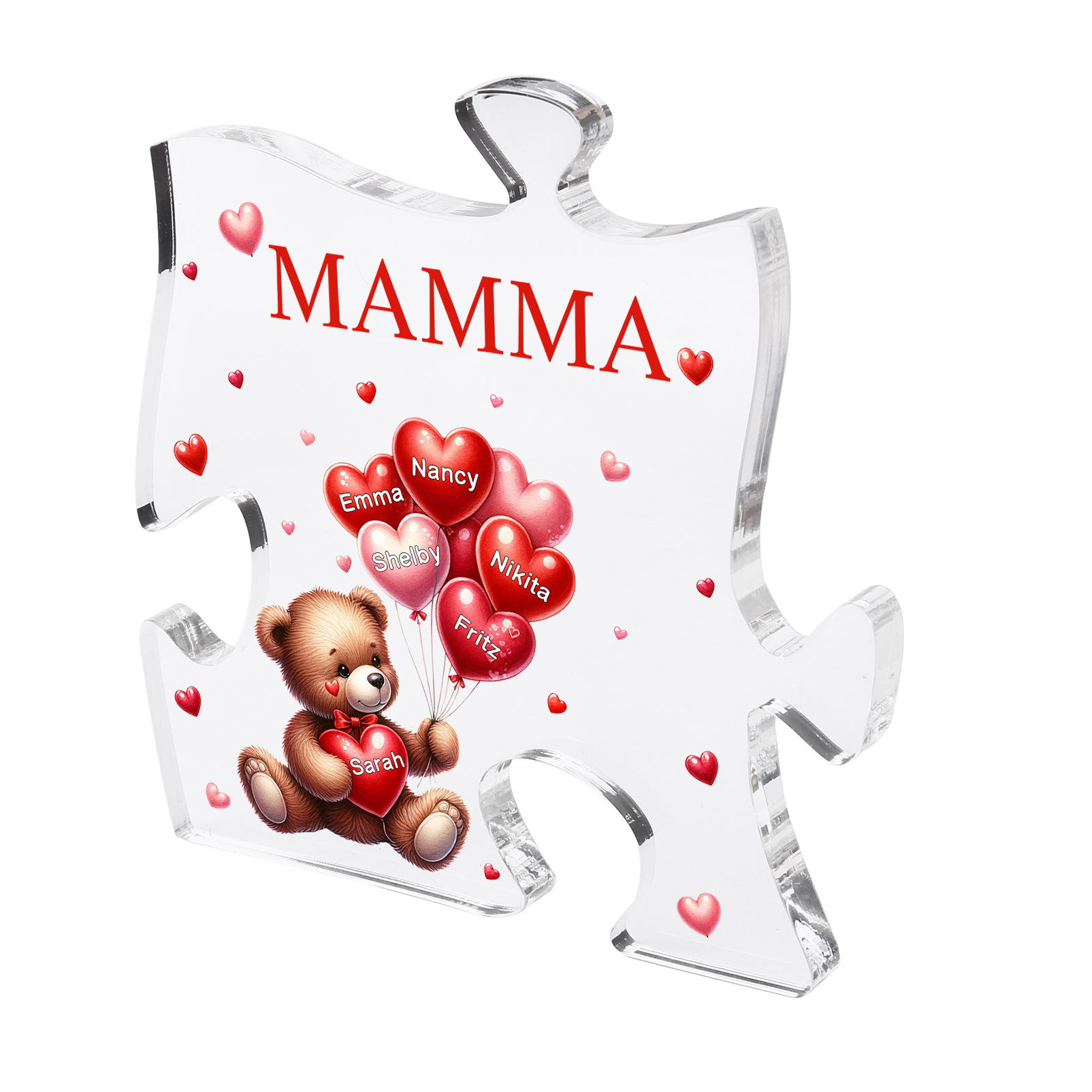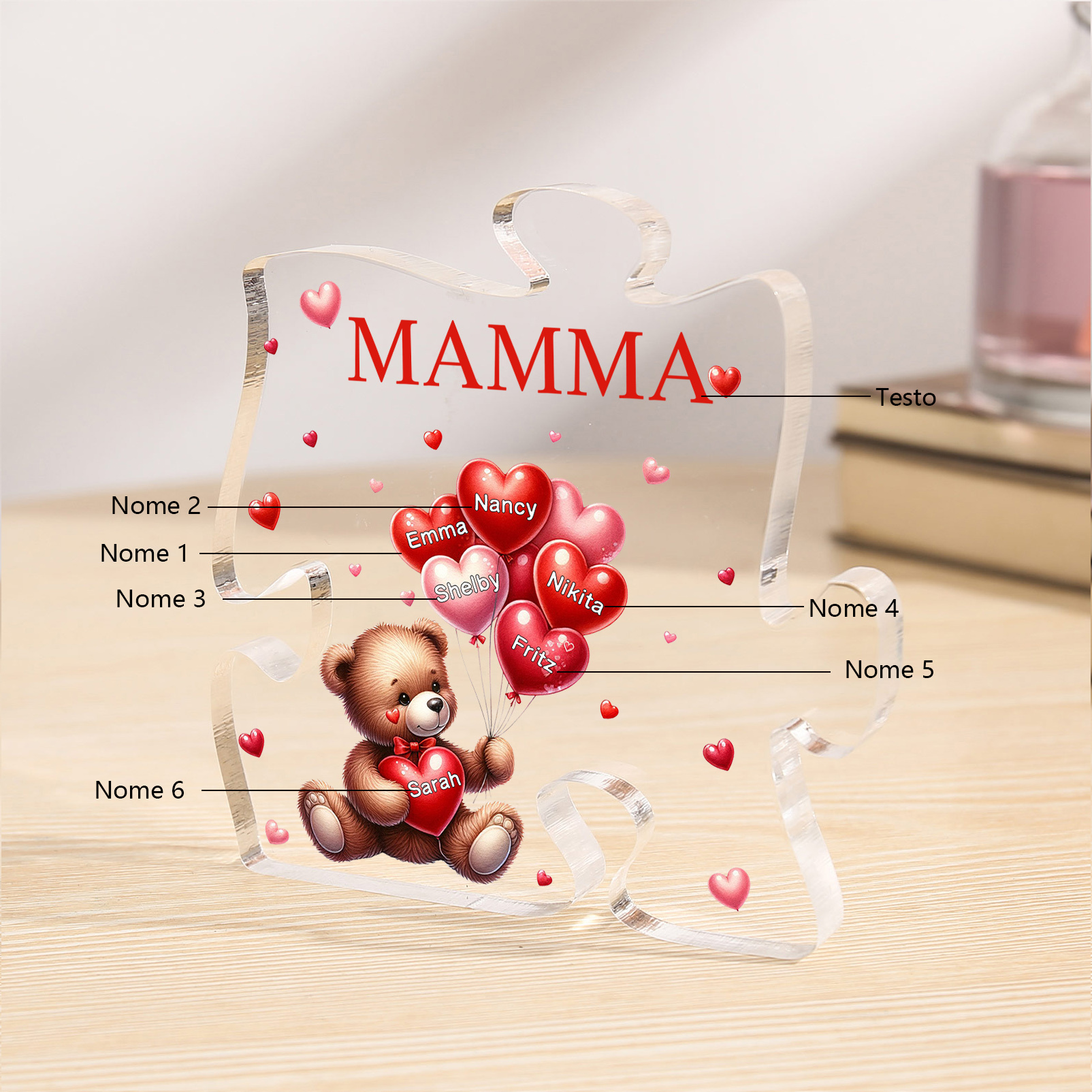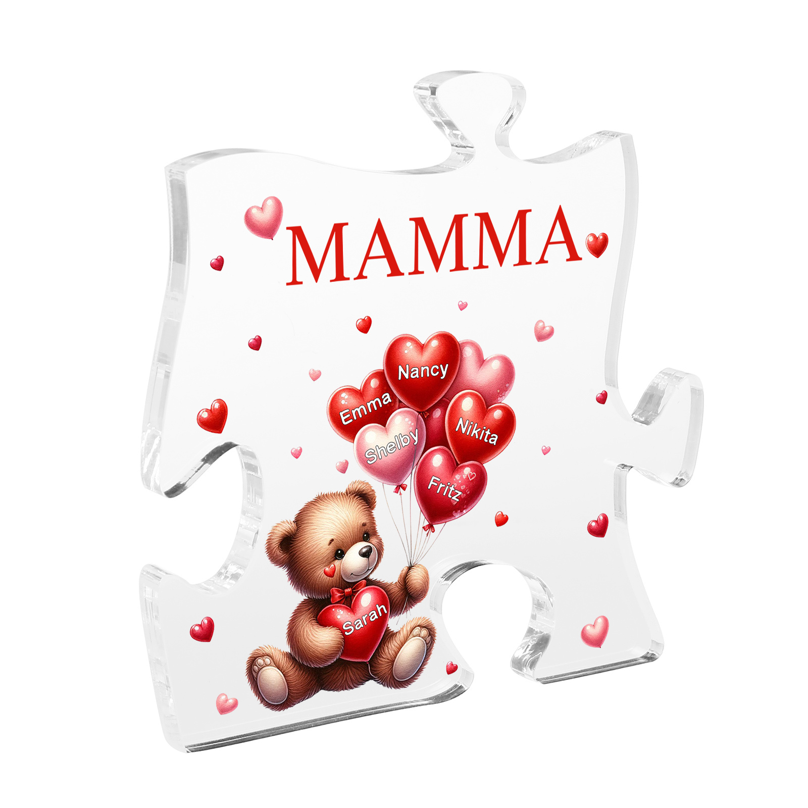 Decorazione acrilica a forma di puzzle con orsacchiotto e 6 nomi e 1 testo personalizzati per mamma/nonna
