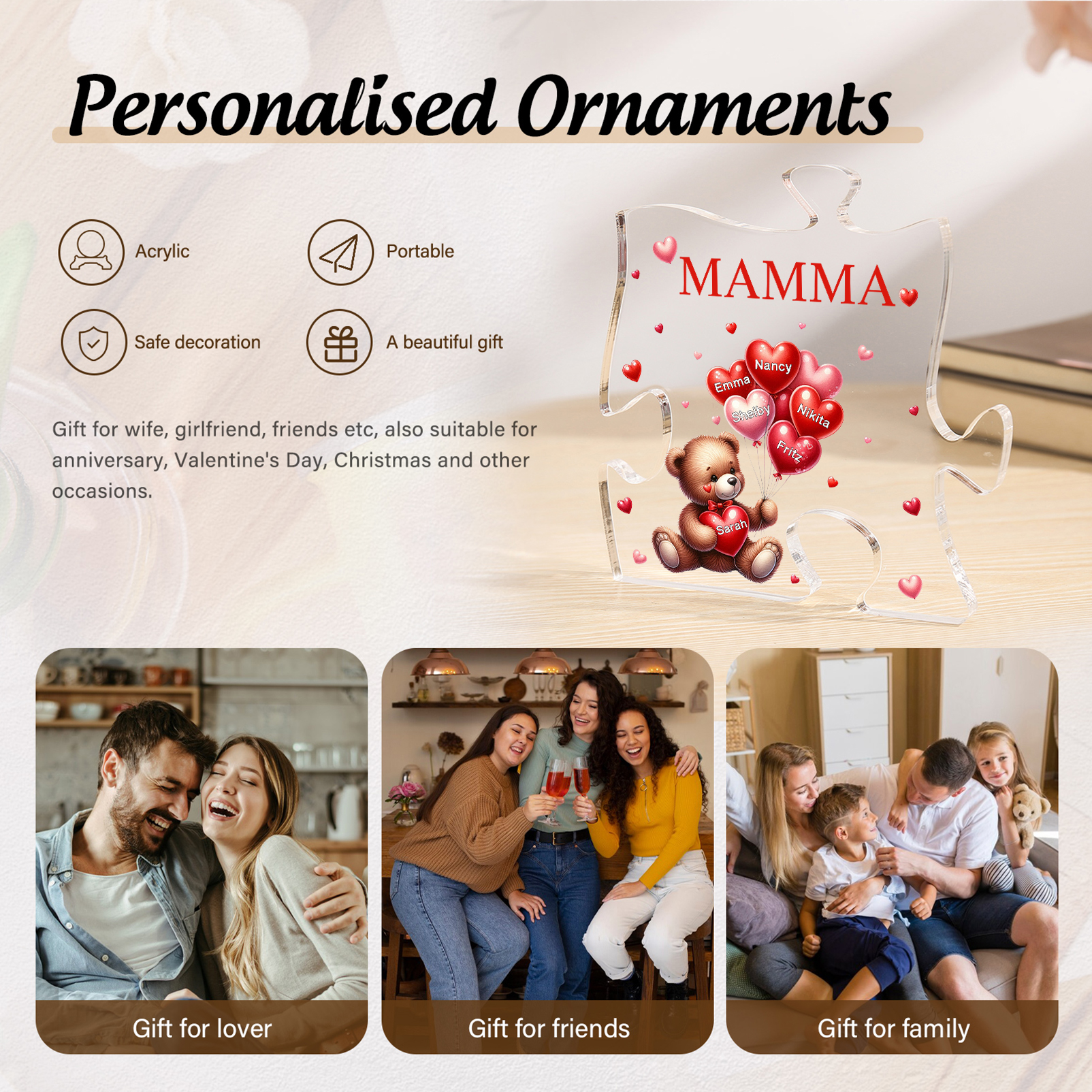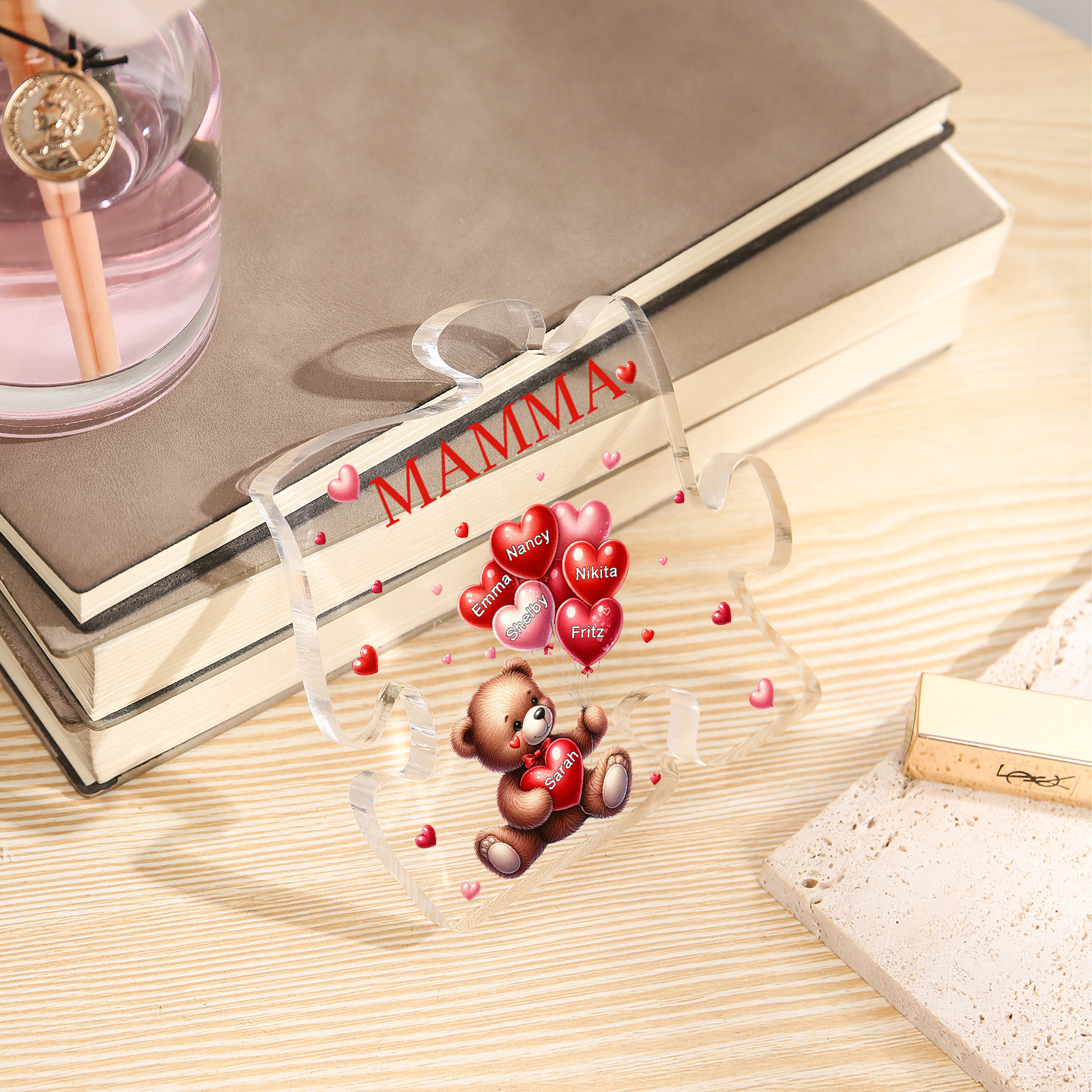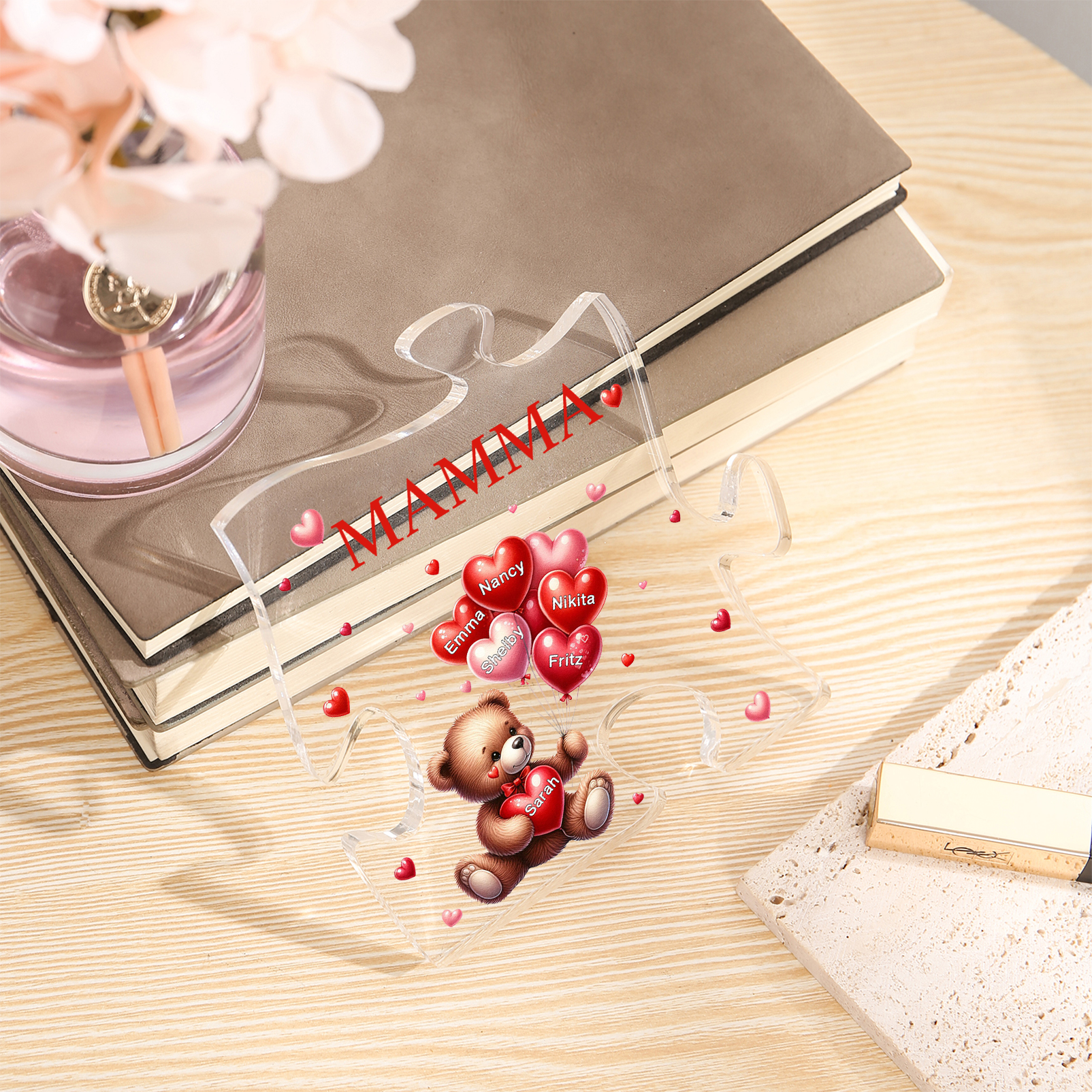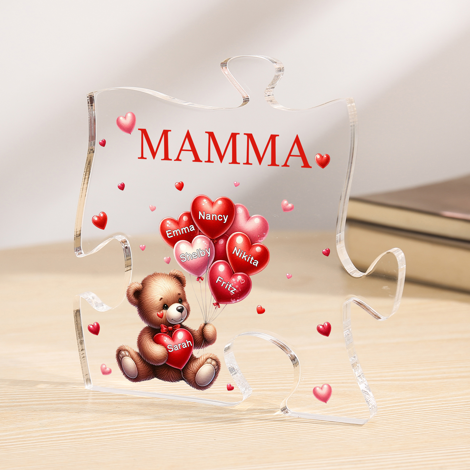 Decorazione acrilica a forma di puzzle con orsacchiotto e 6 nomi e 1 testo personalizzati per mamma/nonna