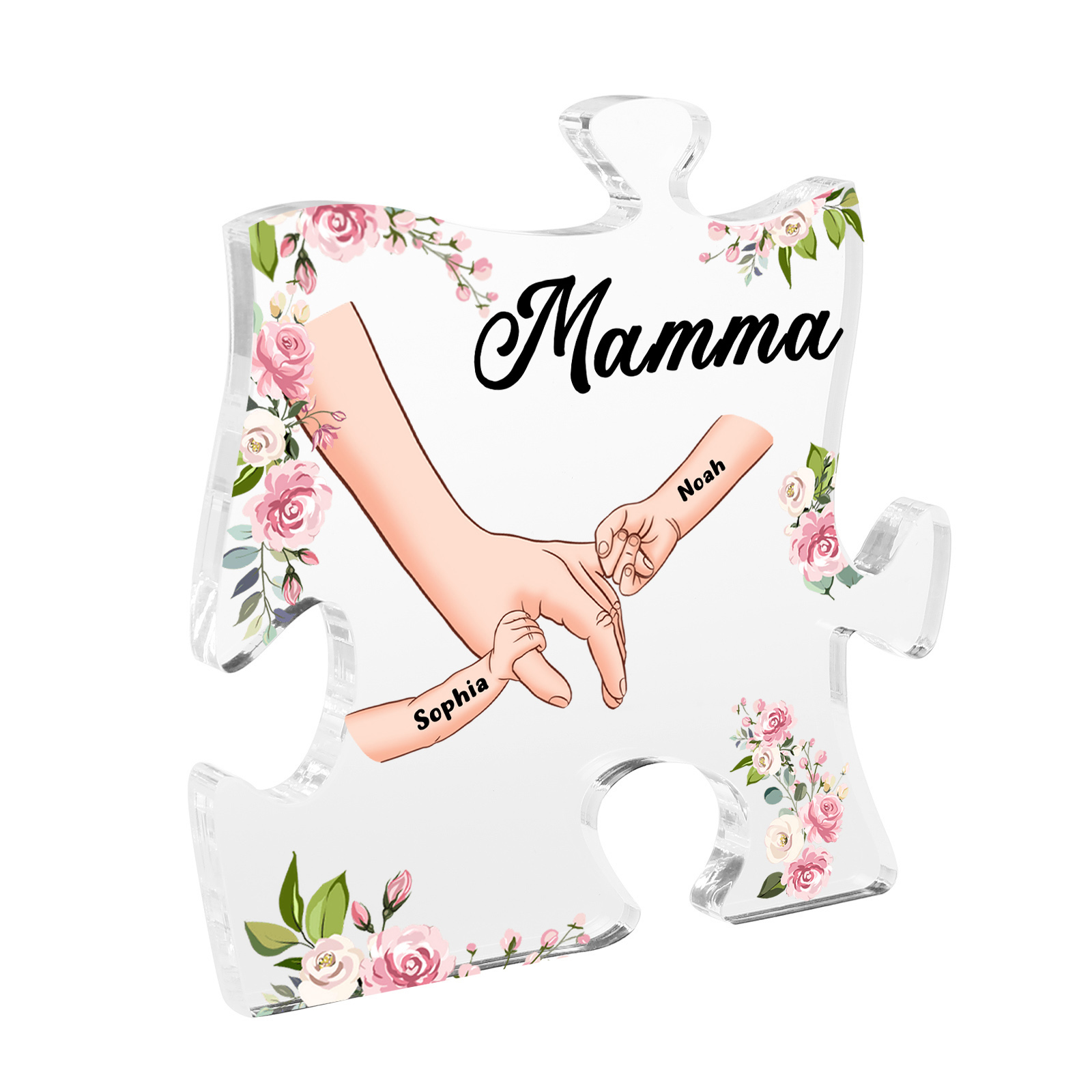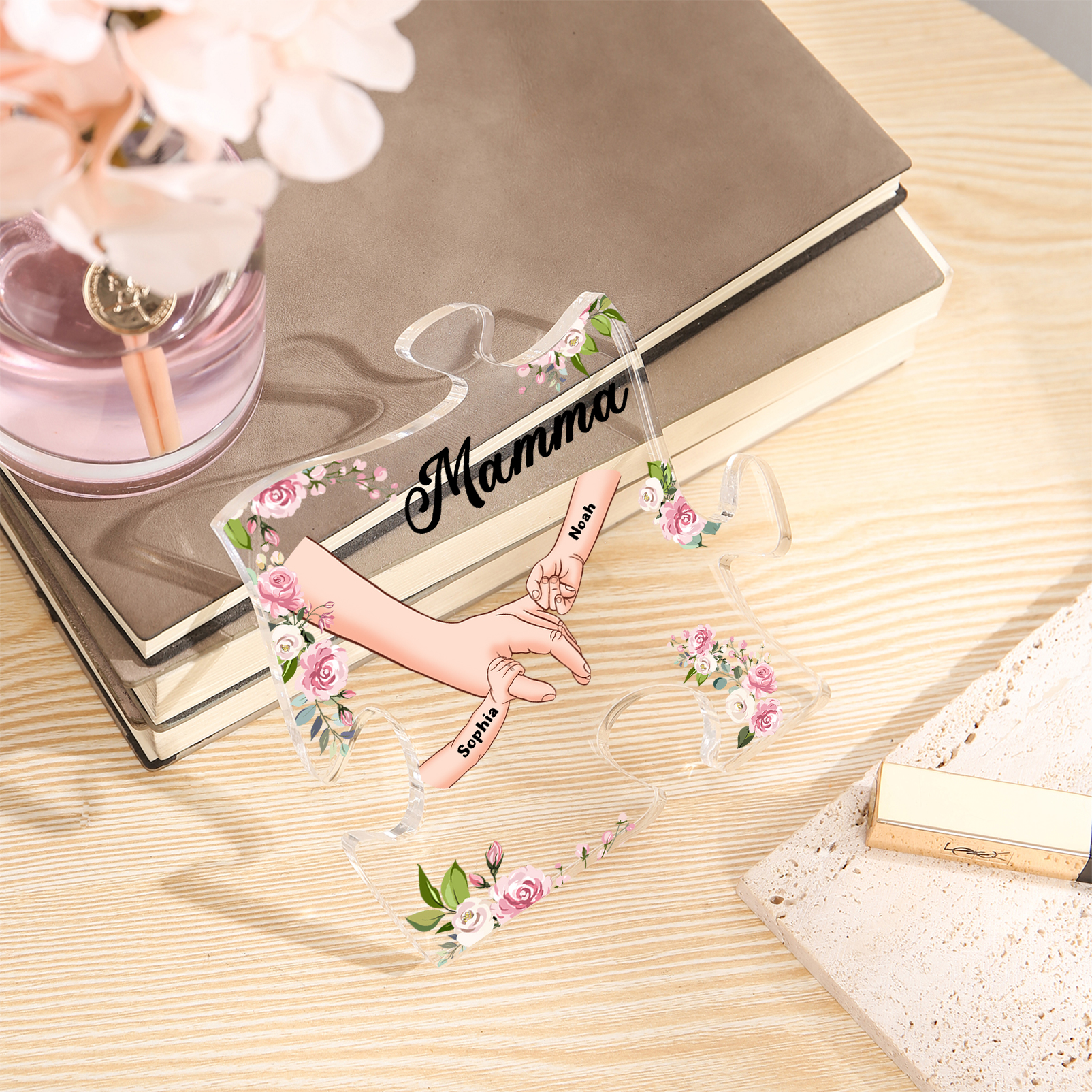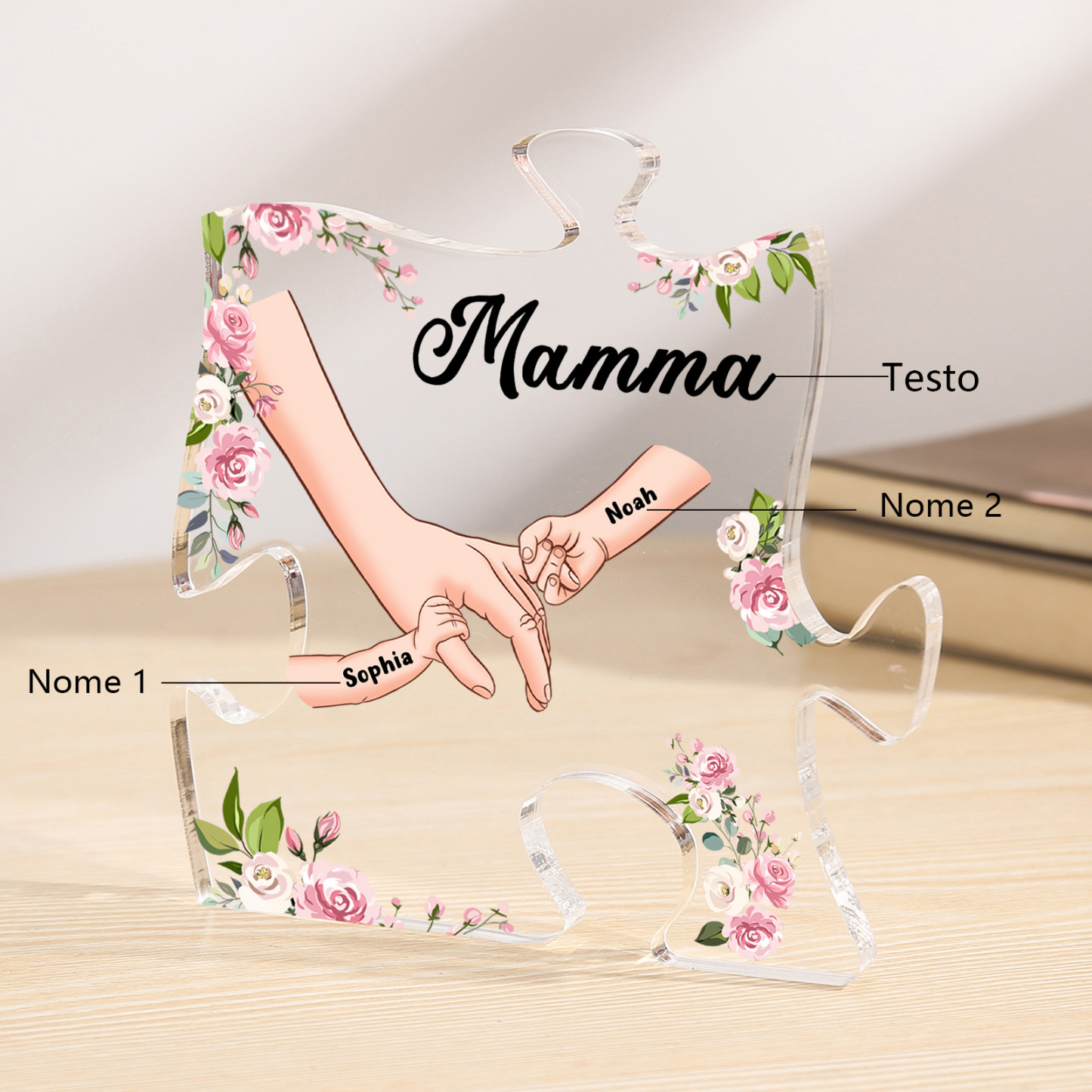 Decorazione acrilica a forma di puzzle mano nella mano 2 nomi e 1 testo personalizzati per mamma/nonna