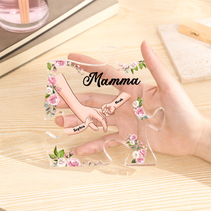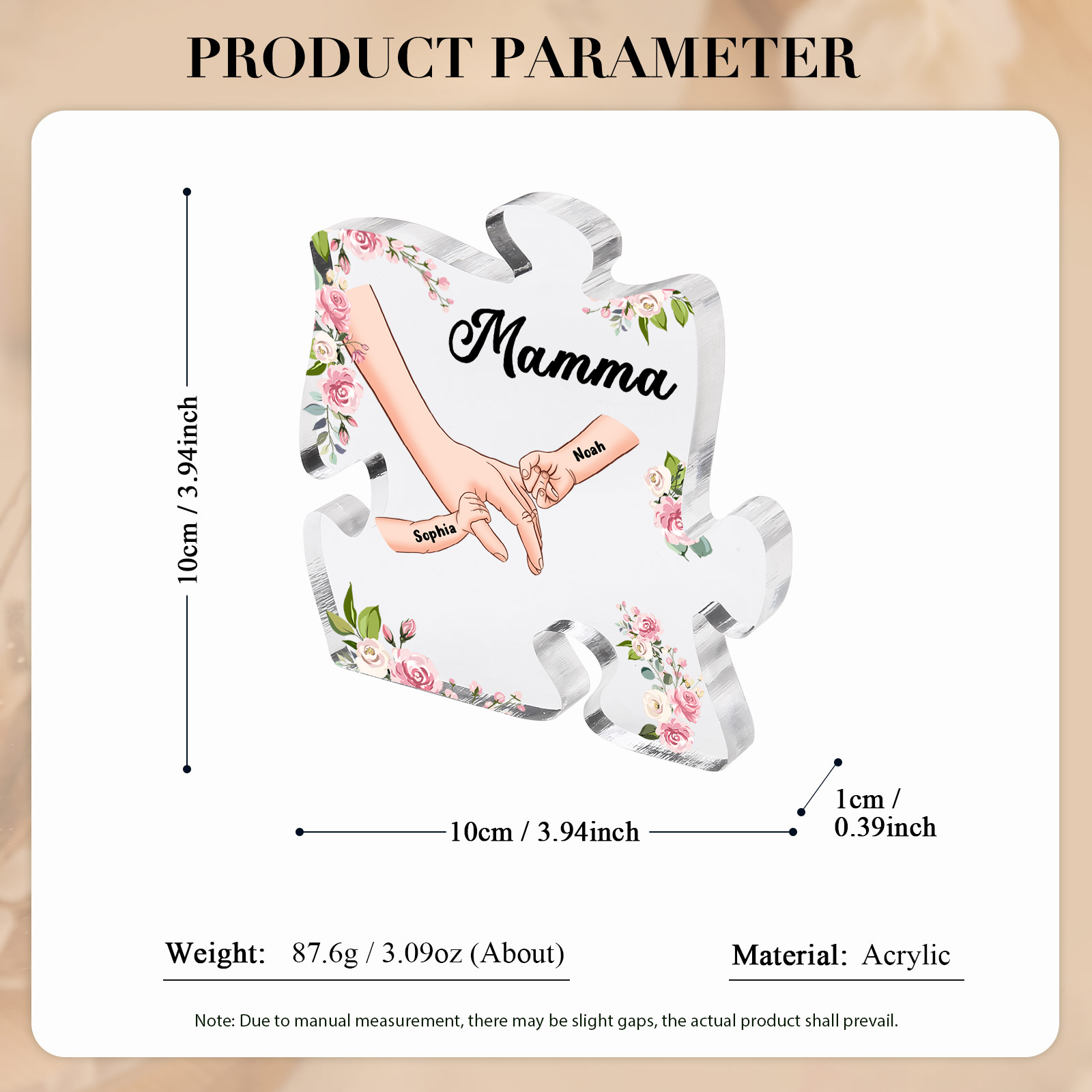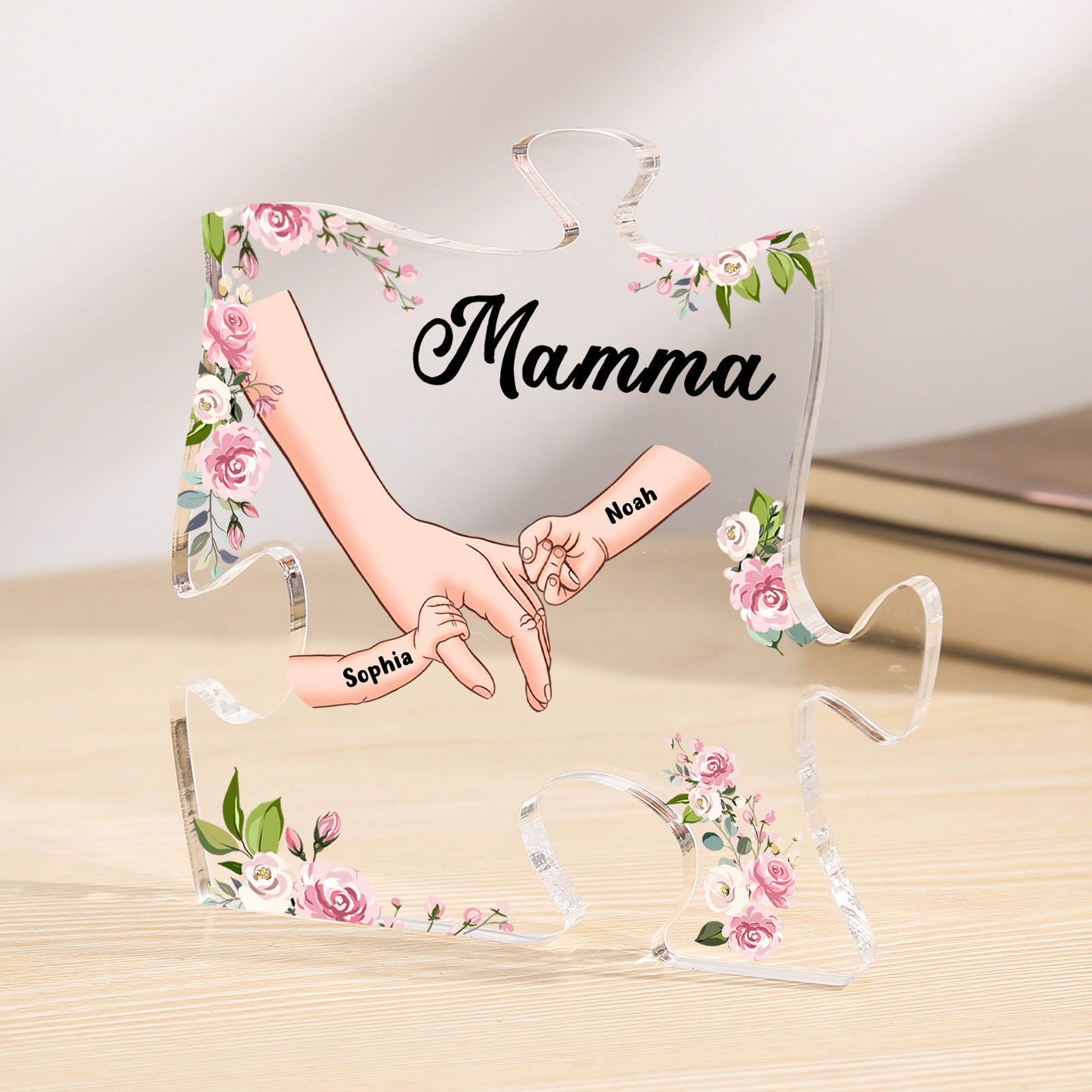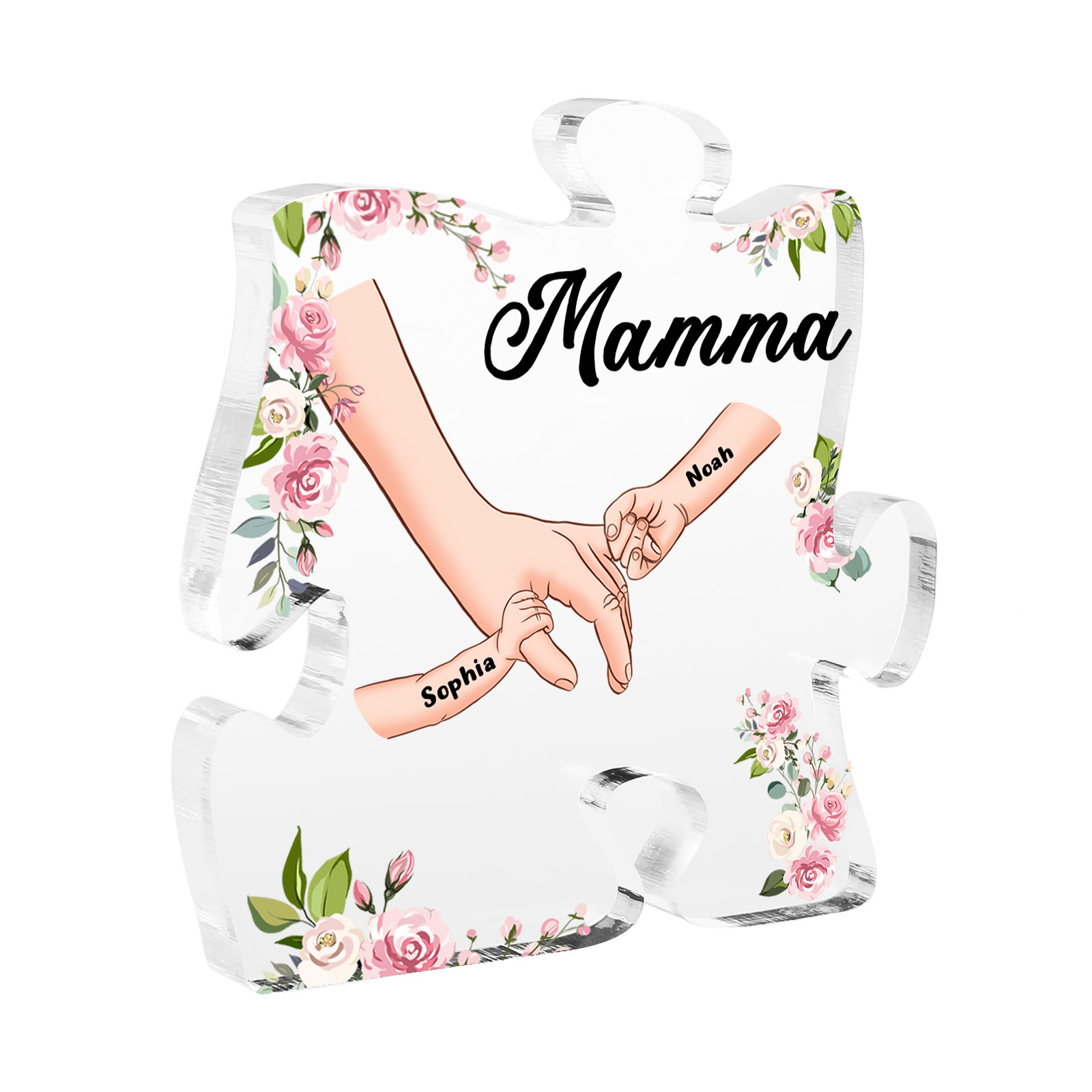 Decorazione acrilica a forma di puzzle mano nella mano 2 nomi e 1 testo personalizzati per mamma/nonna