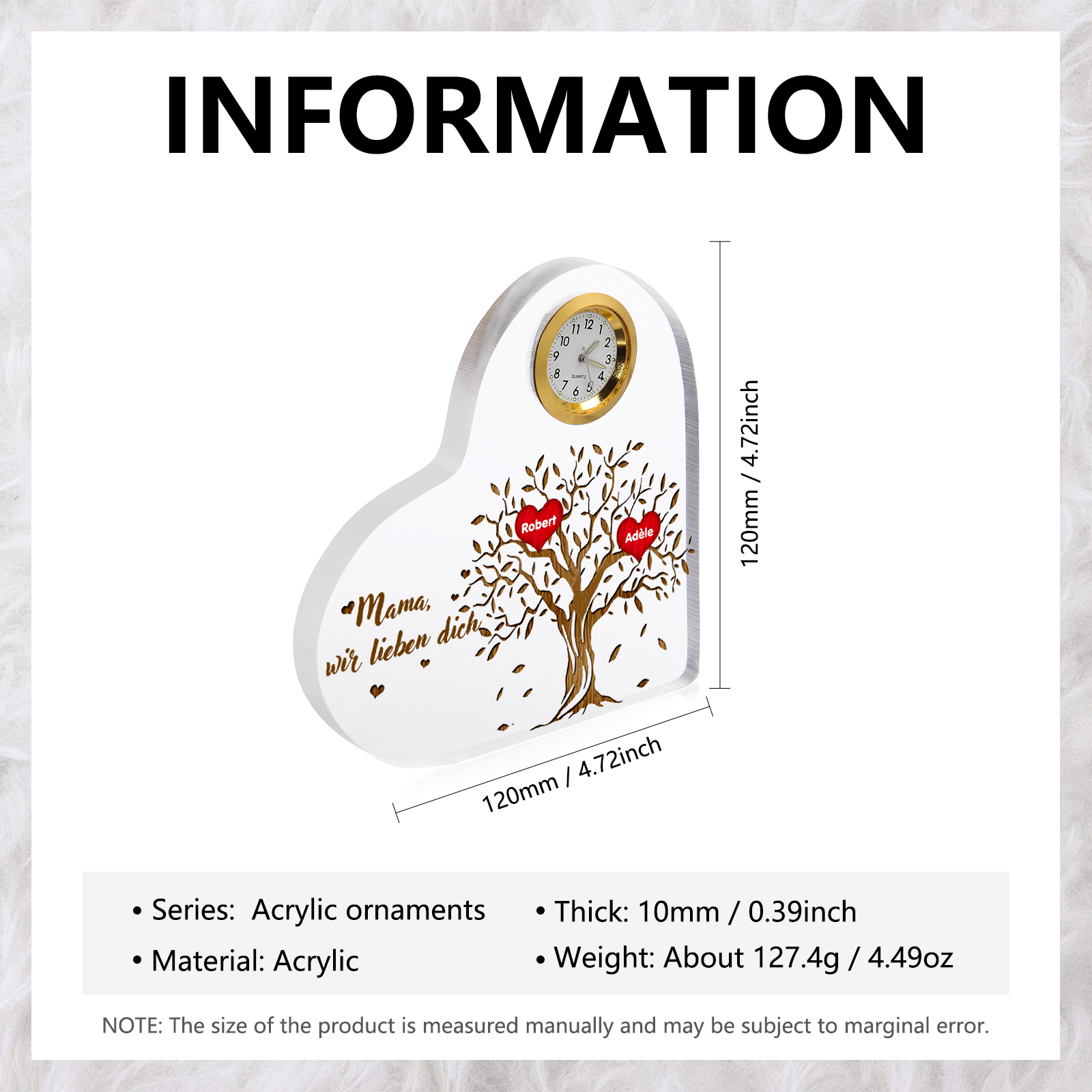 Decorazione acrilica albero di vita 2 nomi e 1 testo personalizzati con orologio regalo per mamma/nonna