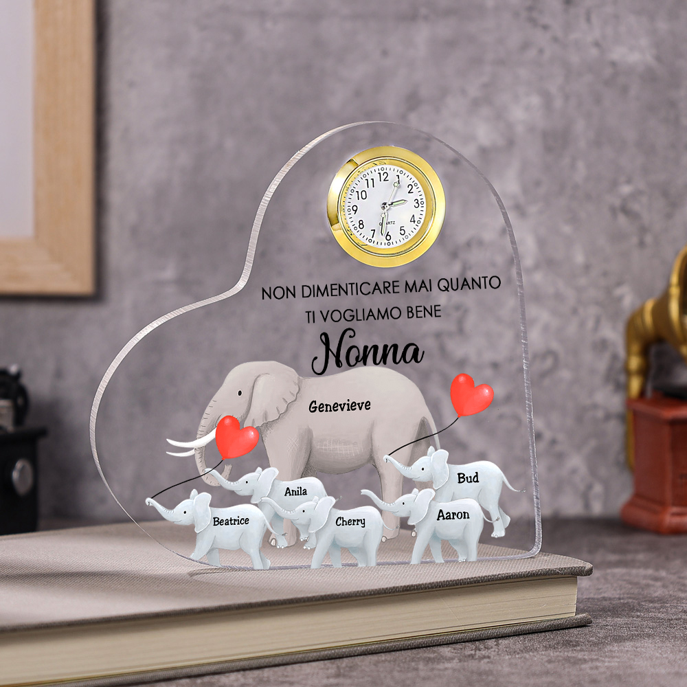 Decorazione acrilica ELEFANTI Ti Vogliamo Bene NONNA 6 nomi personalizzati con orologio