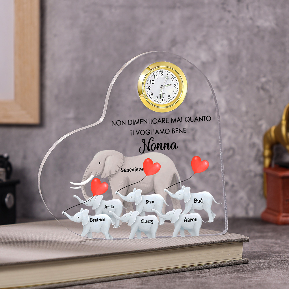 Decorazione acrilica ELEFANTI Ti Vogliamo Bene NONNA 7 nomi personalizzati con orologio