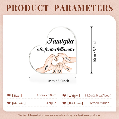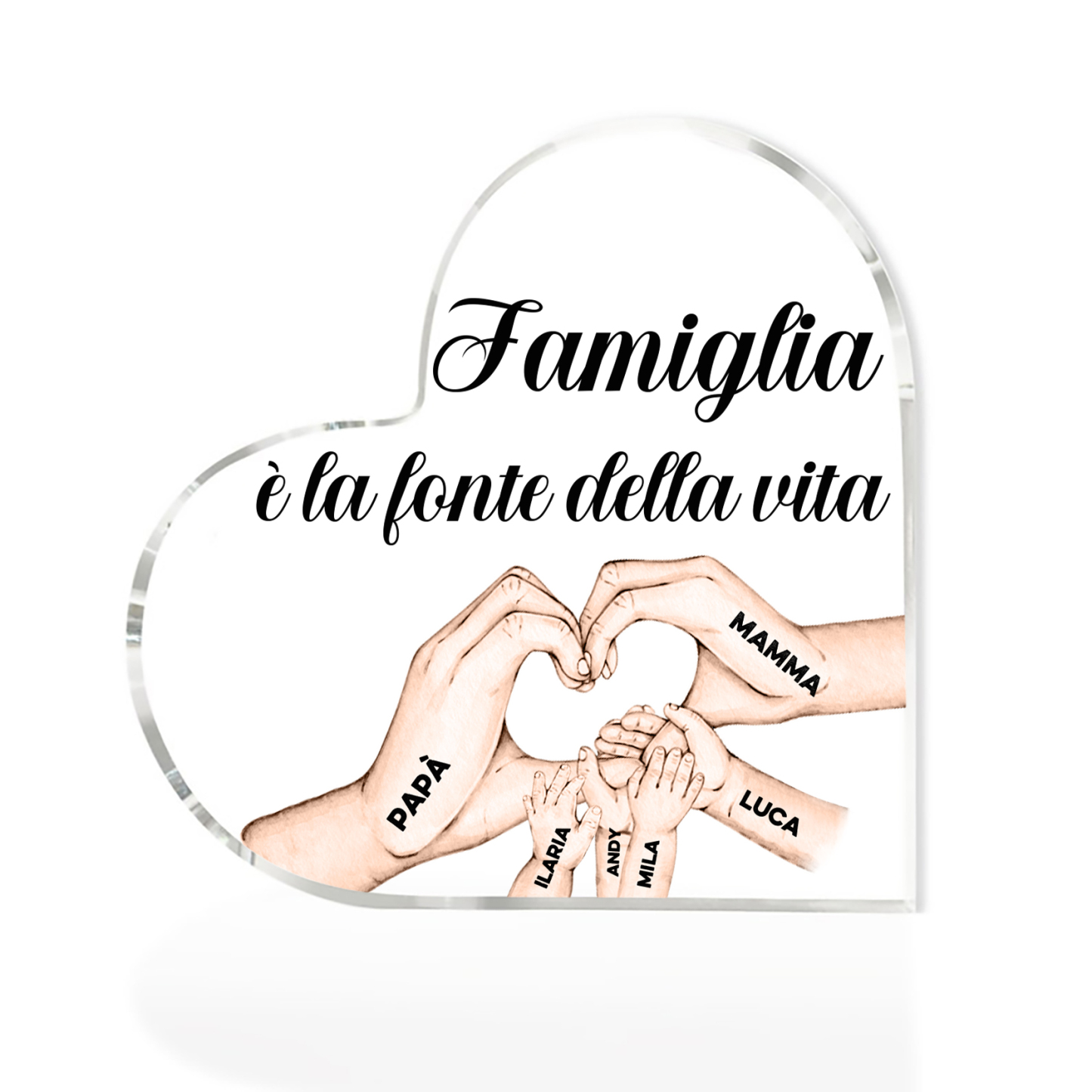 Decorazione acrilica FAMIGLIA È LA FONTE DELLA VITA con 6 mani nomi incisione