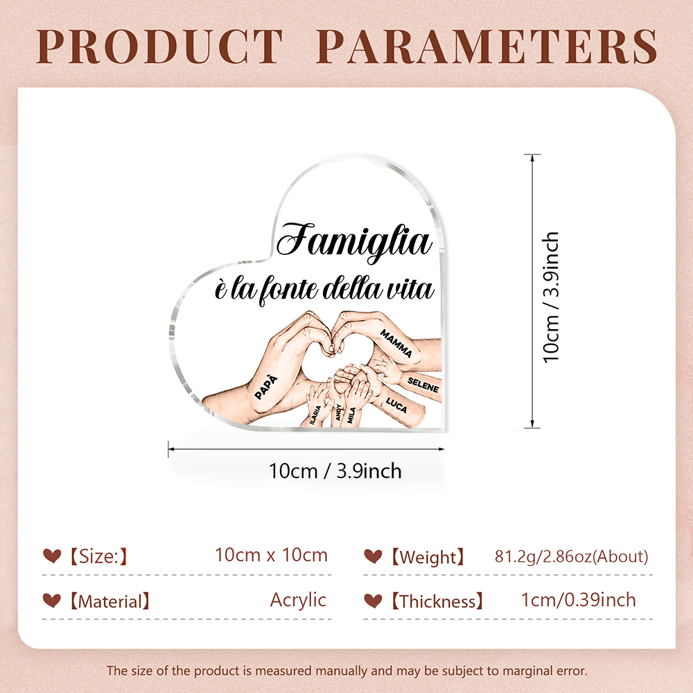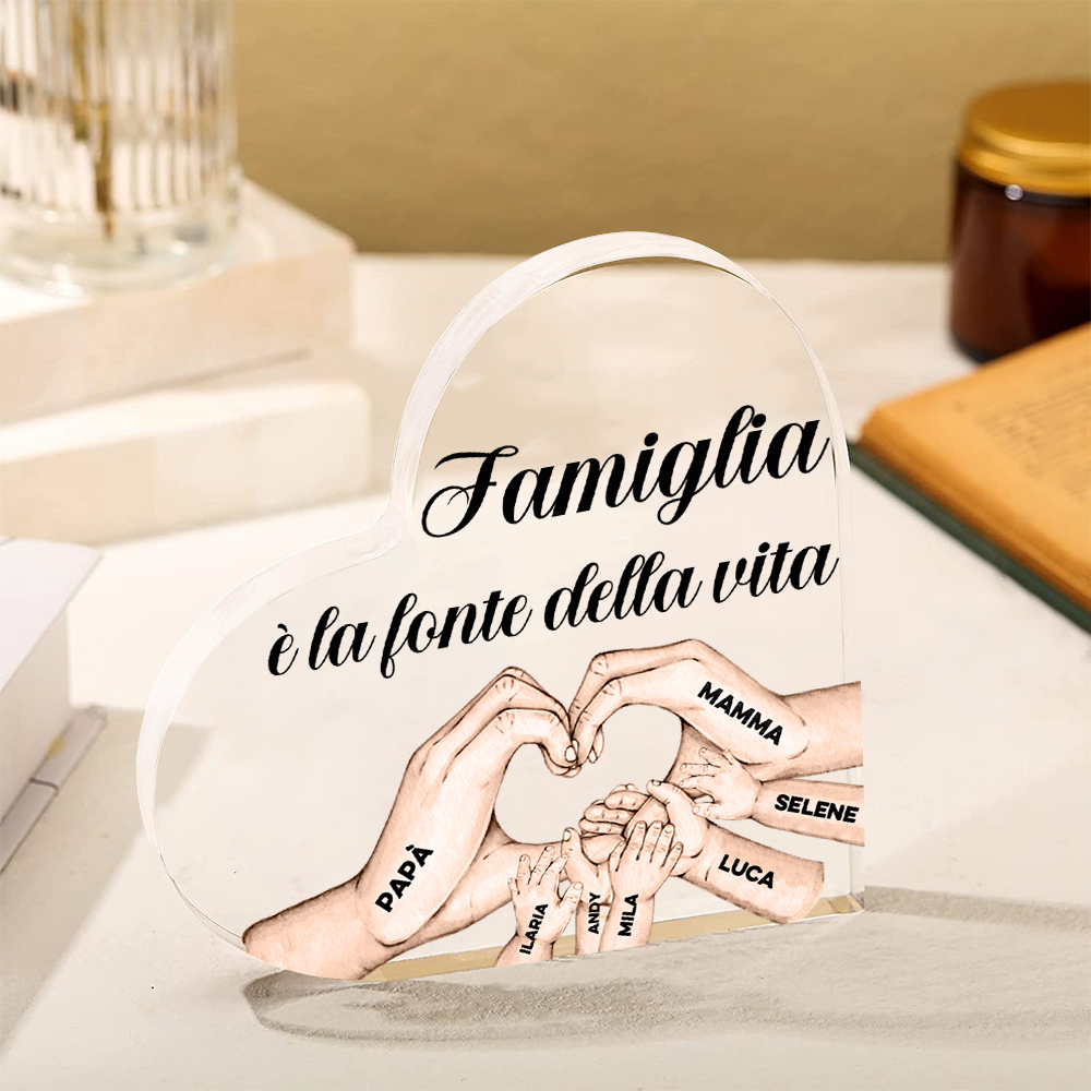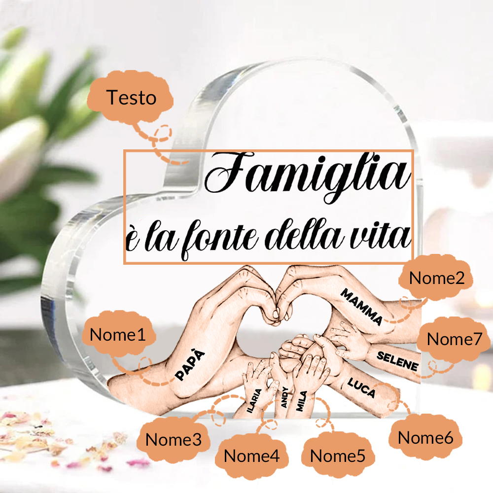 Decorazione acrilica FAMIGLIA È LA FONTE DELLA VITA con 7 mani nomi incisione