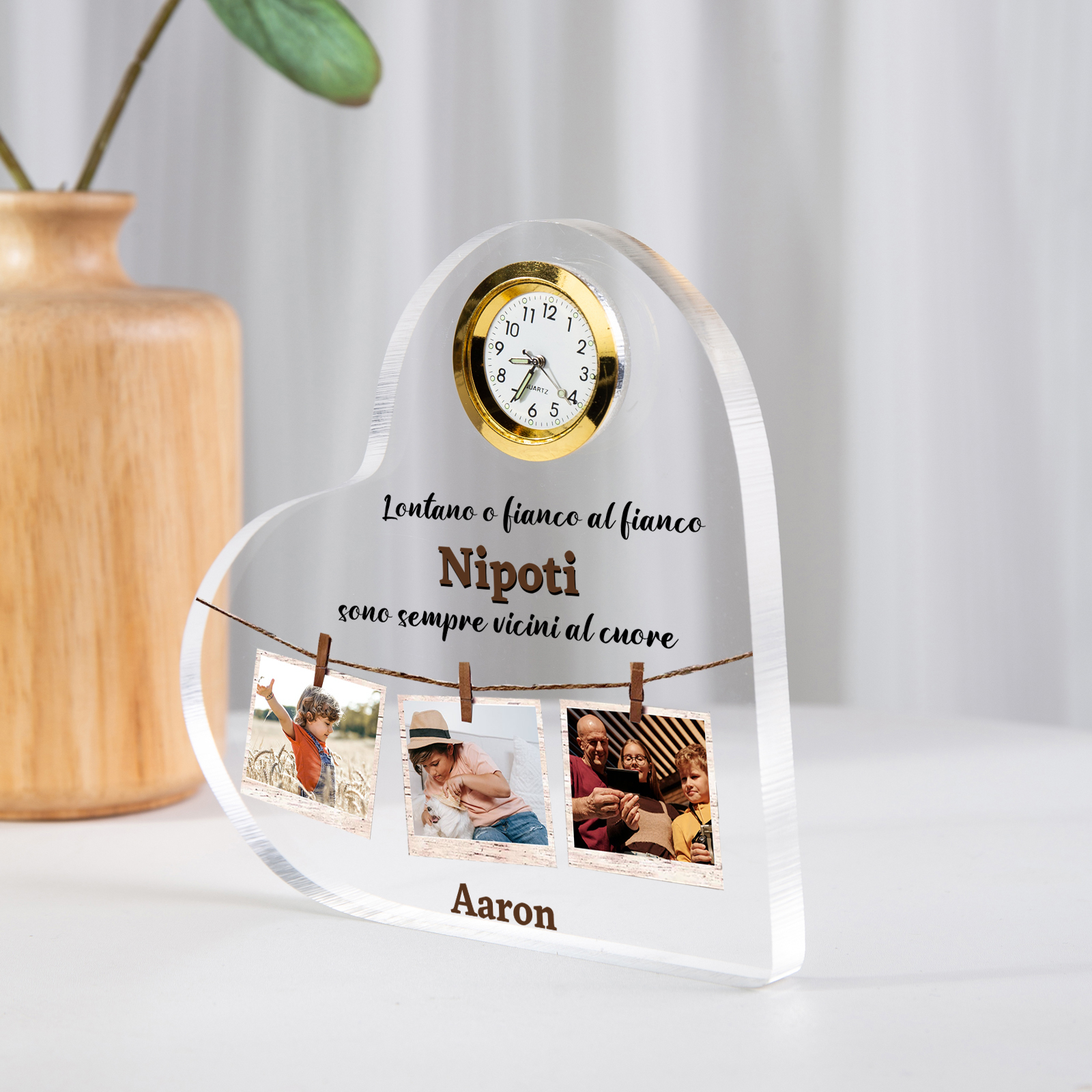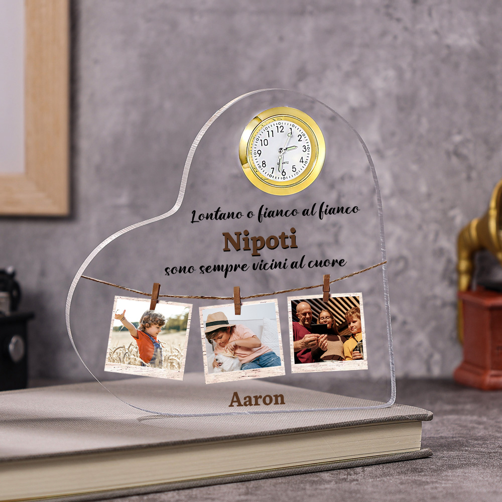 Decorazione acrilica Nipoti Sono Sempre Vicini al Cuore nome testo foto personalizzati con orologio