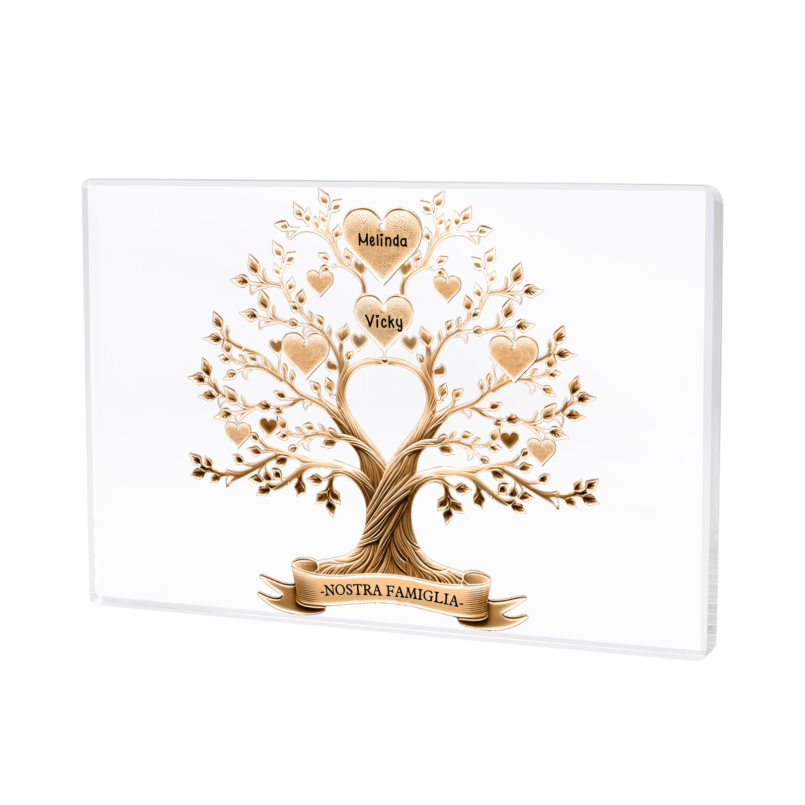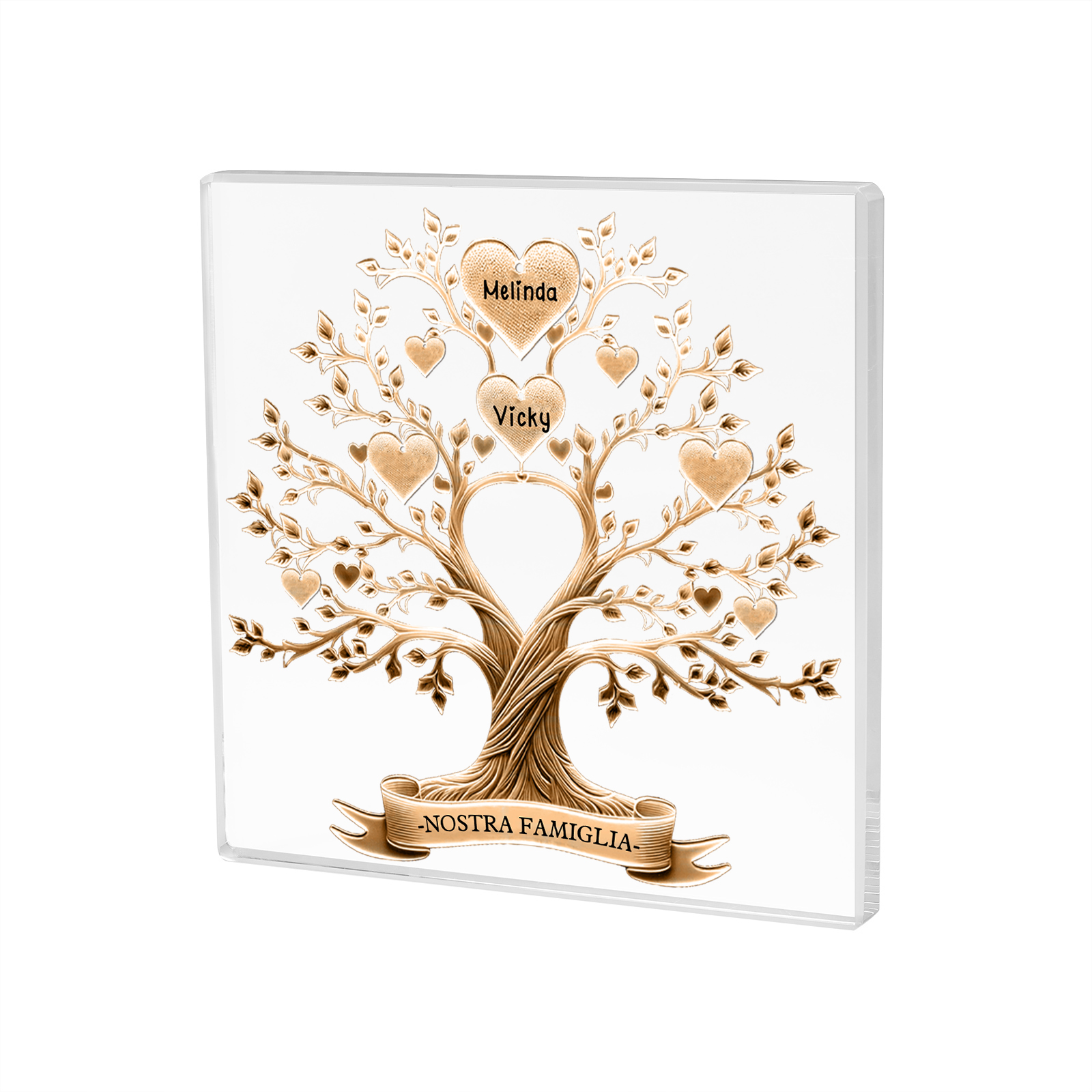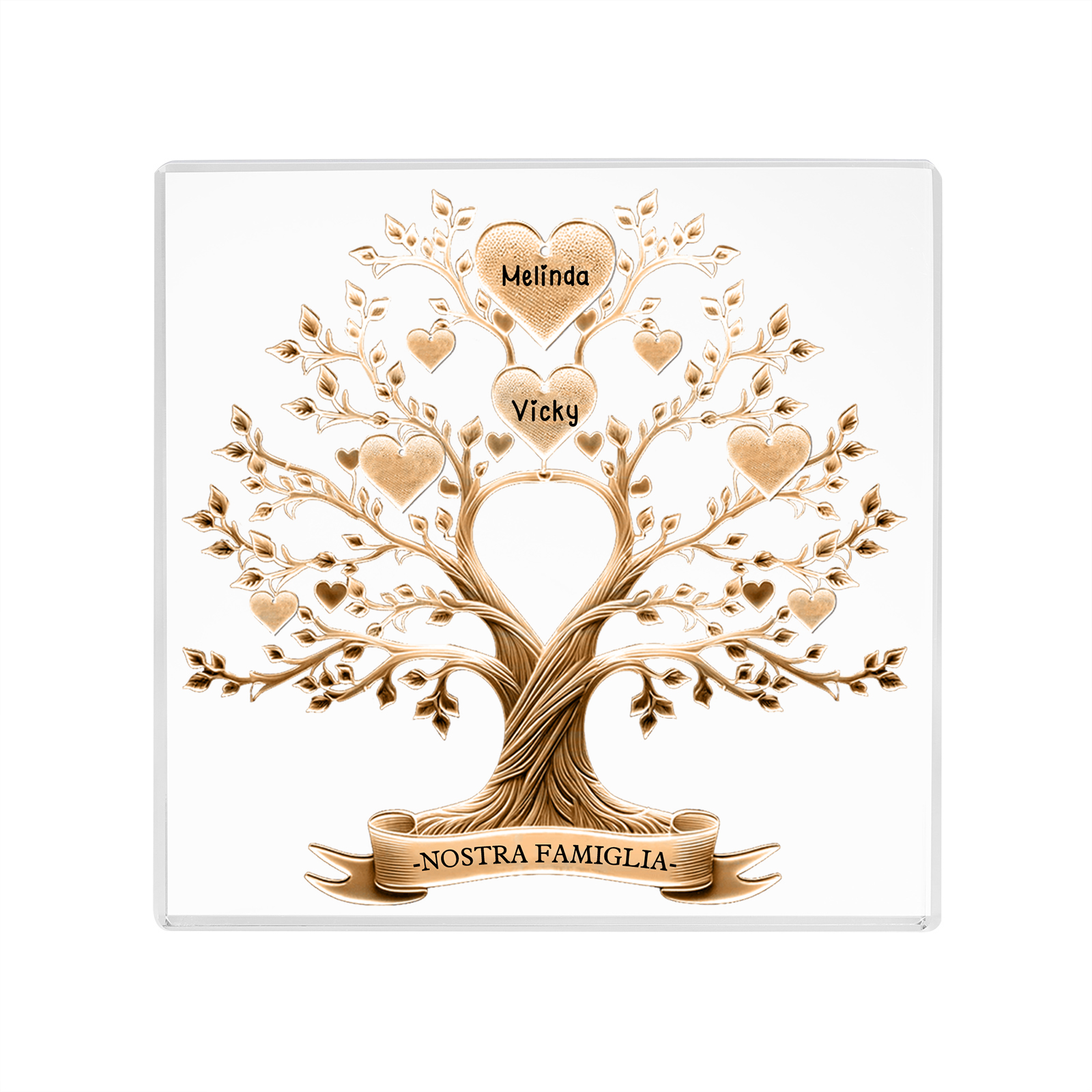 Decorazione quadrata acrilica albero della vita con 2 nomi e 1 testo personalizzati per famiglia