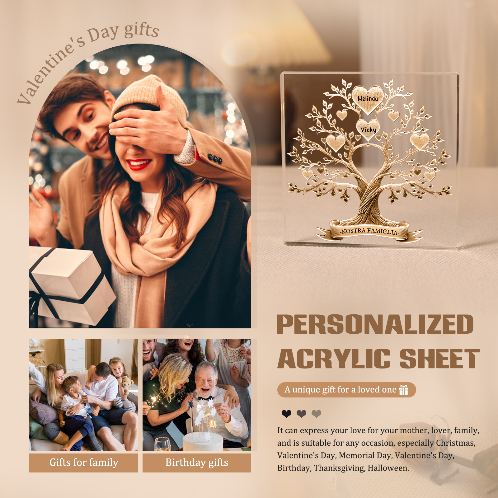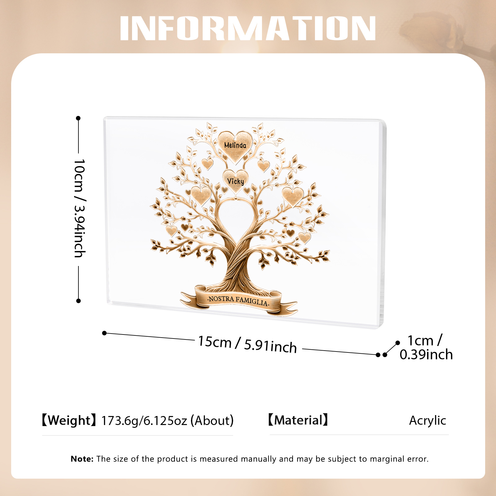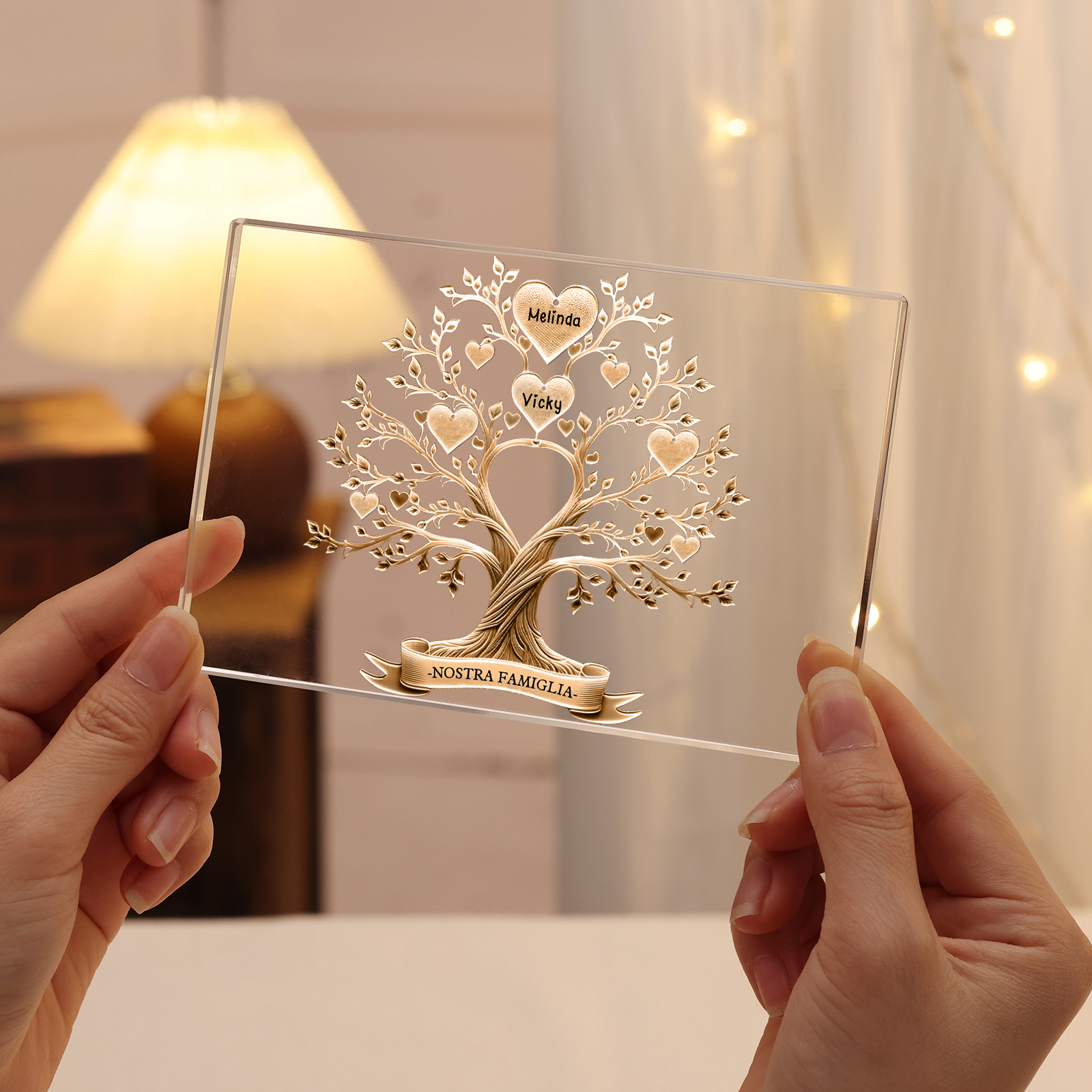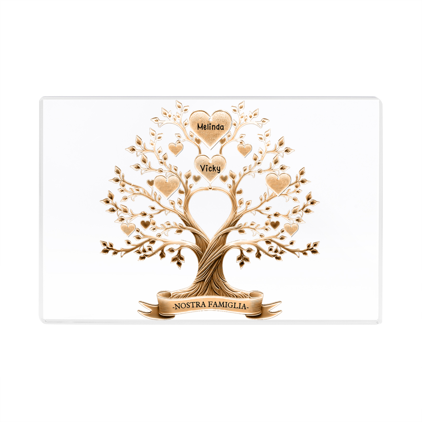 Decorazione quadrata acrilica albero della vita con 2 nomi e 1 testo personalizzati per famiglia