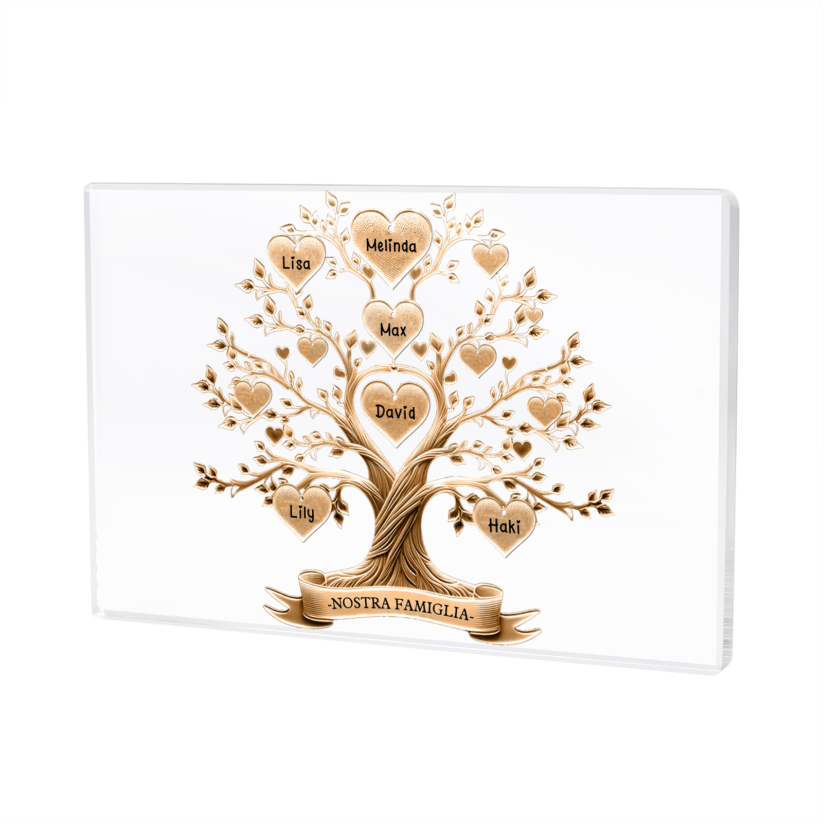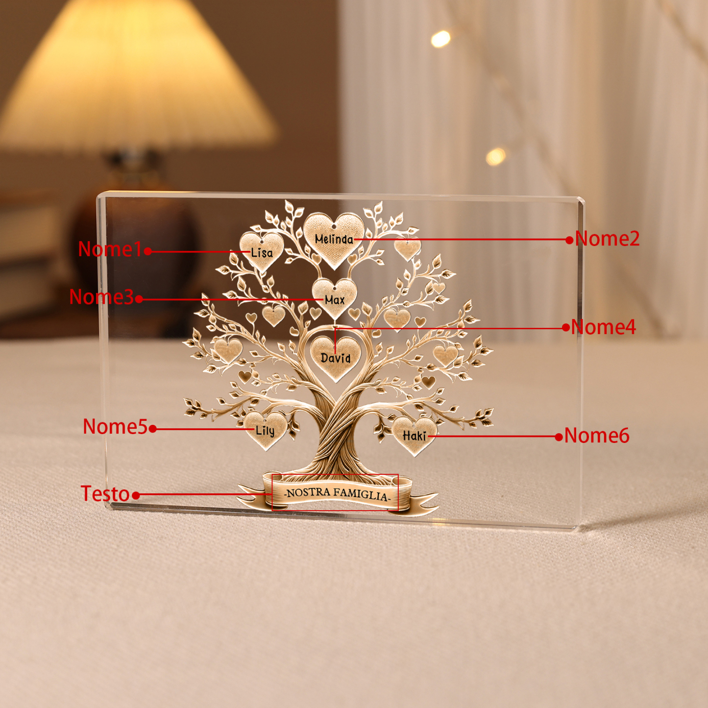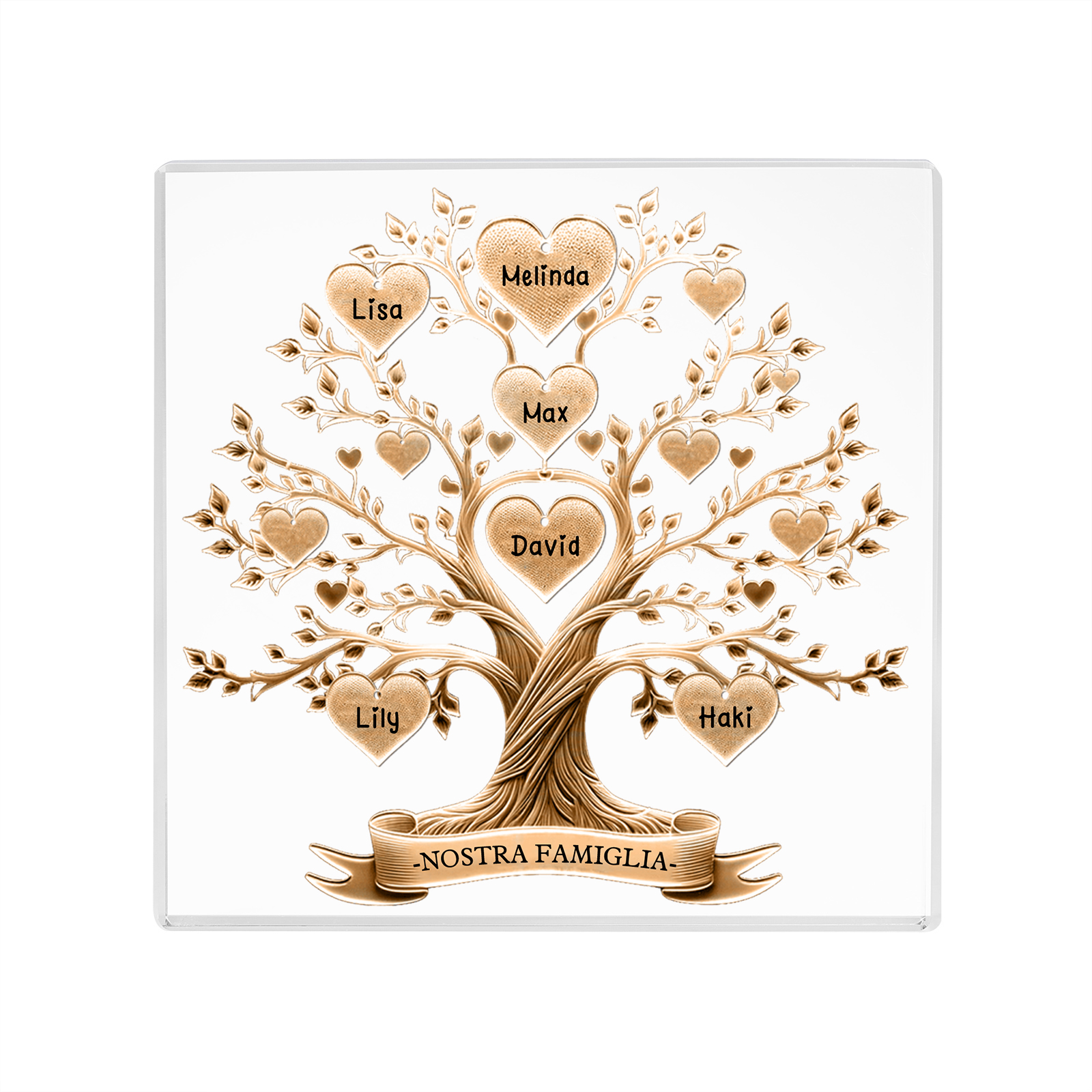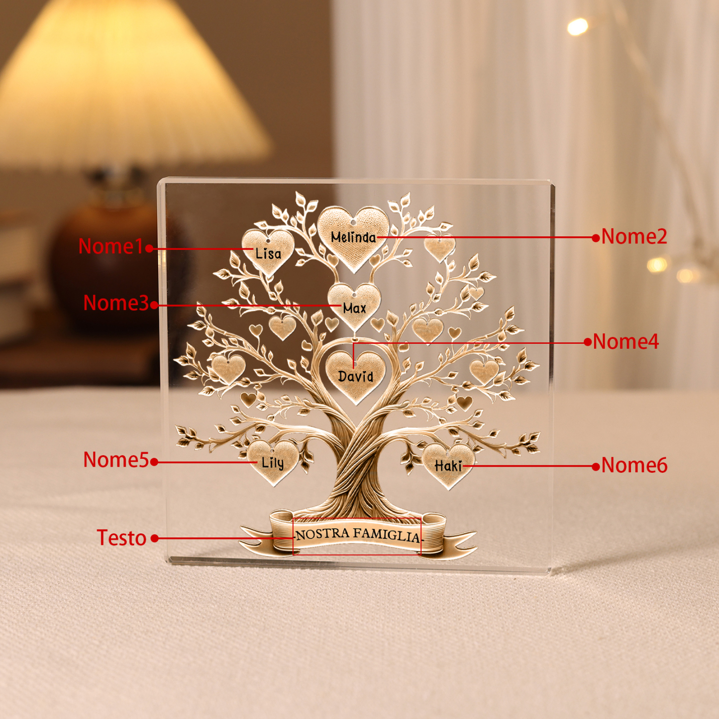 Decorazione quadrata acrilica albero della vita con 6 nomi e 1 testo personalizzati per famiglia