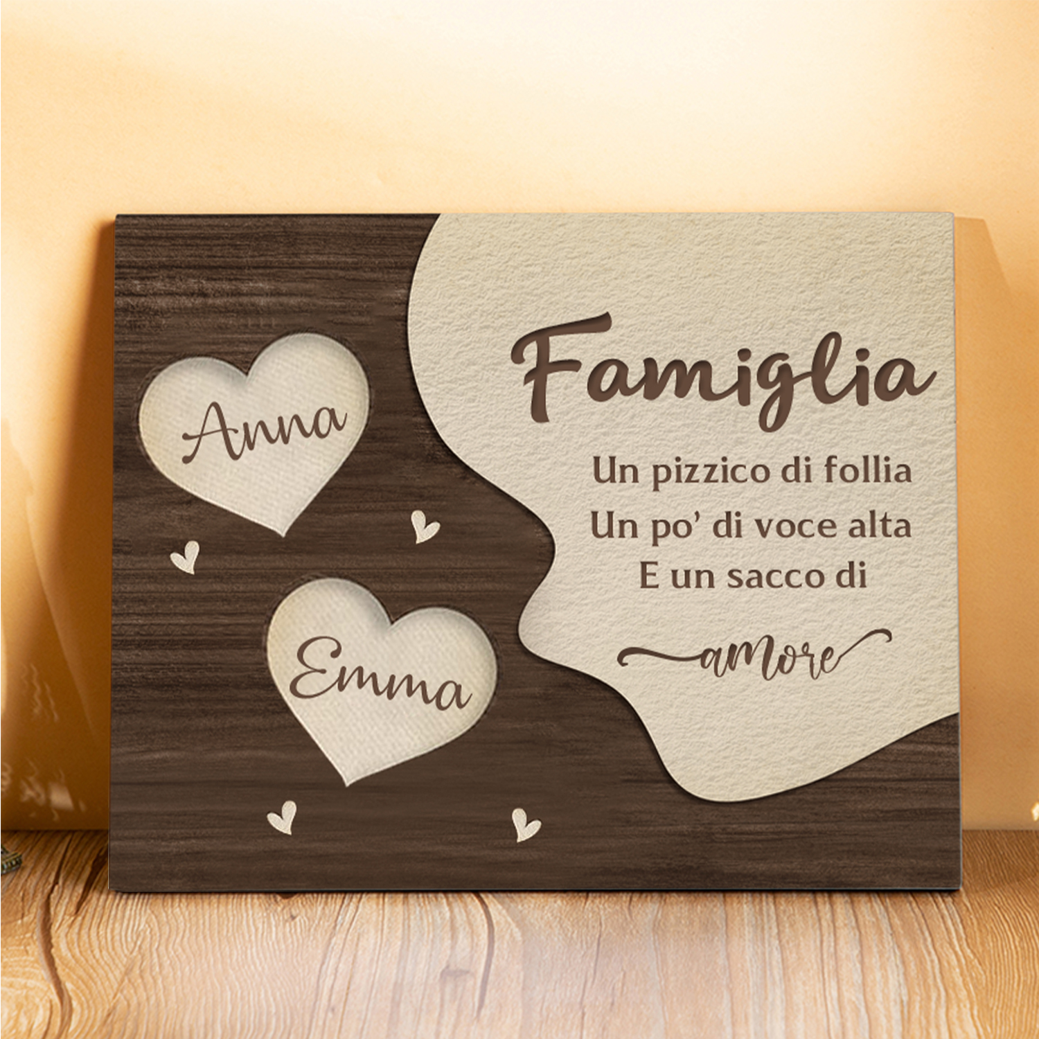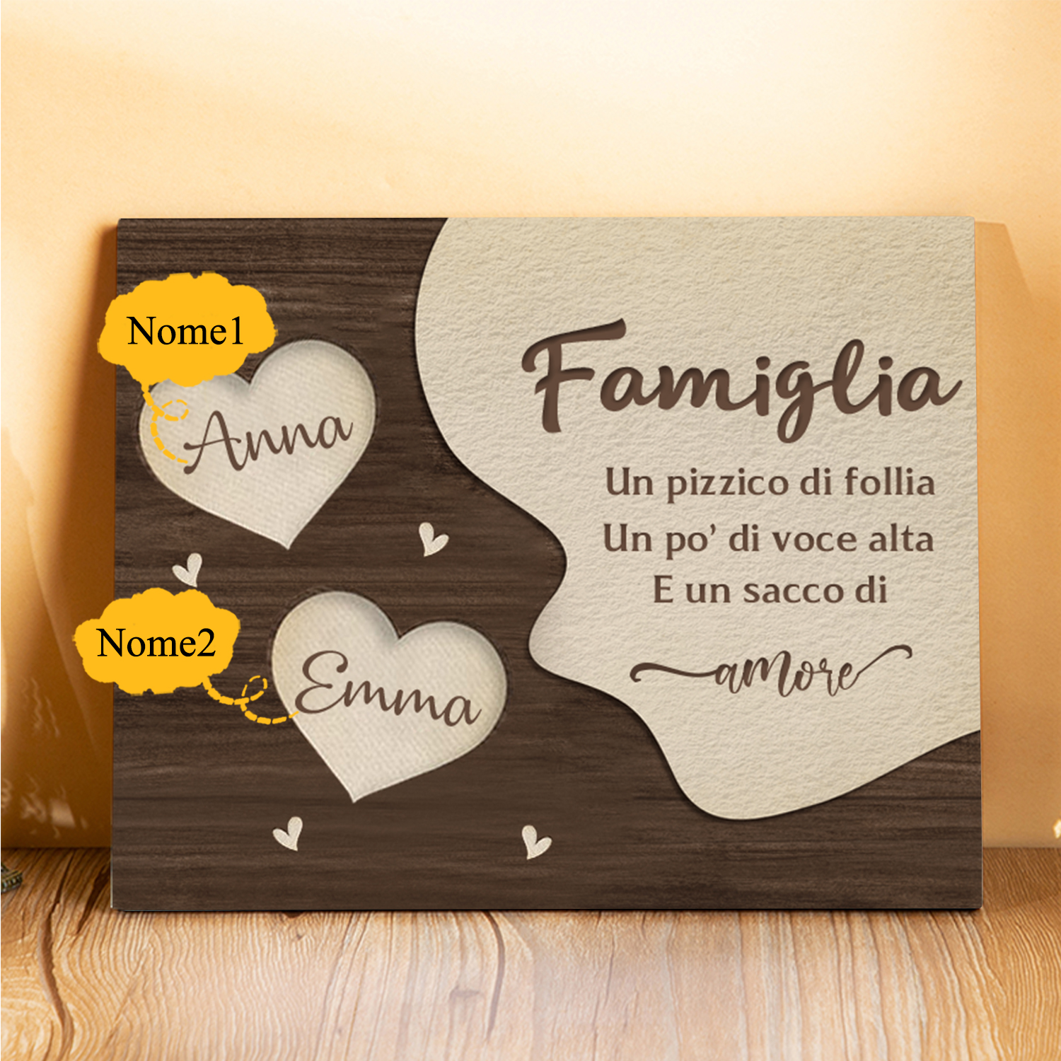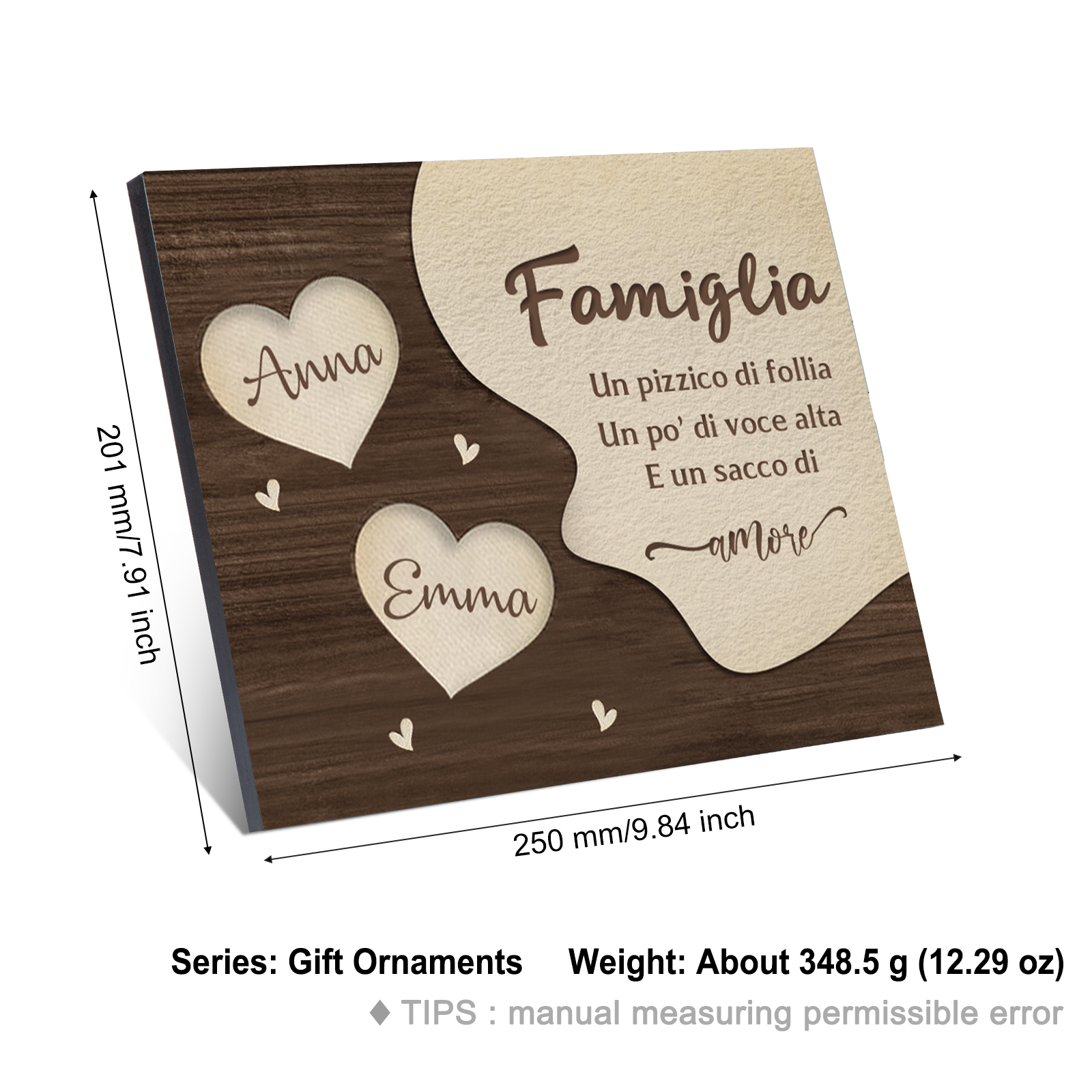 Famiglia-Targa in legno cuore e cuore con 2 nomi personalizzati regalo per mamma e papà