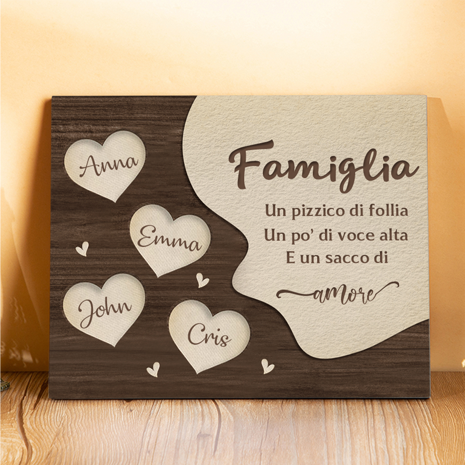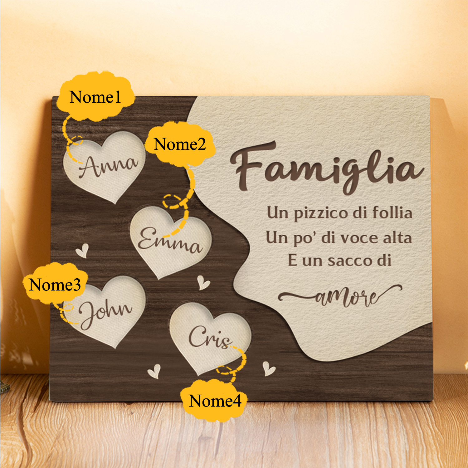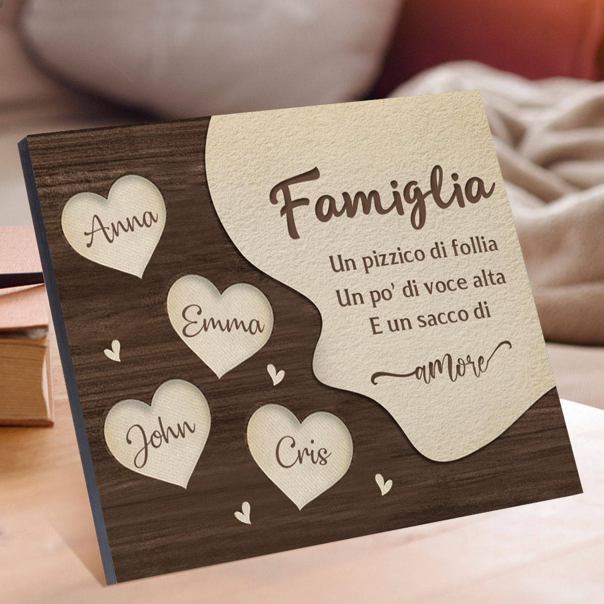 Famiglia-Targa in legno cuore e cuore con 4 nomi personalizzati regalo per mamma e papà