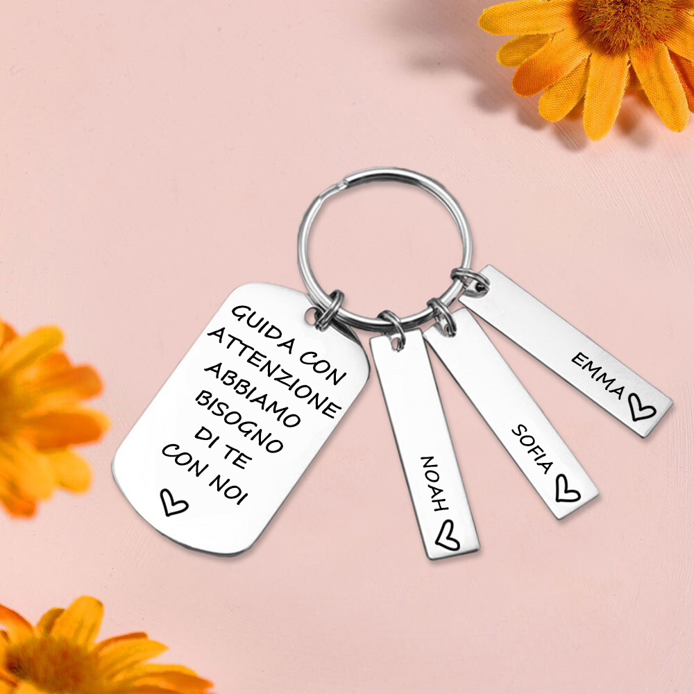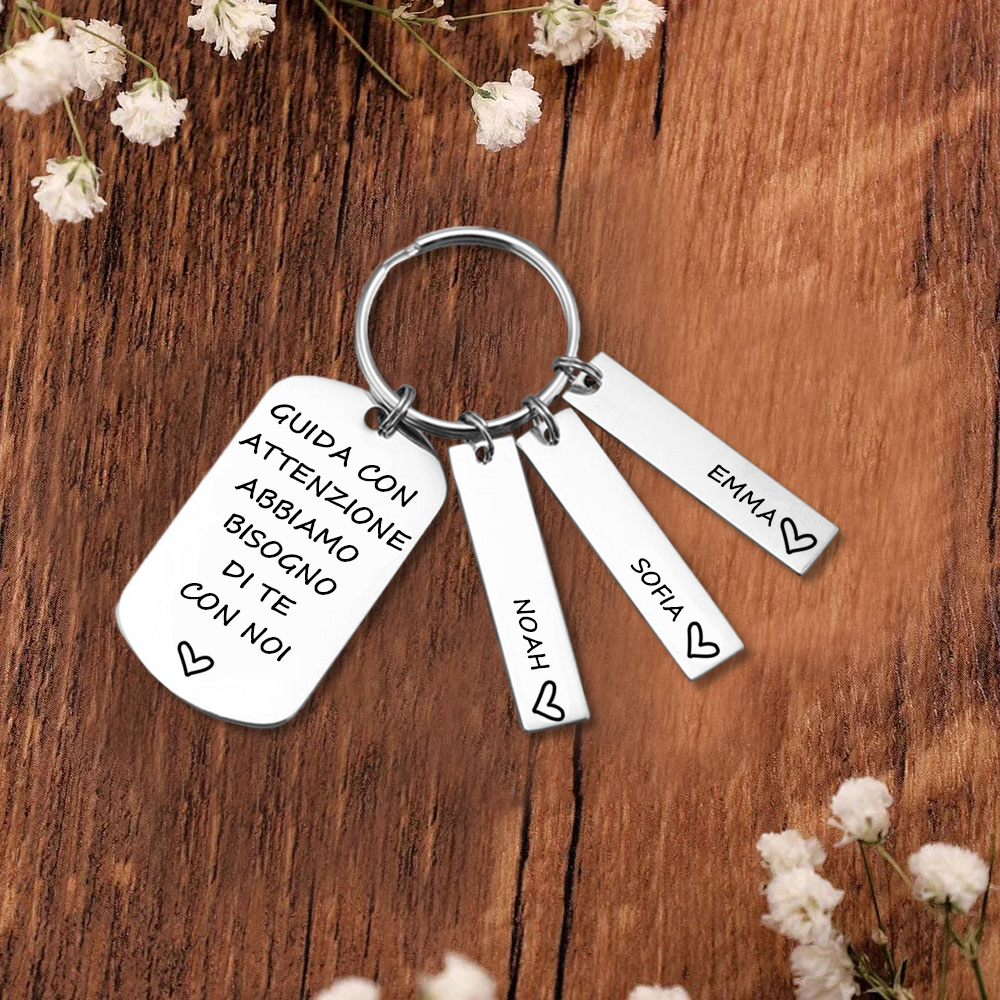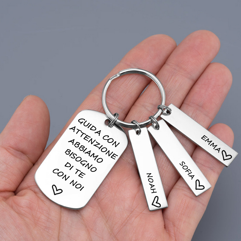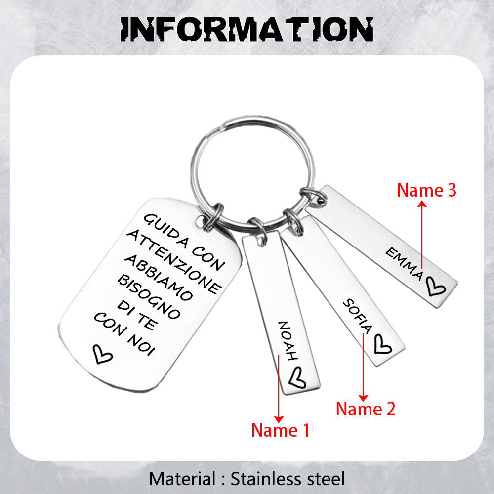 Guida con attenzione-Portachiavi con ciondolo 3 nomi per papà regalo della festa di padre