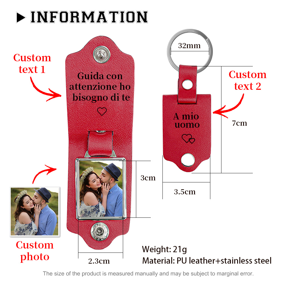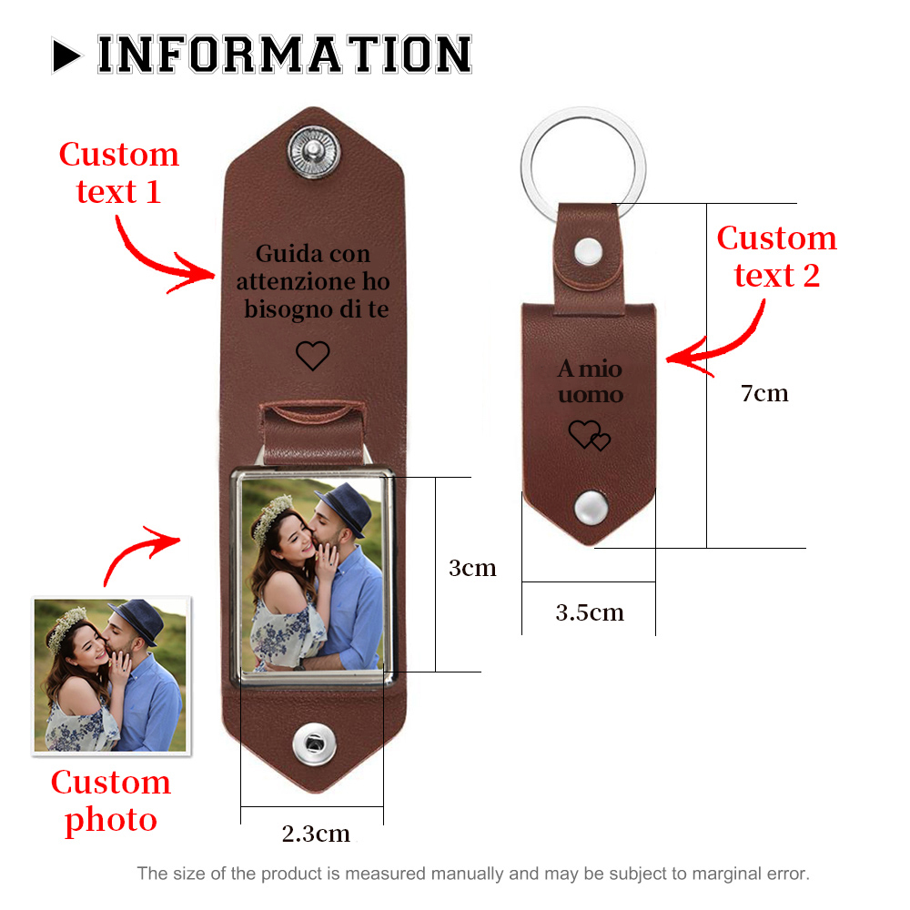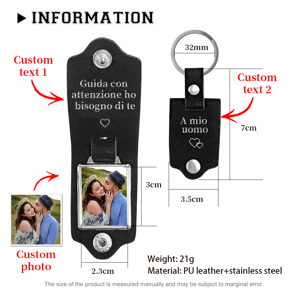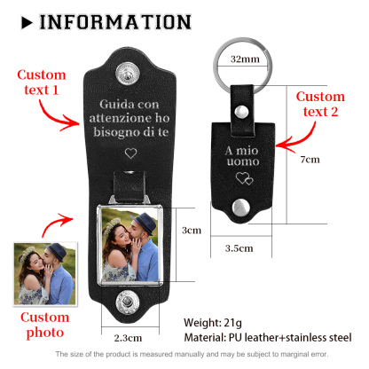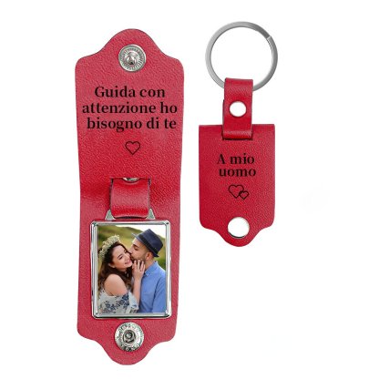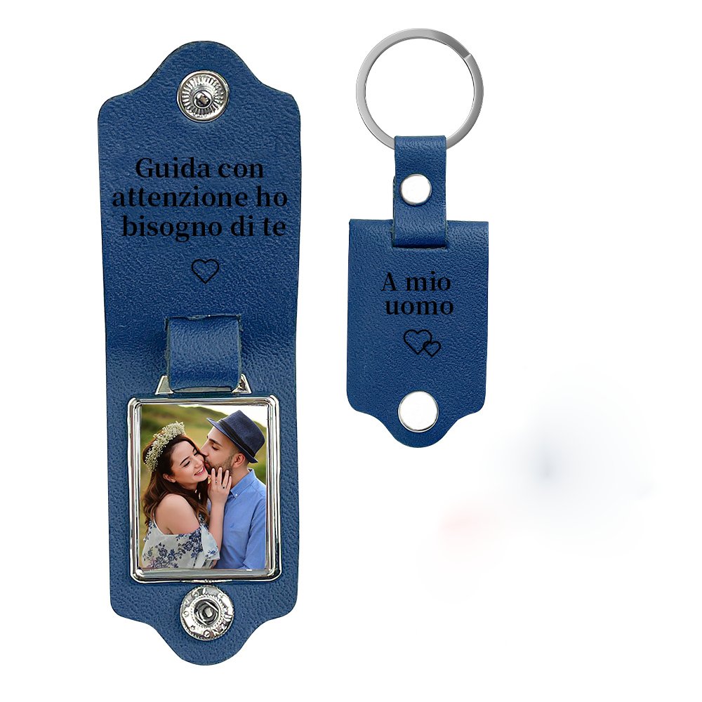 Guida con attenzione-Portachiavi Pelle a coppia foto e 2 testi personalizzabili