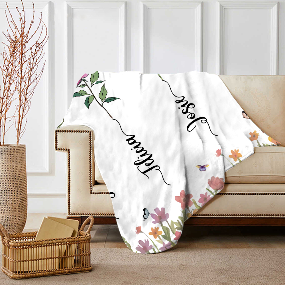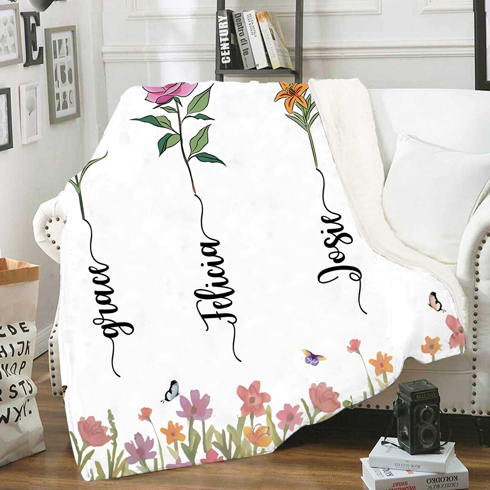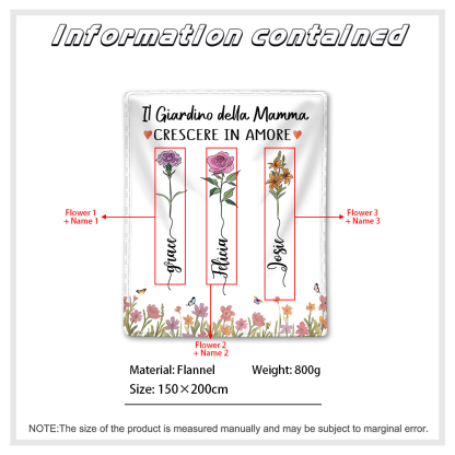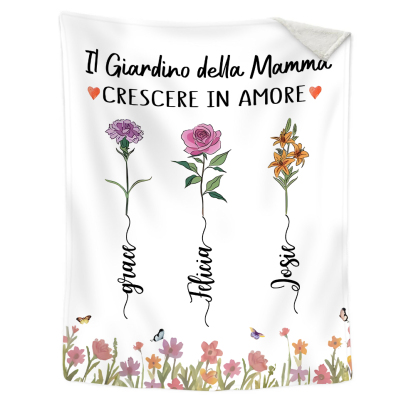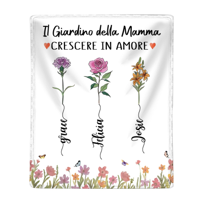 Il Giradino della Mamma-Coperta con fiore di nascita personalizzato e 3 nomi per mamma e la famiglia