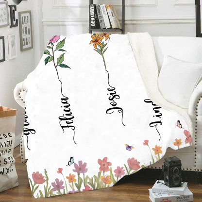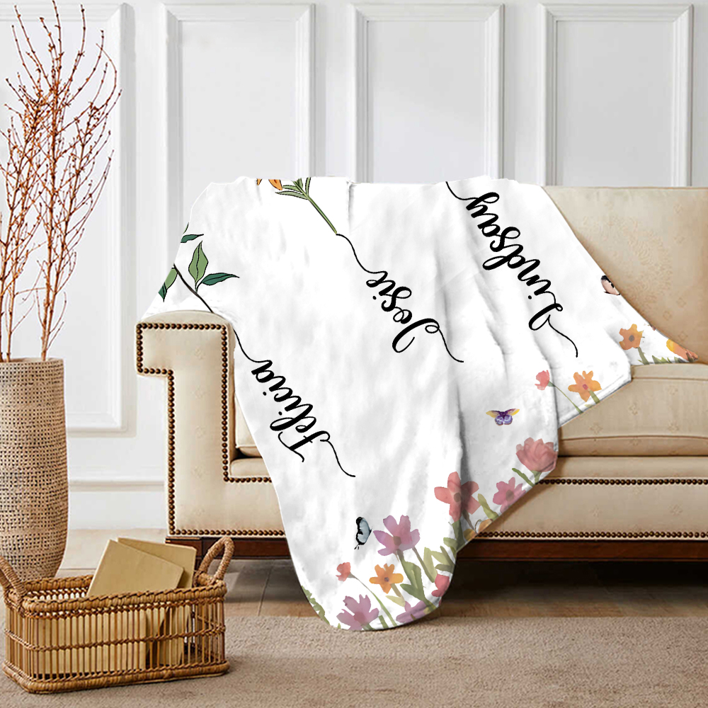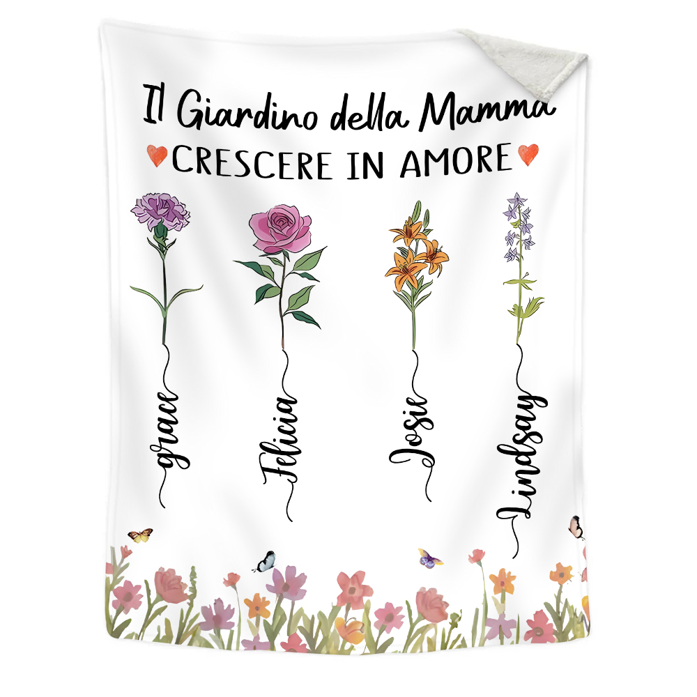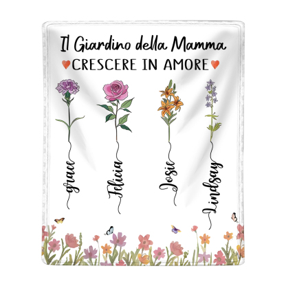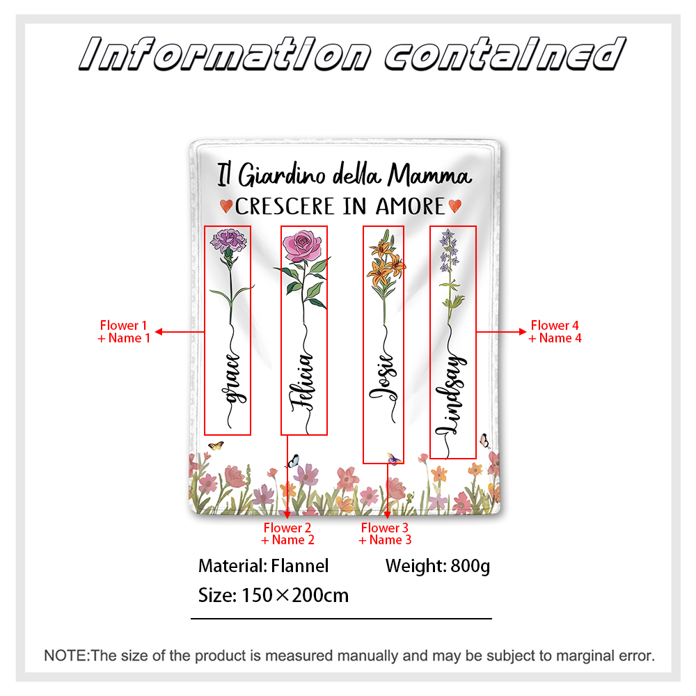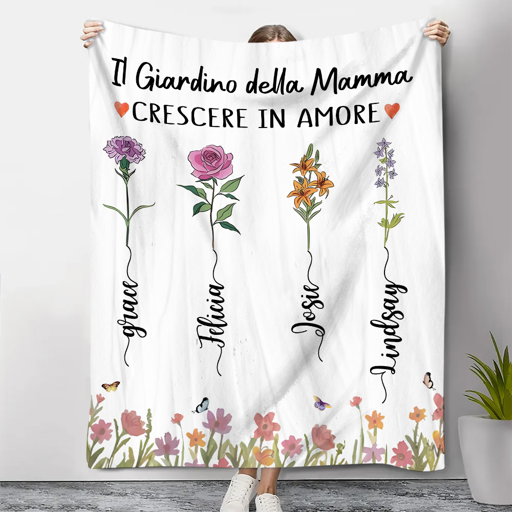 Il Giradino della Mamma-Coperta con fiore di nascita personalizzato e 4 nomi per mamma e la famiglia