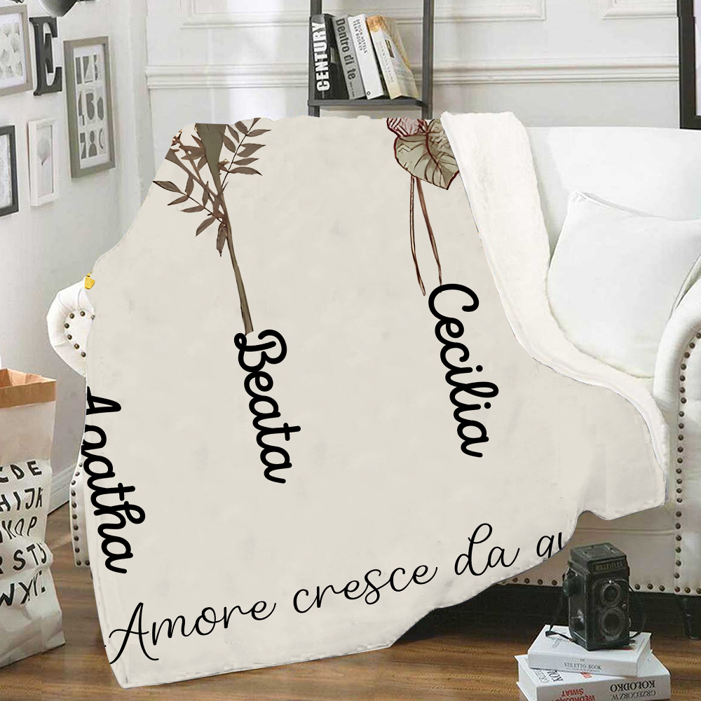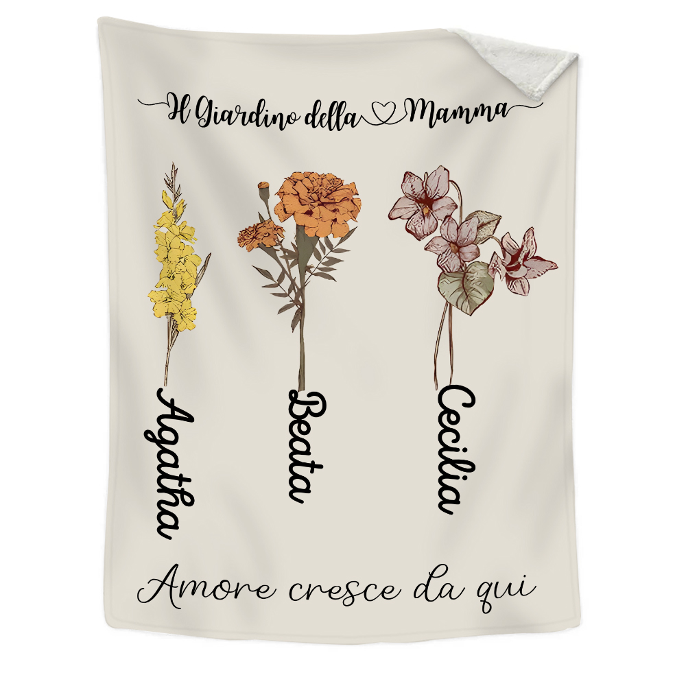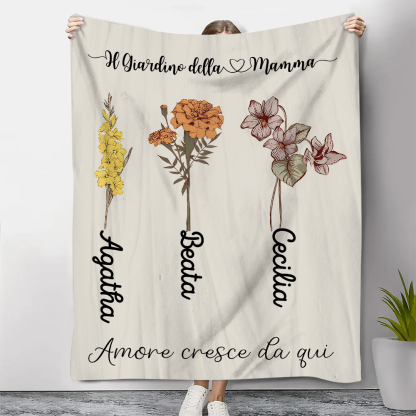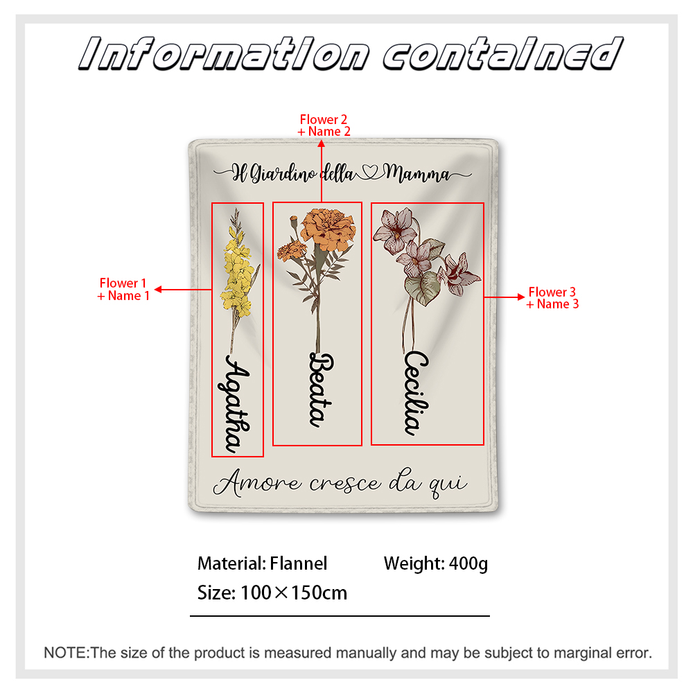 Il Giradino della Mamma,l'amore cresce da qui-Coperta con fiore di nascita personalizzato e 3 nomi per mamma/nonna