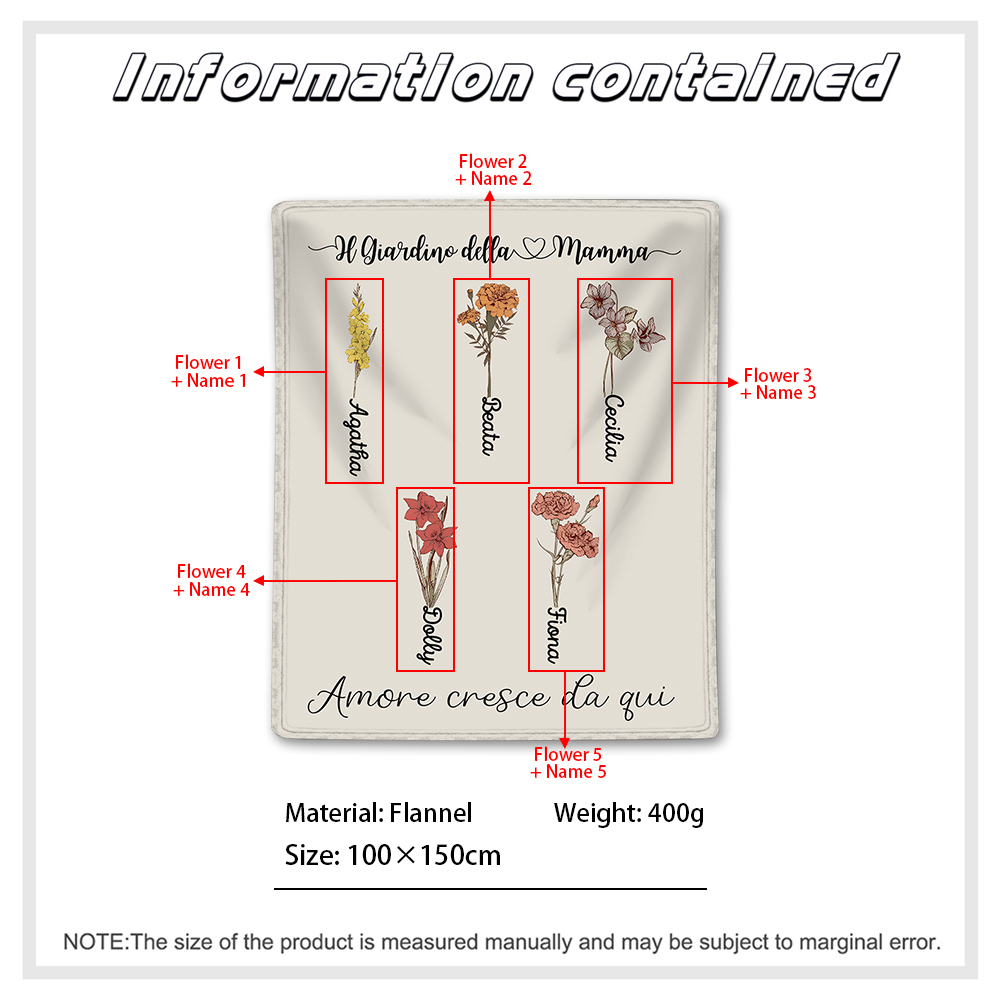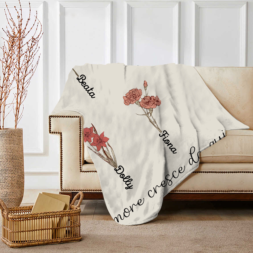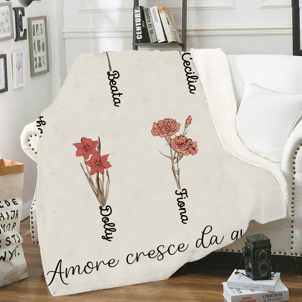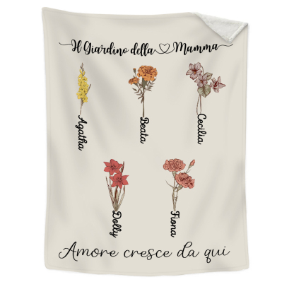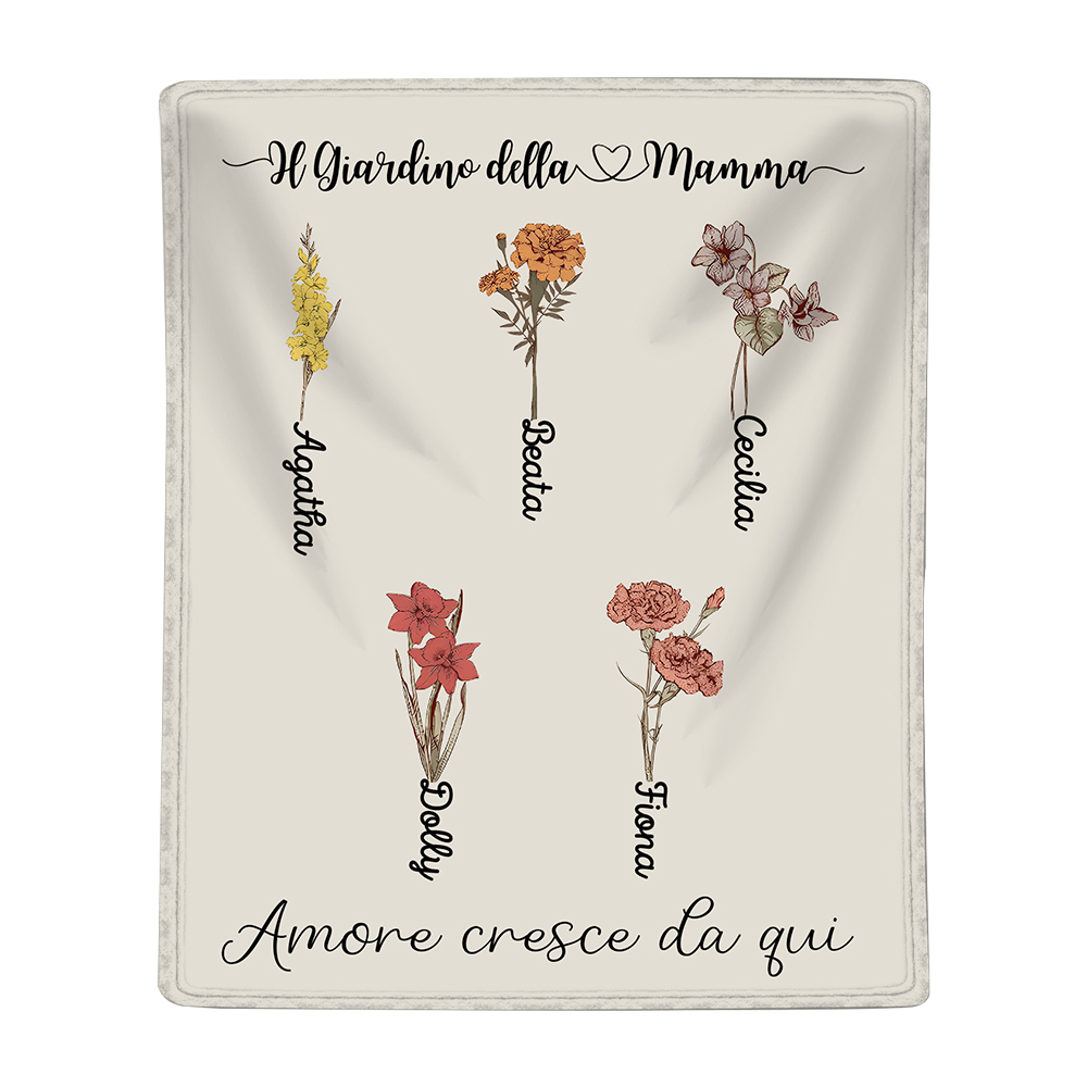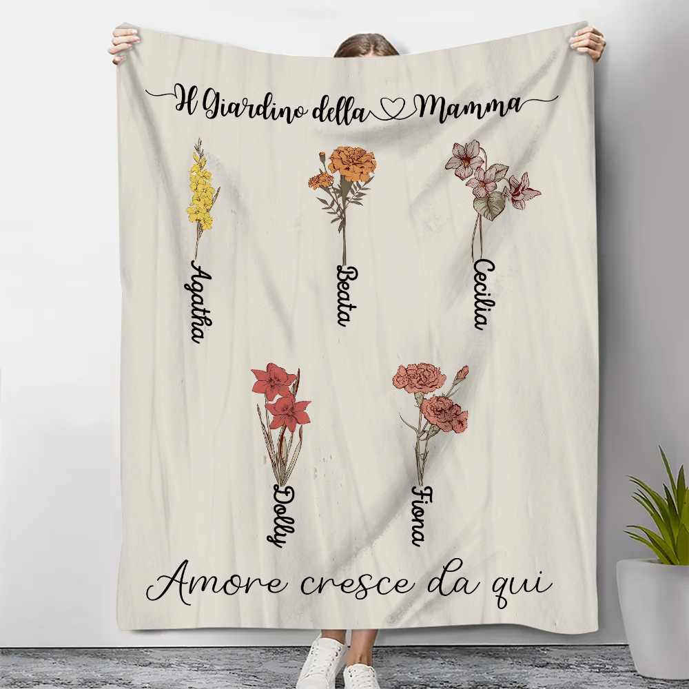 Il Giradino della Mamma,l'amore cresce da qui-Coperta con fiore di nascita personalizzato e 5 nomi per mamma/nonna