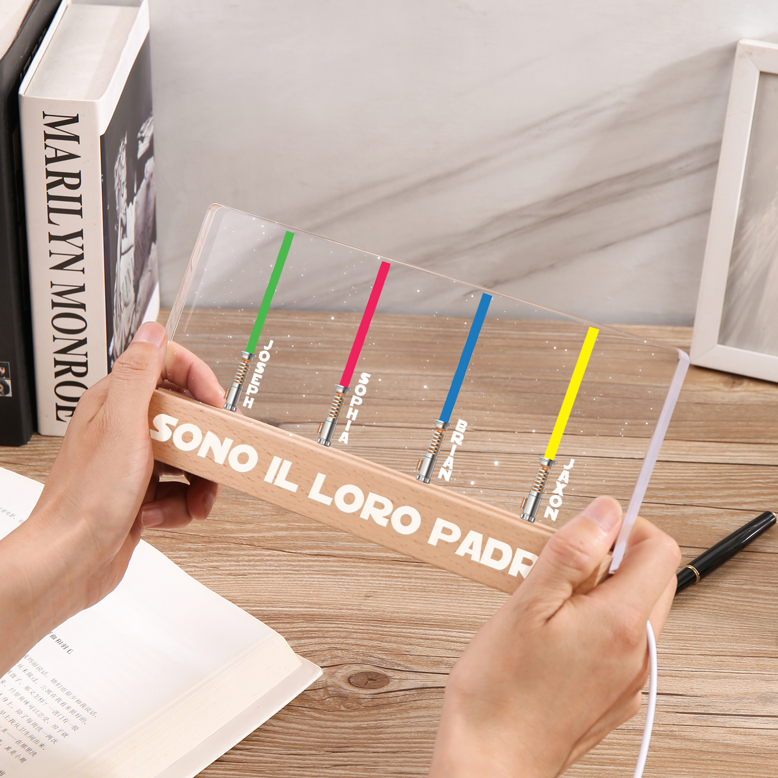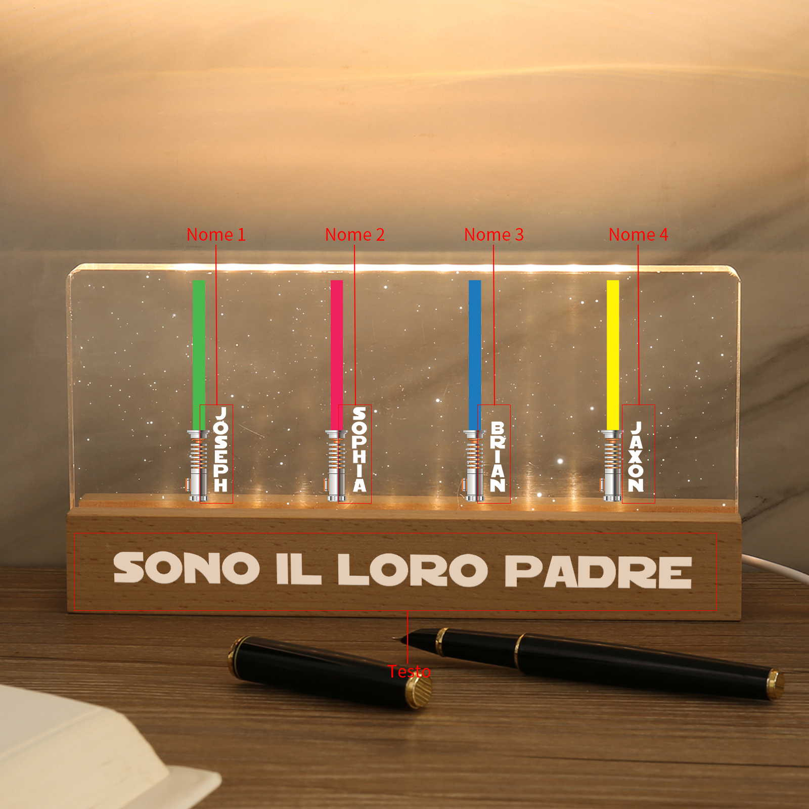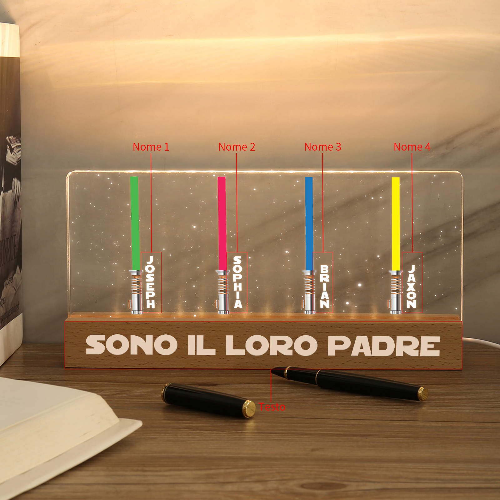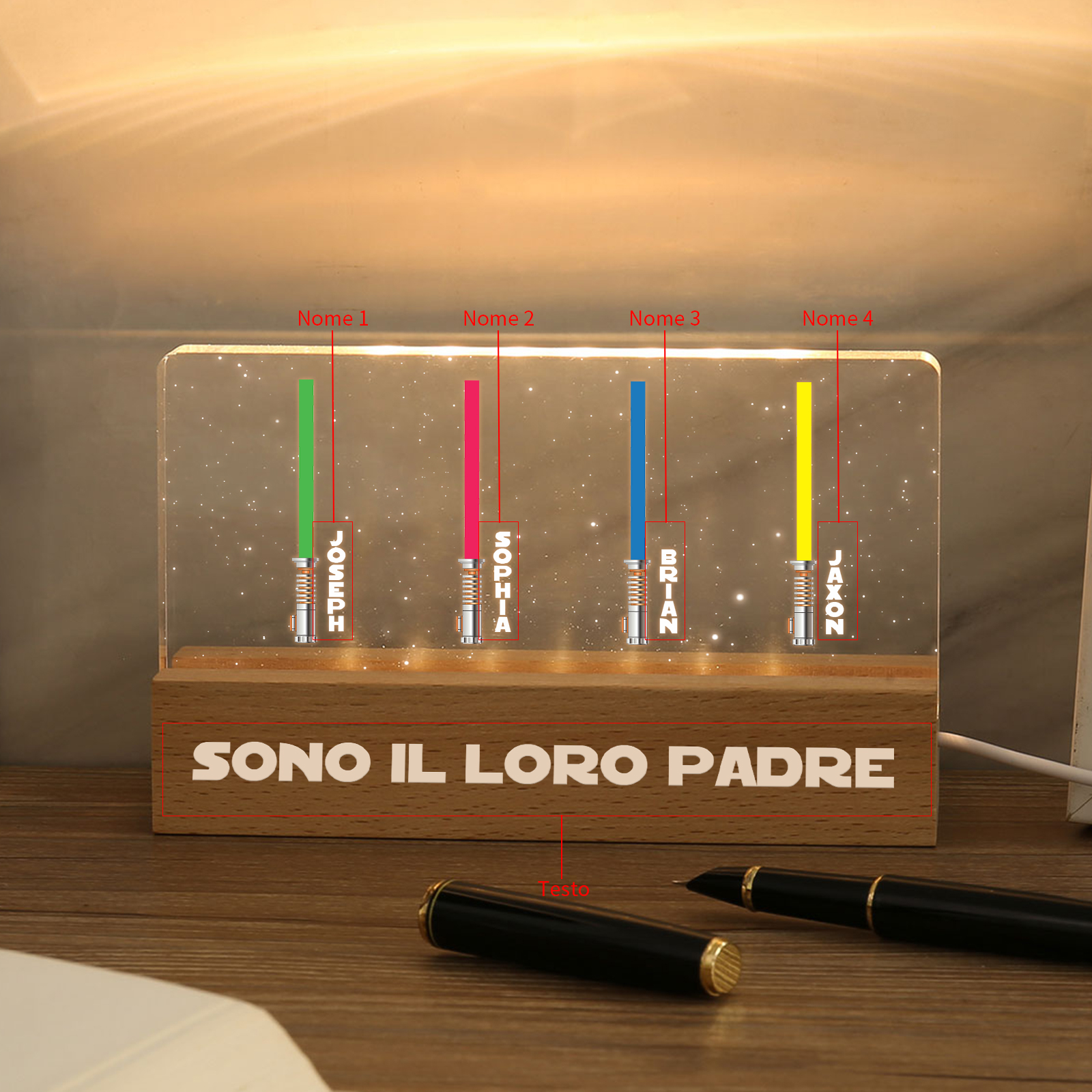 Lampada a tre colori con spada laser 4 nomi e 1 testo personalizzati per papà/nonno