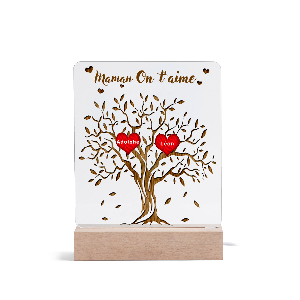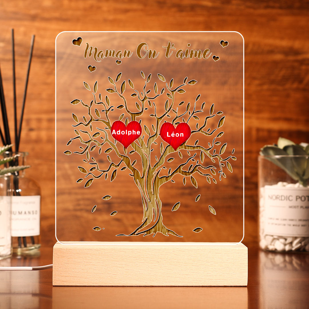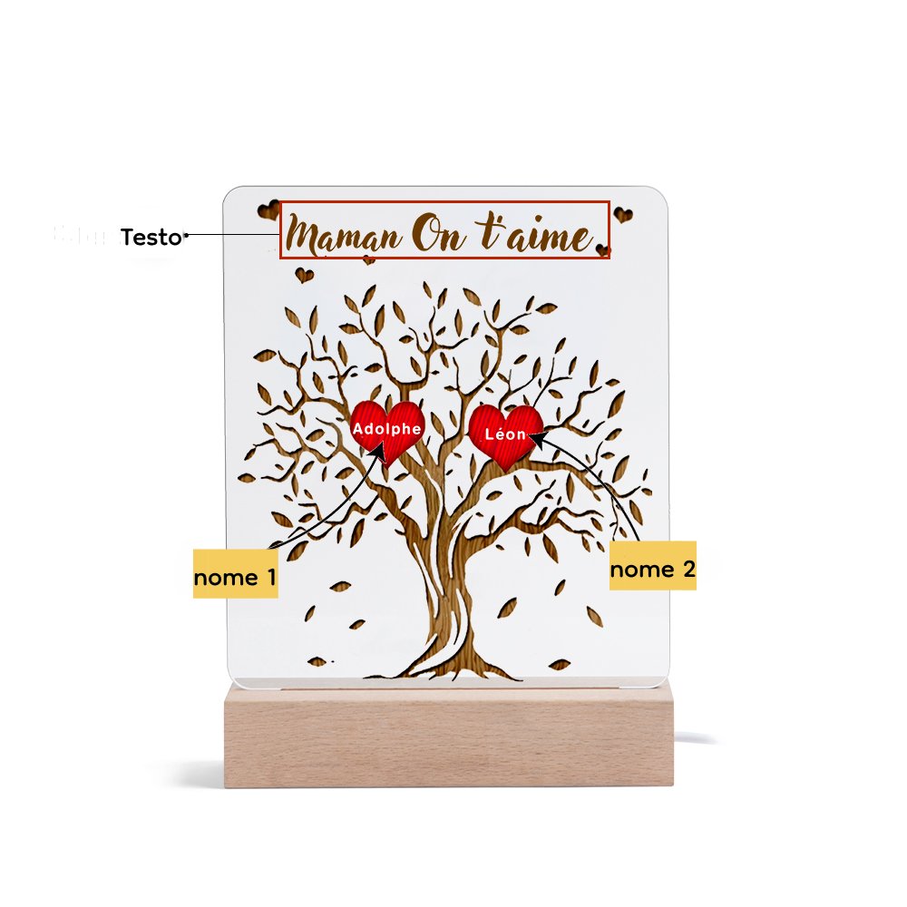 Lampada acrilica albero della vita con cuori 2 nomi e 1 testo personalizzabili per mamma