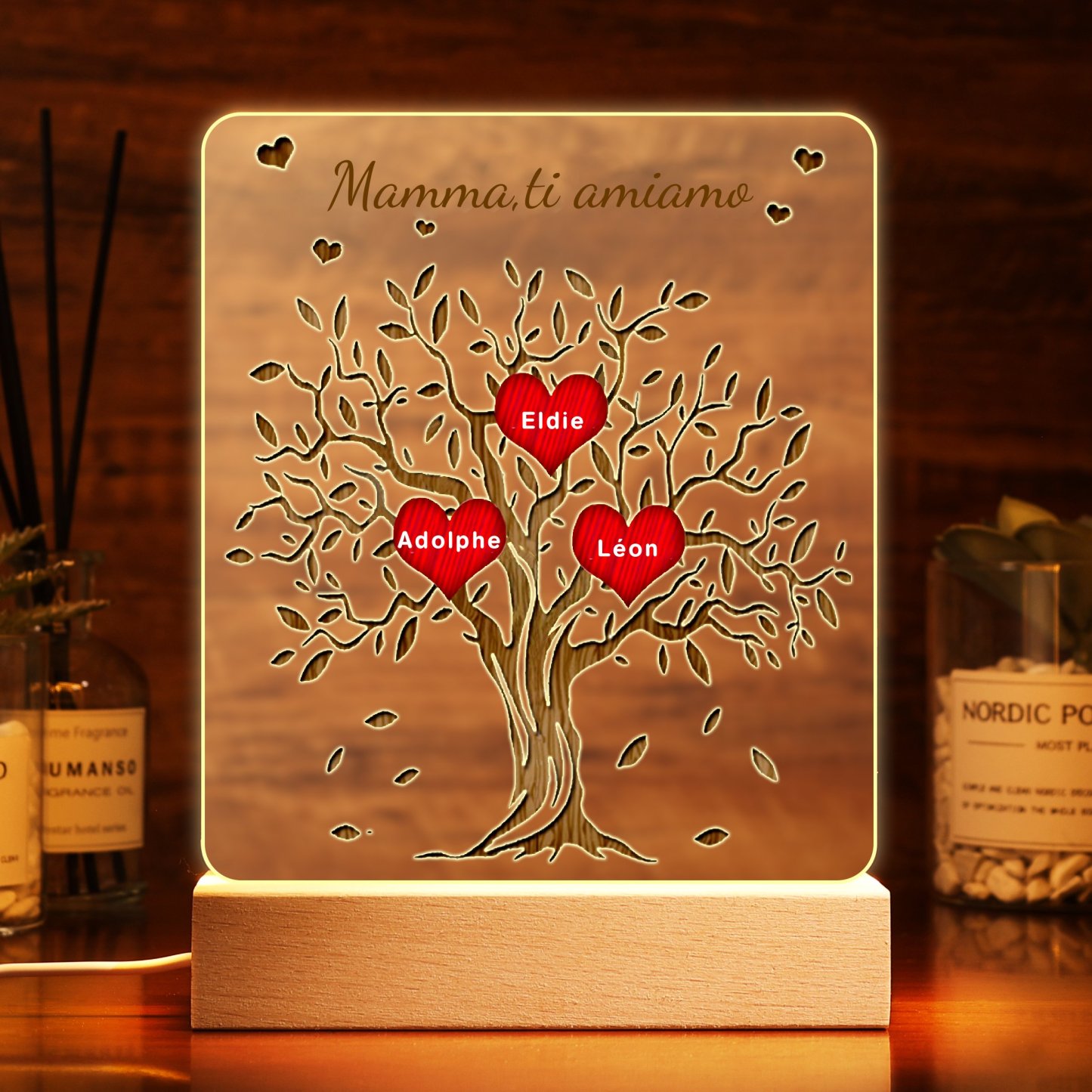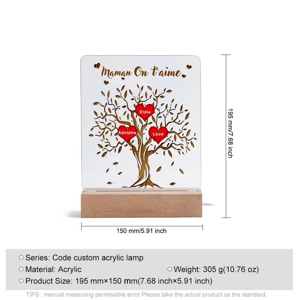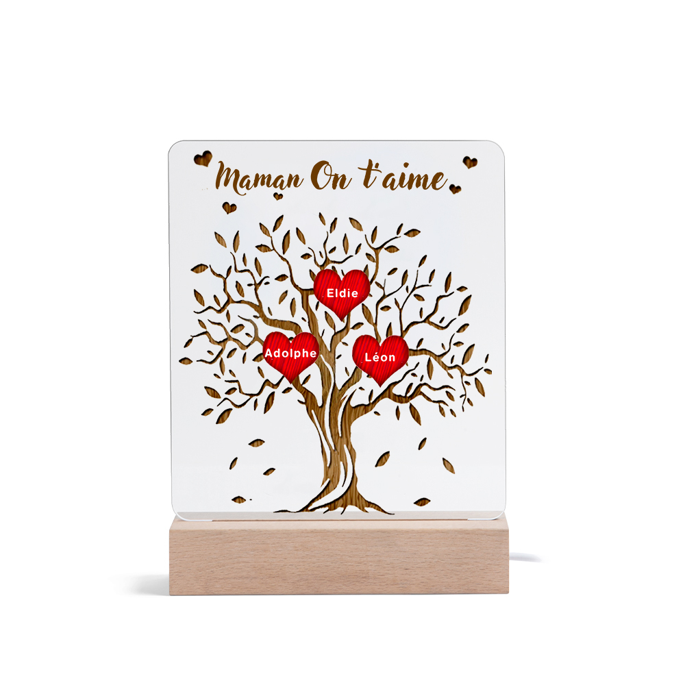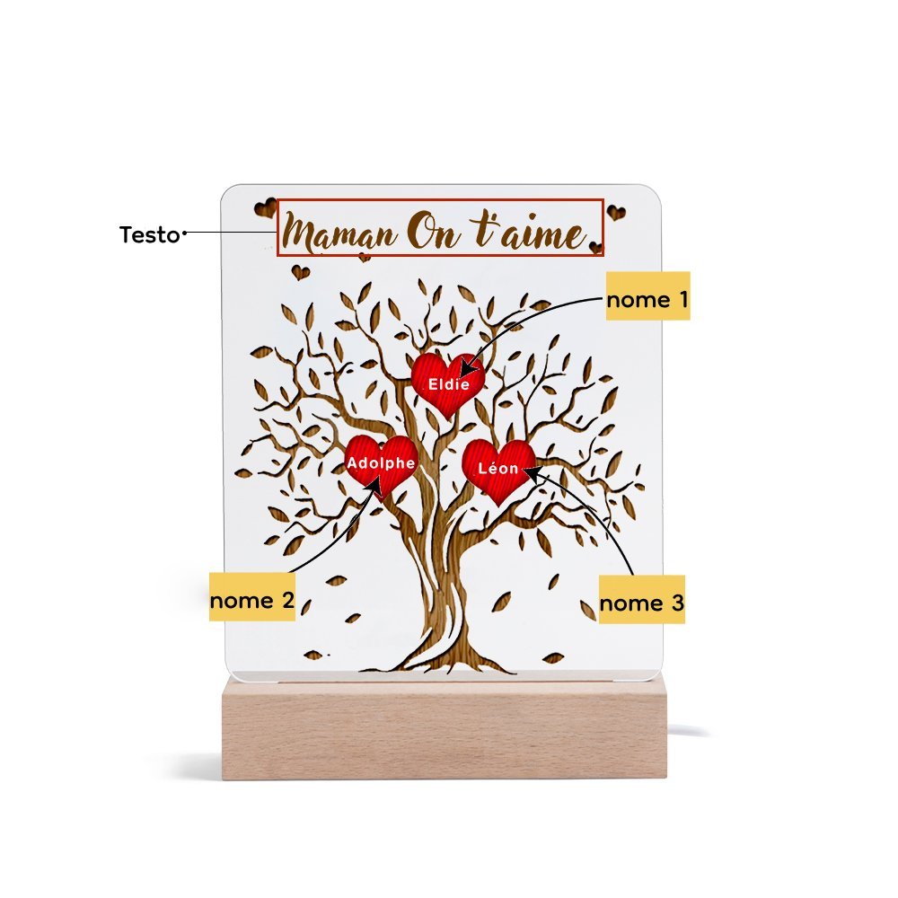 Lampada acrilica albero della vita con cuori 3 nomi e 1 testo personalizzabili per mamma