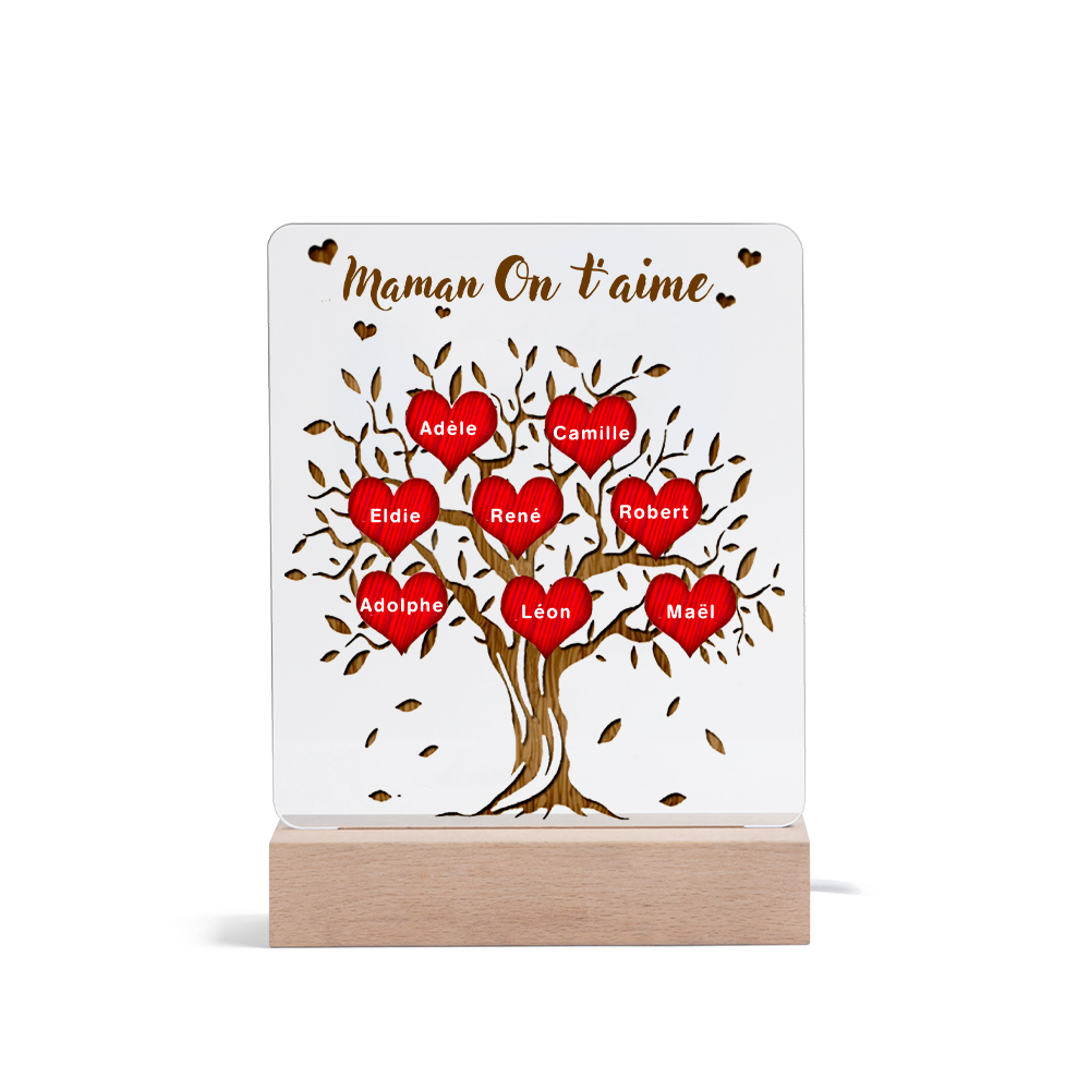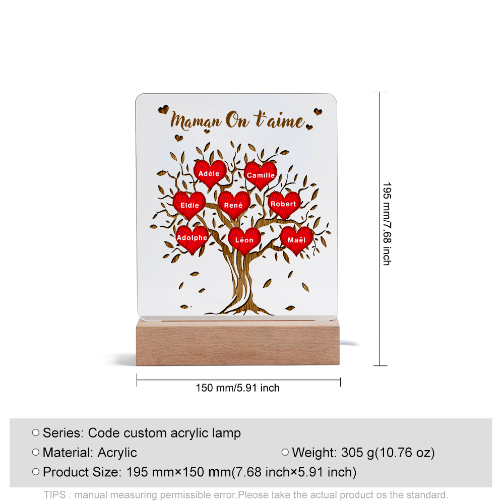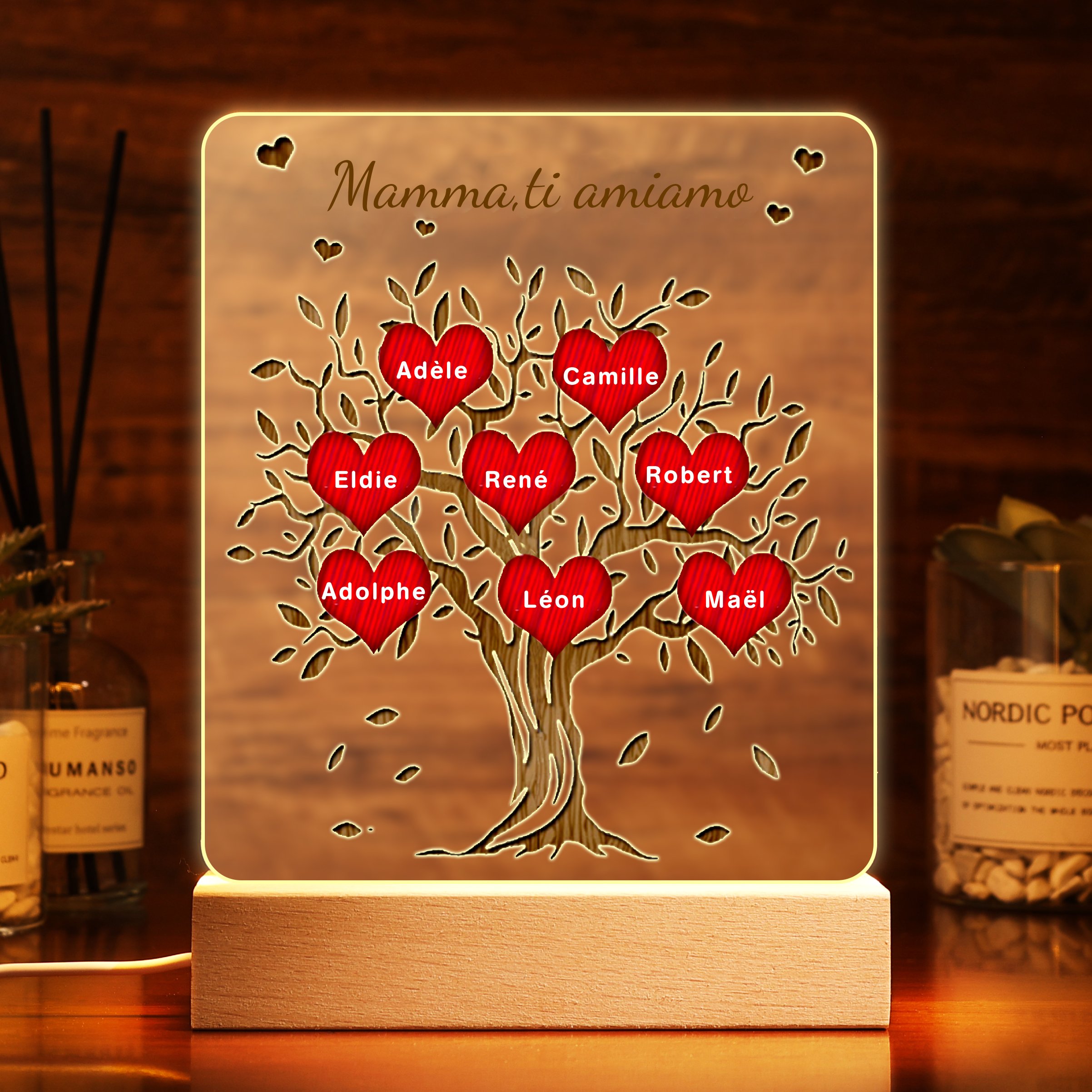 Lampada acrilica albero della vita con cuori 8 nomi e 1 testo personalizzabili per mamma
