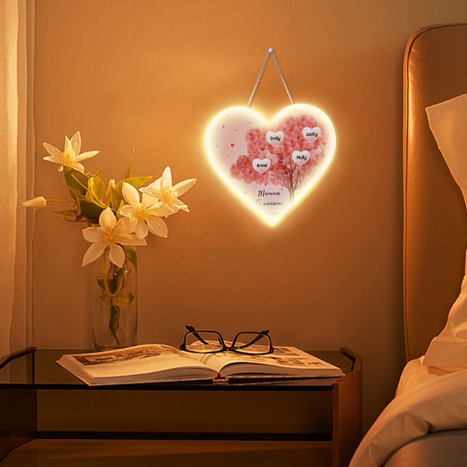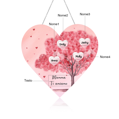 Lampada acrilica appeso albero di cuore rosa 4 nomi e 1 testo personalizzabili per mamma/nonna