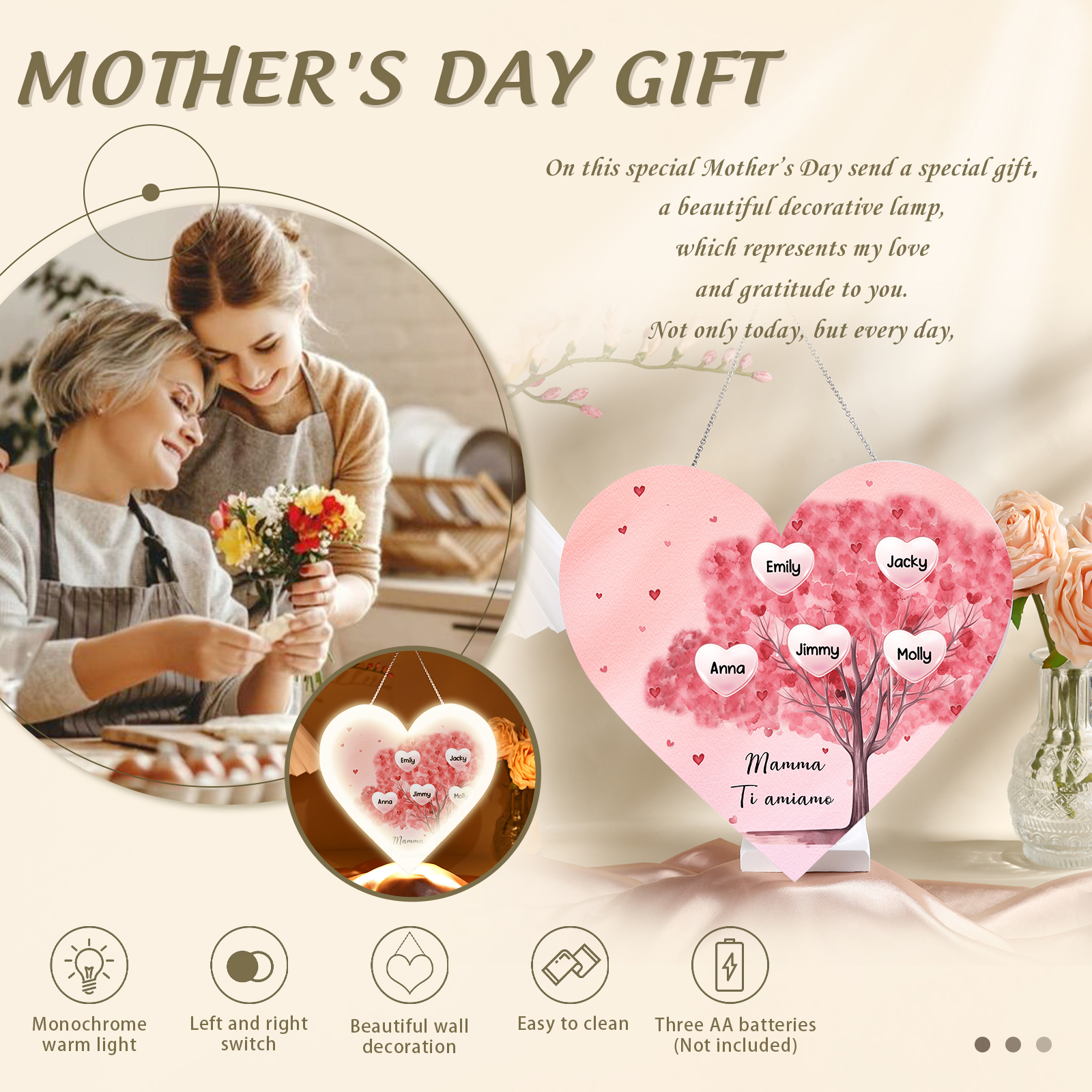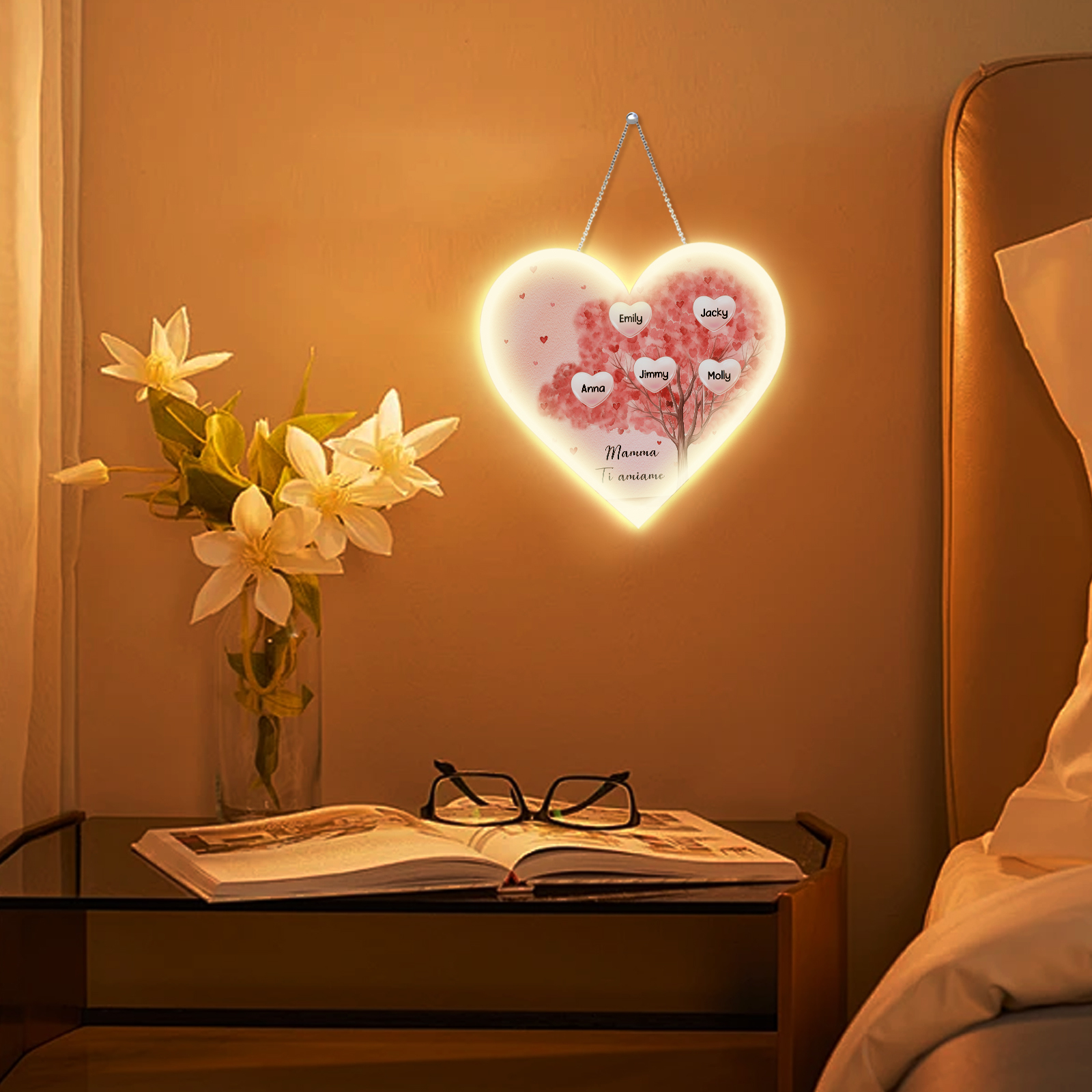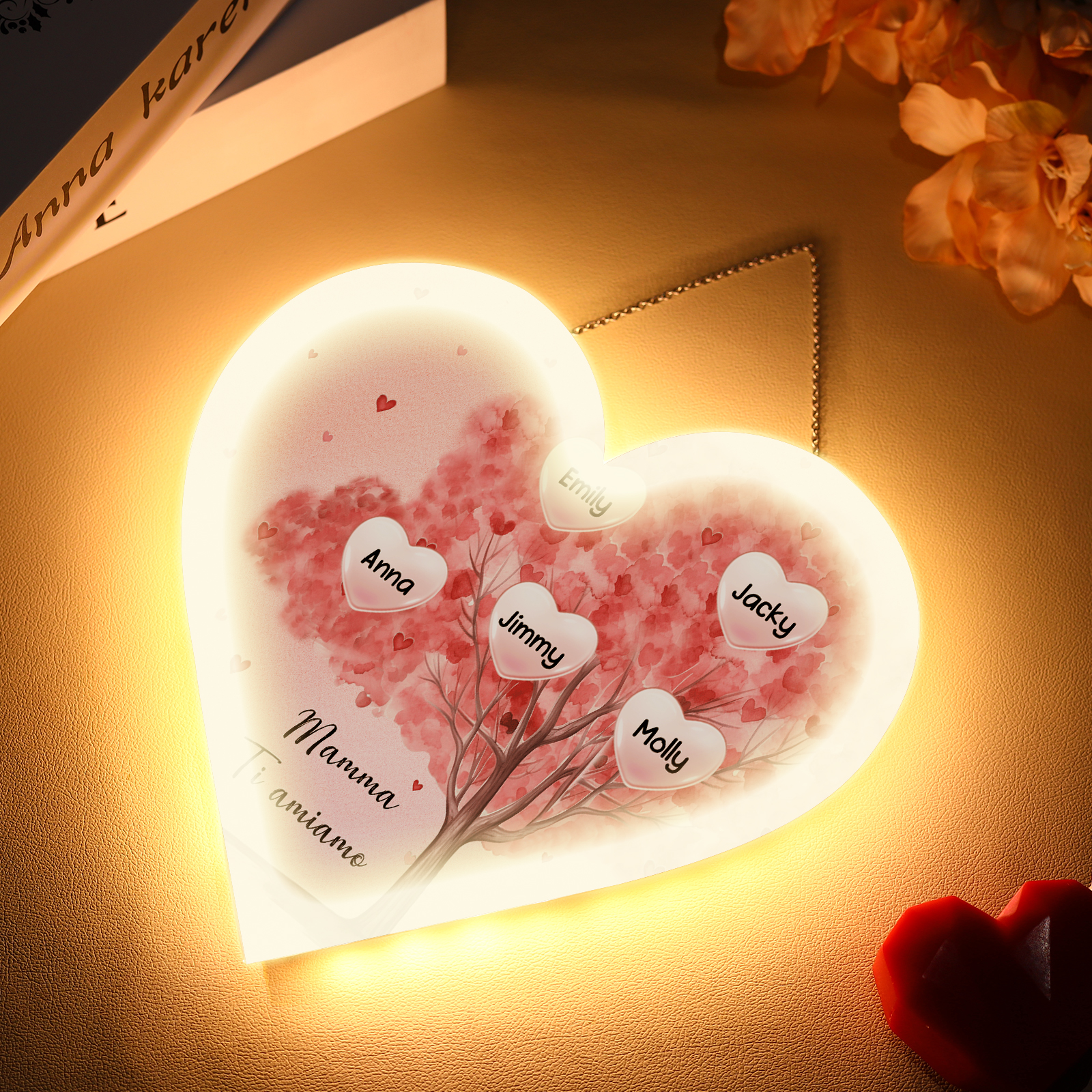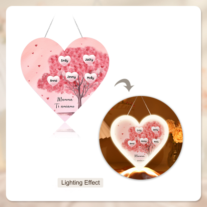 Lampada acrilica appeso albero di cuore rosa 5 nomi e 1 testo personalizzabili per mamma/nonna