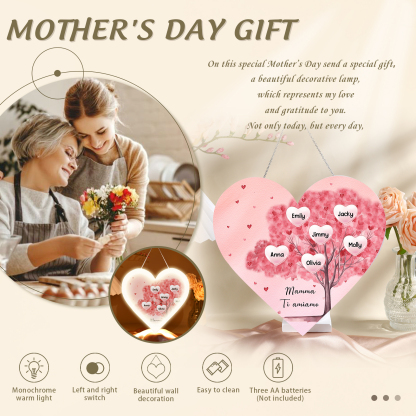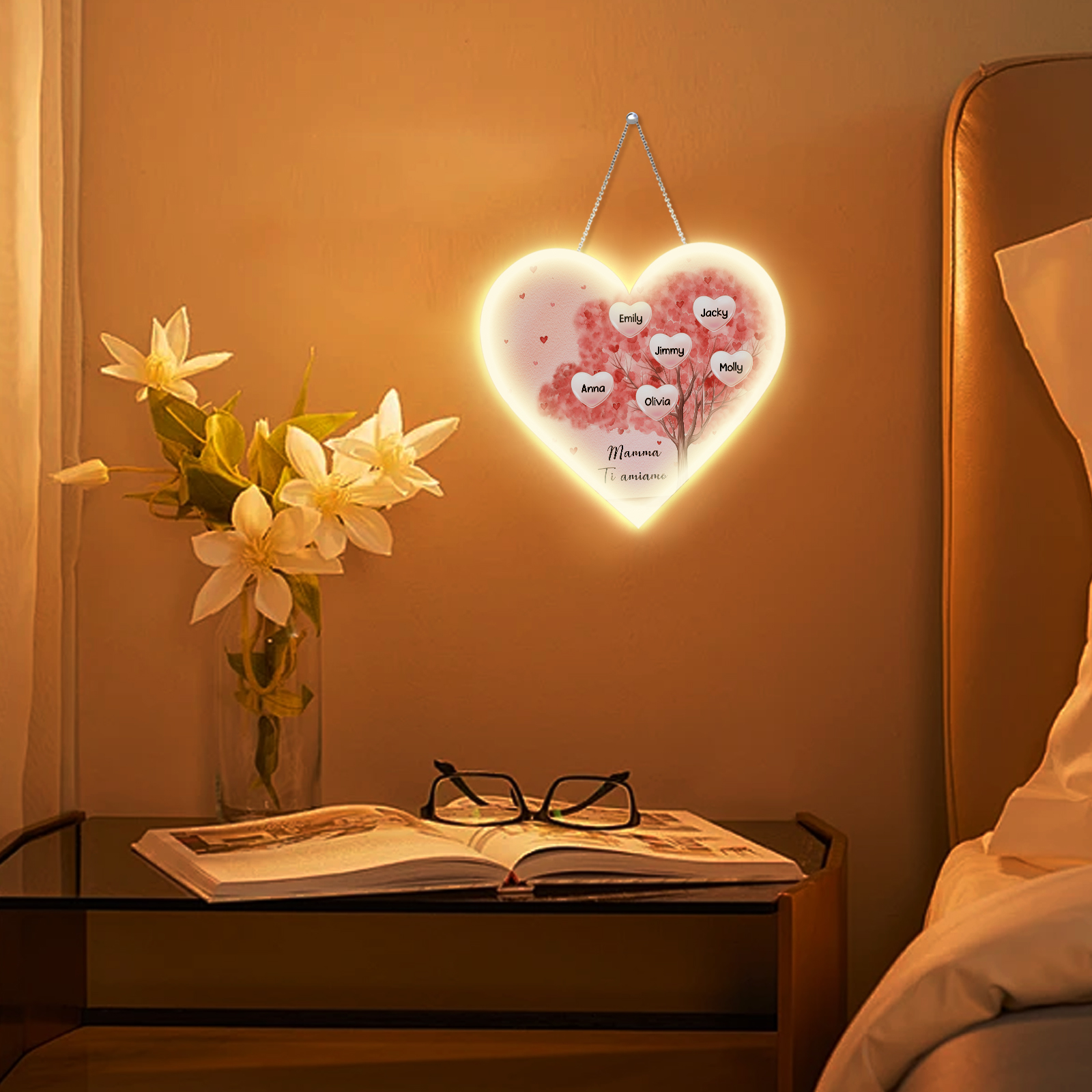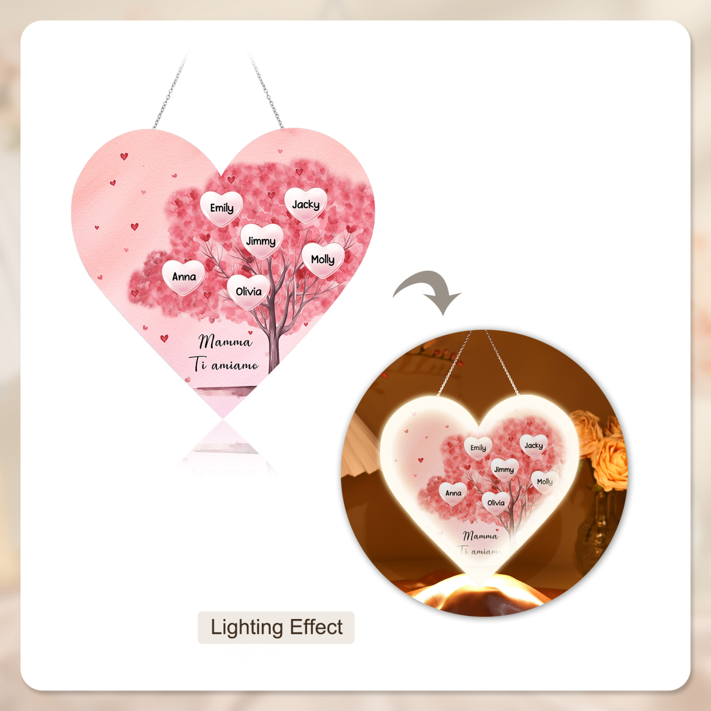 Lampada acrilica appeso albero di cuore rosa 6 nomi e 1 testo personalizzabili per mamma/nonna