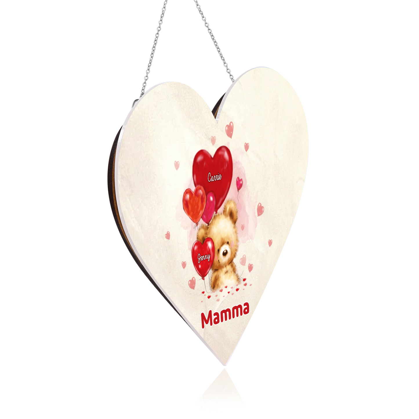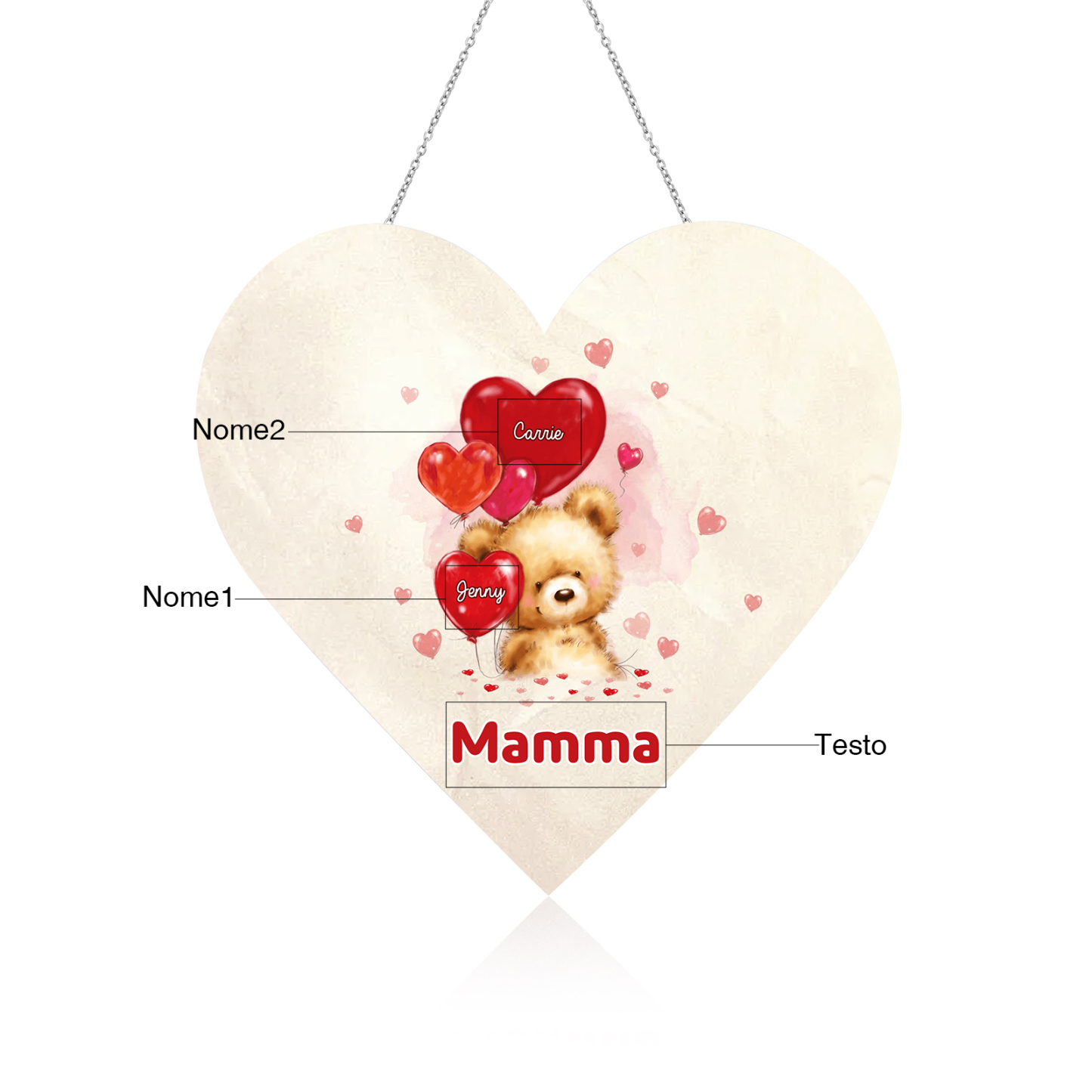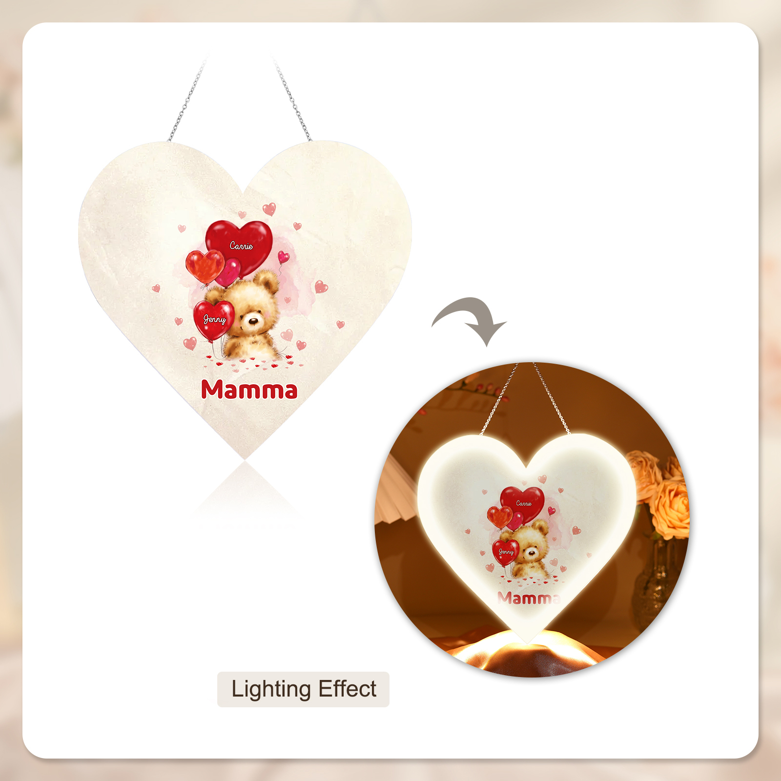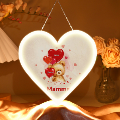 Lampada acrilica appeso orsacchitto con cuore palloncino 2 nomi e 1 testo personalizzabili per mamma/nonna