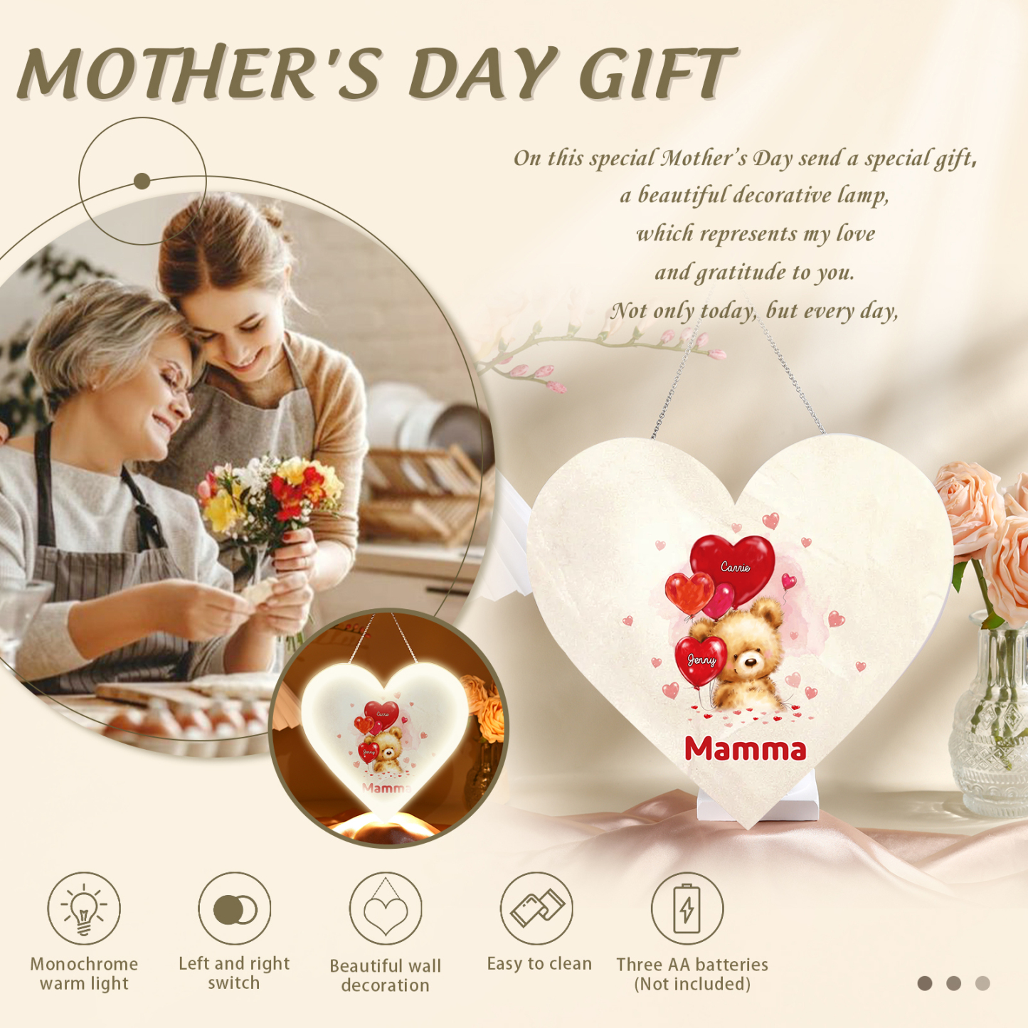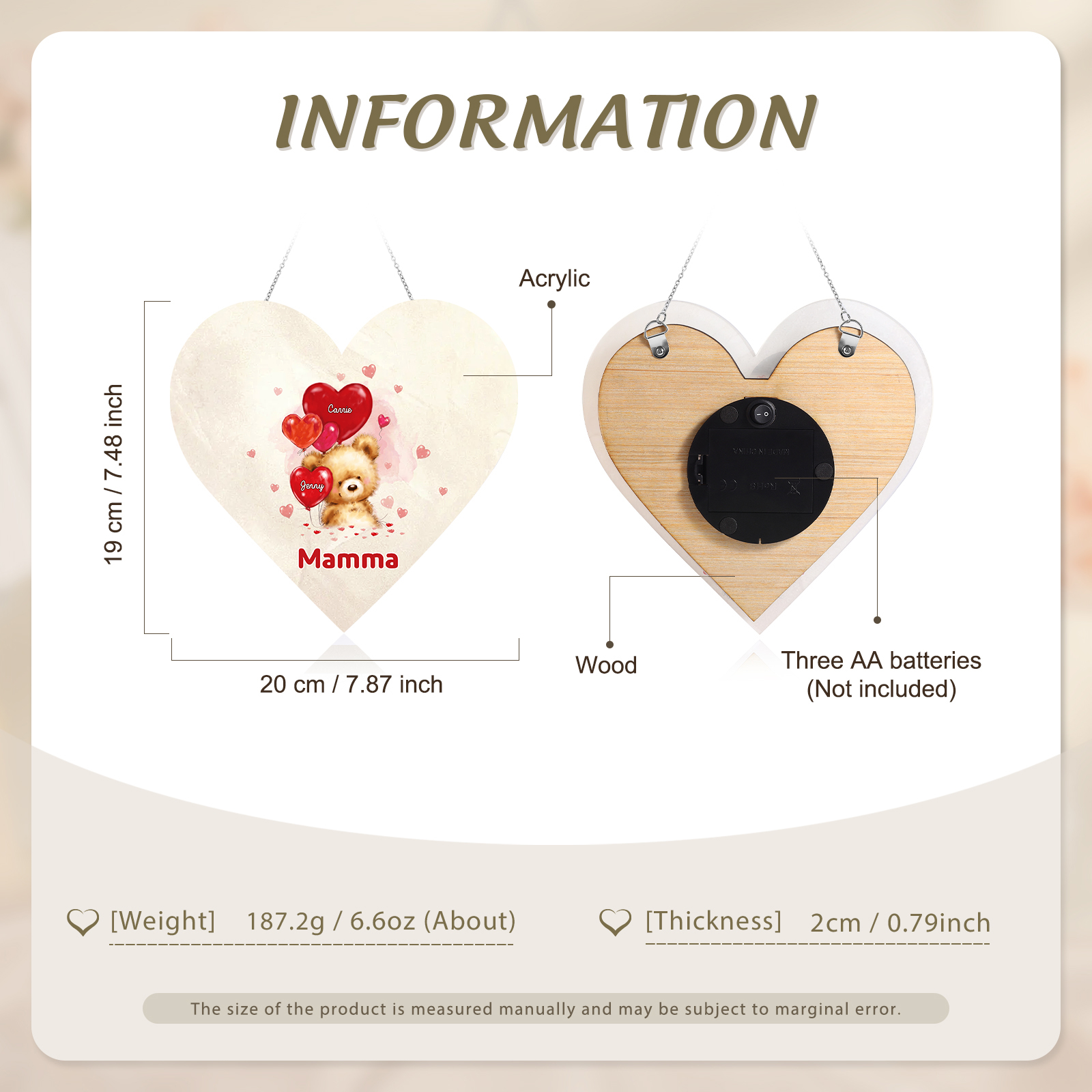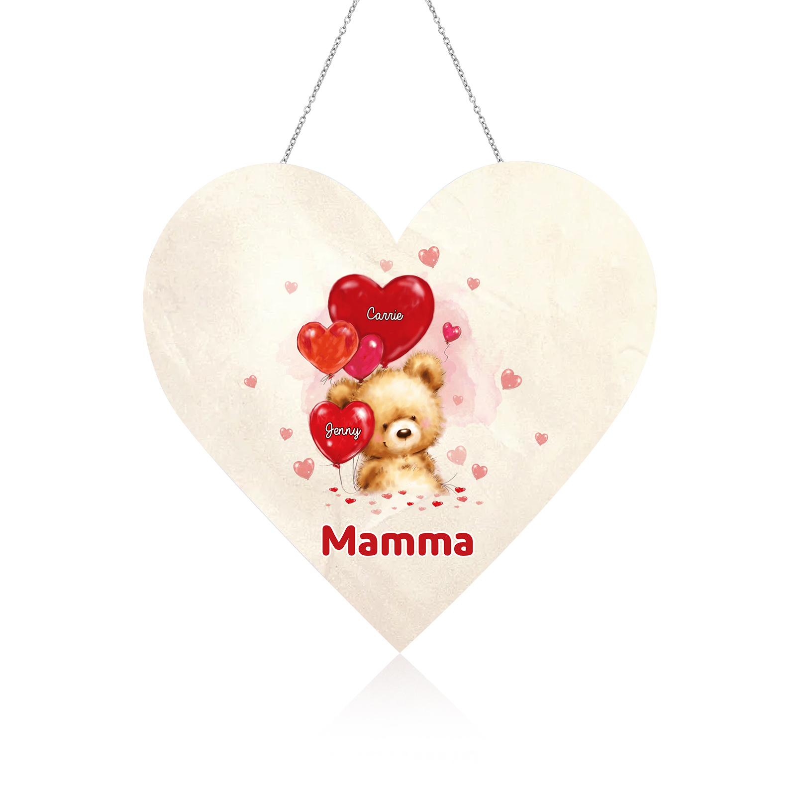 Lampada acrilica appeso orsacchitto con cuore palloncino 2 nomi e 1 testo personalizzabili per mamma/nonna