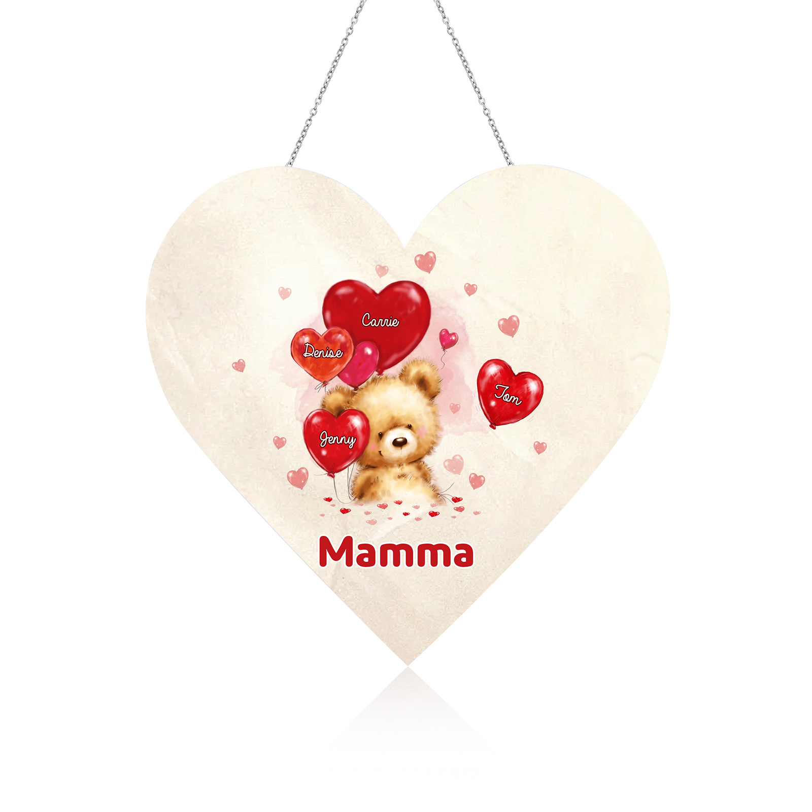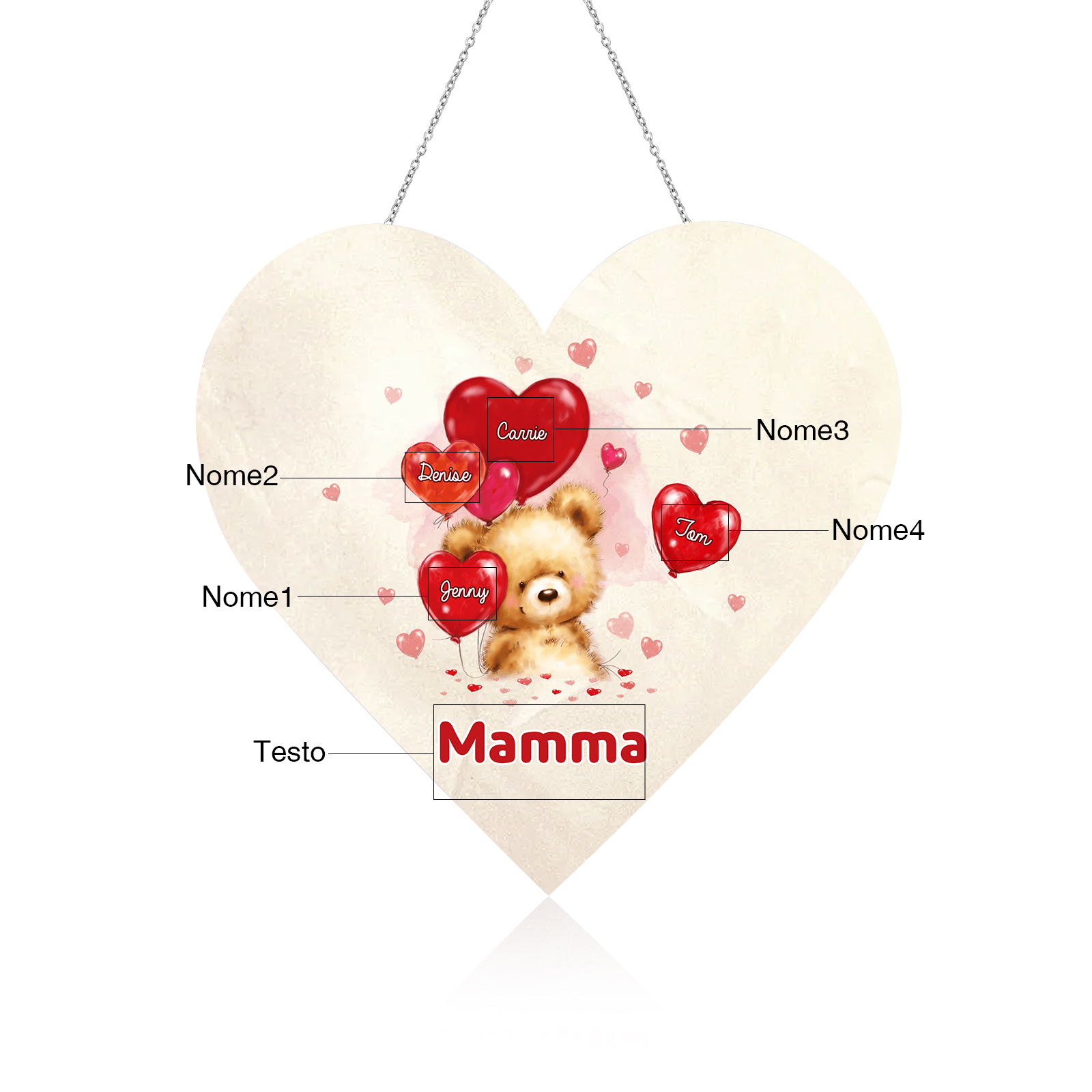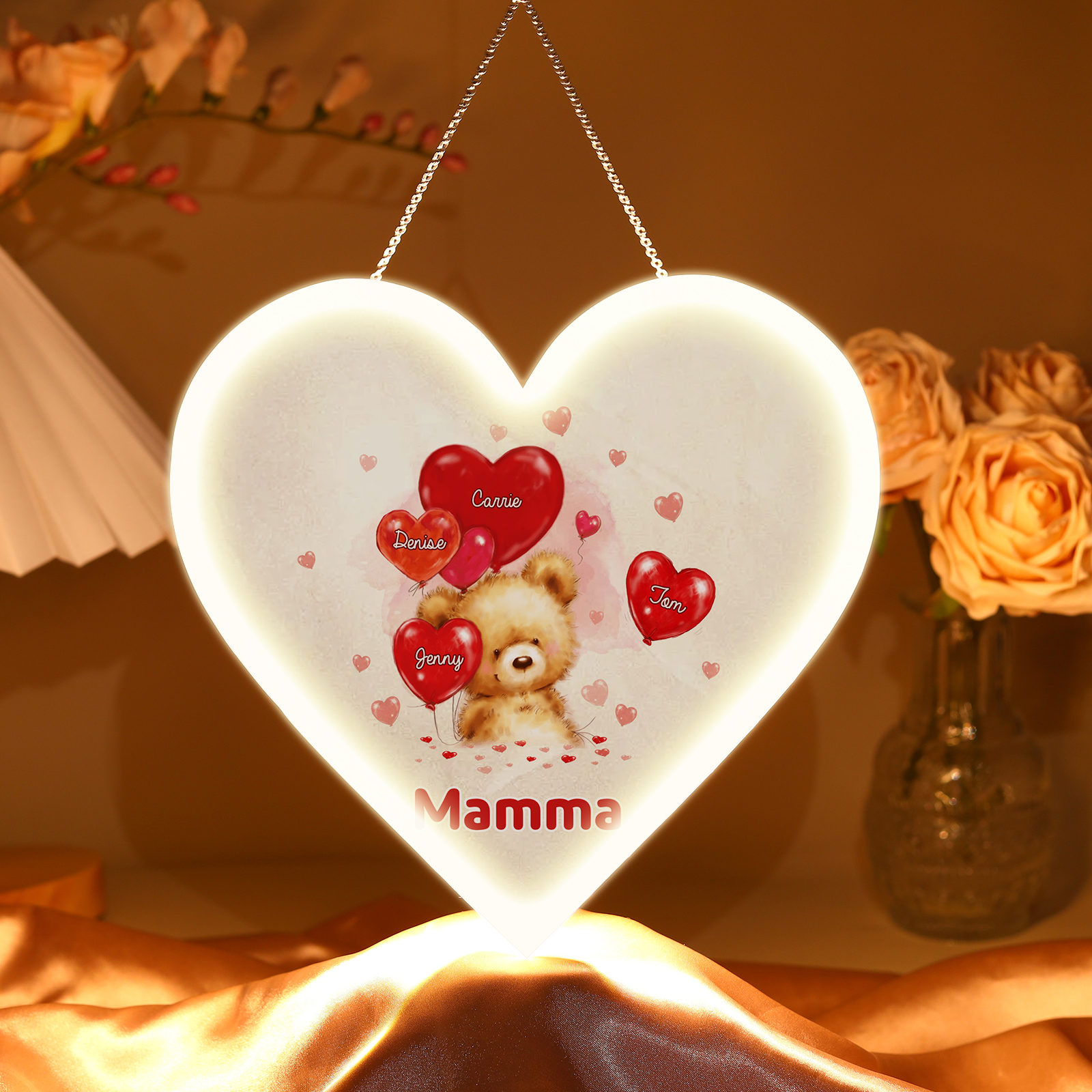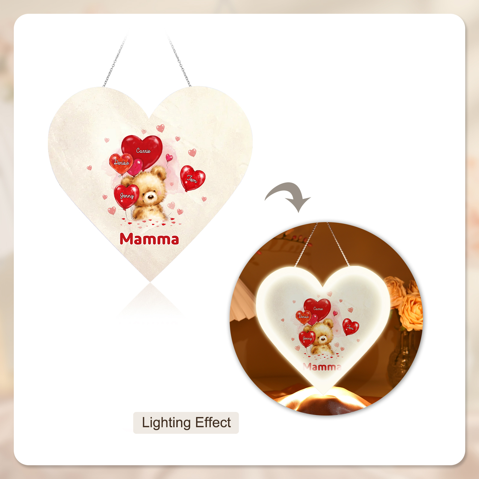 Lampada acrilica appeso orsacchitto con cuore palloncino 4 nomi e 1 testo personalizzabili per mamma/nonna