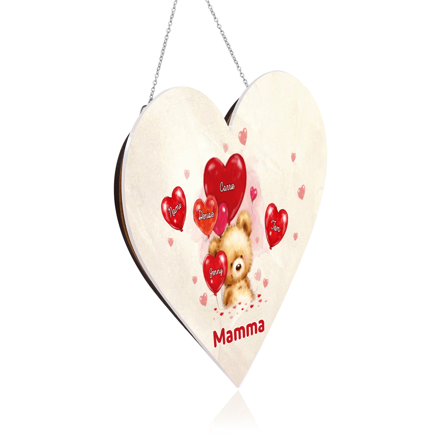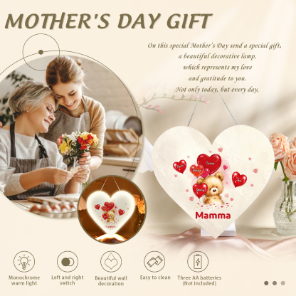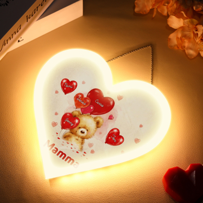 Lampada acrilica appeso orsacchitto con cuore palloncino 5 nomi e 1 testo personalizzabili per mamma/nonna