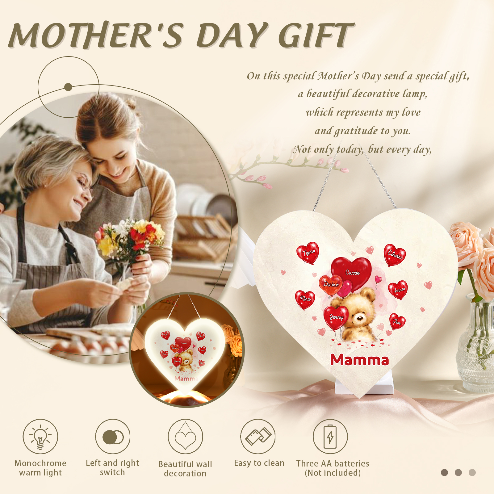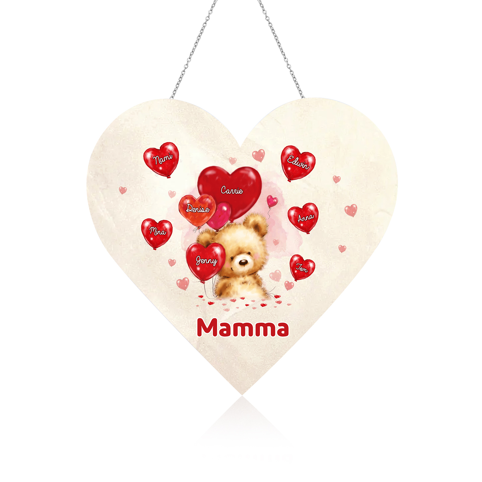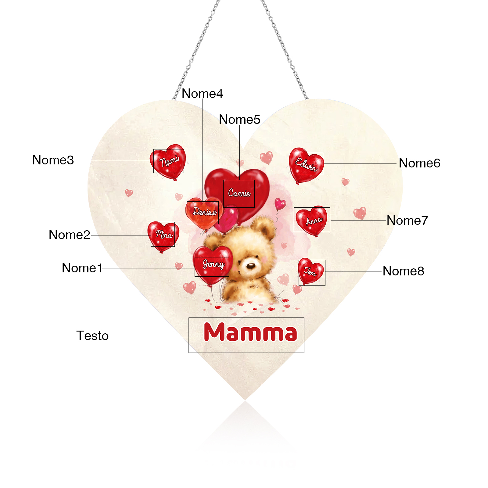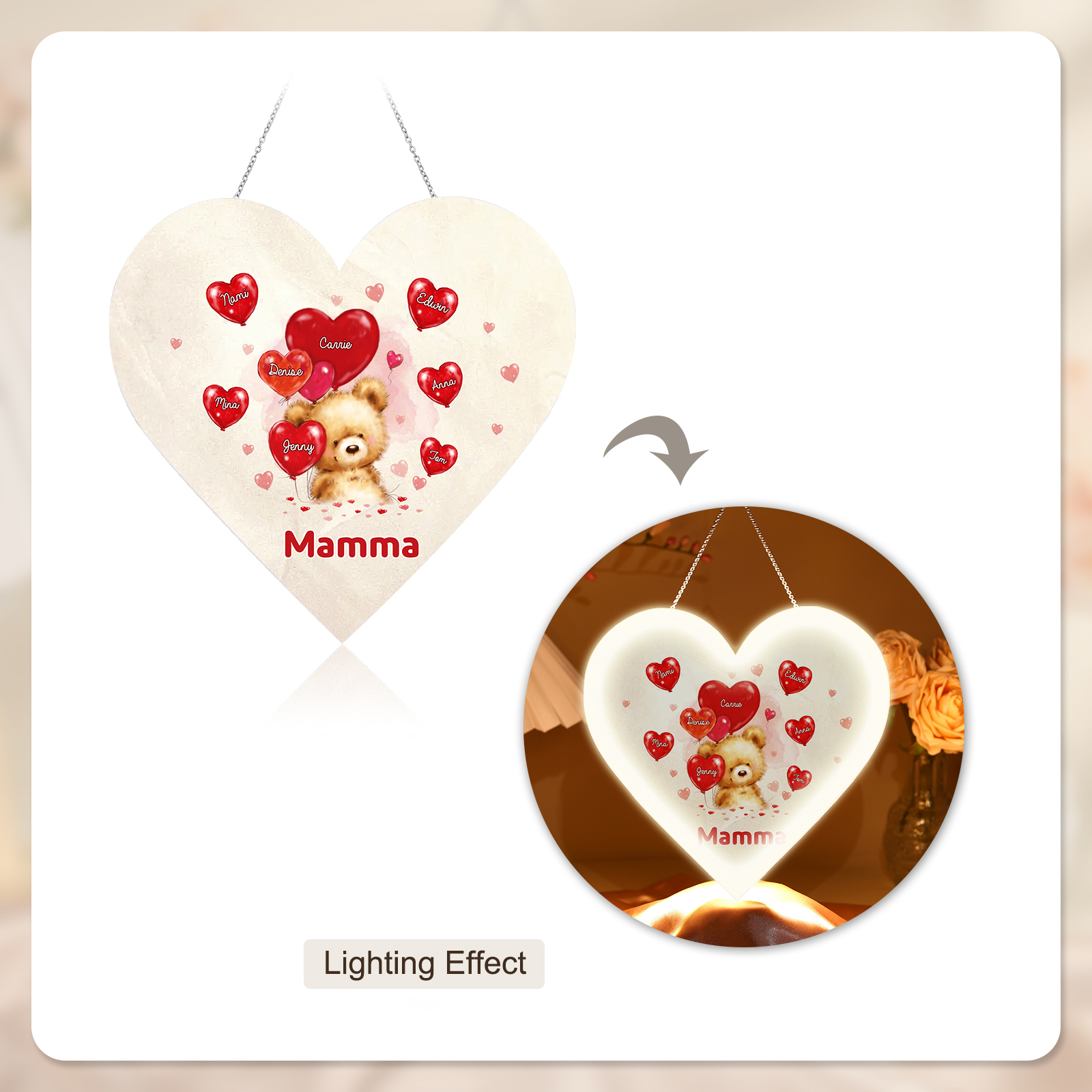 Lampada acrilica appeso orsacchitto con cuore palloncino 8 nomi e 1 testo personalizzabili per mamma/nonna