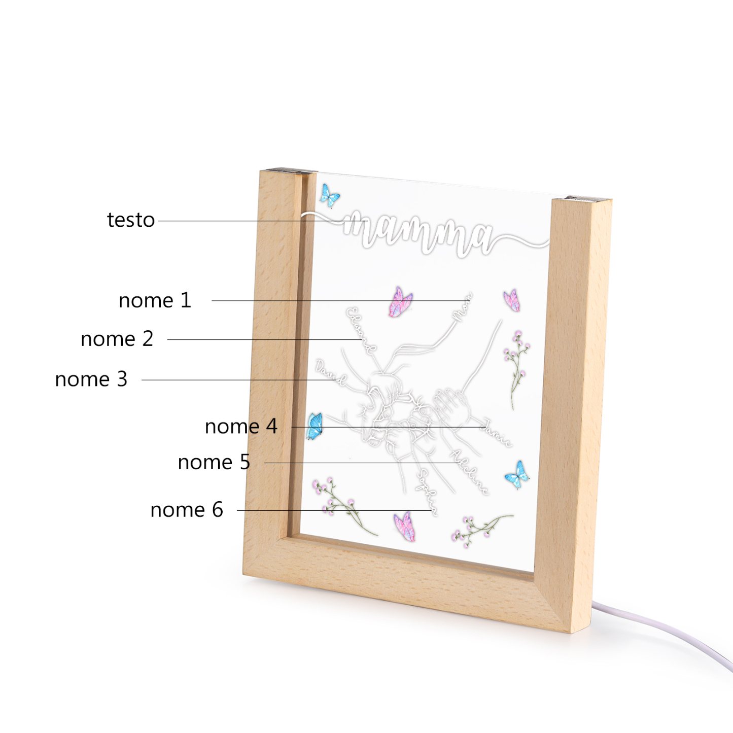 Lampada acrilica mano nella mano 6 nomi e 1 testo personalizzabili per mamma/nonna