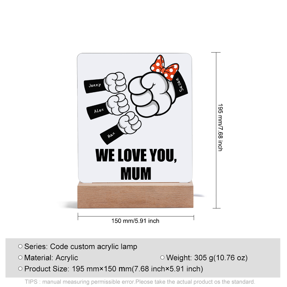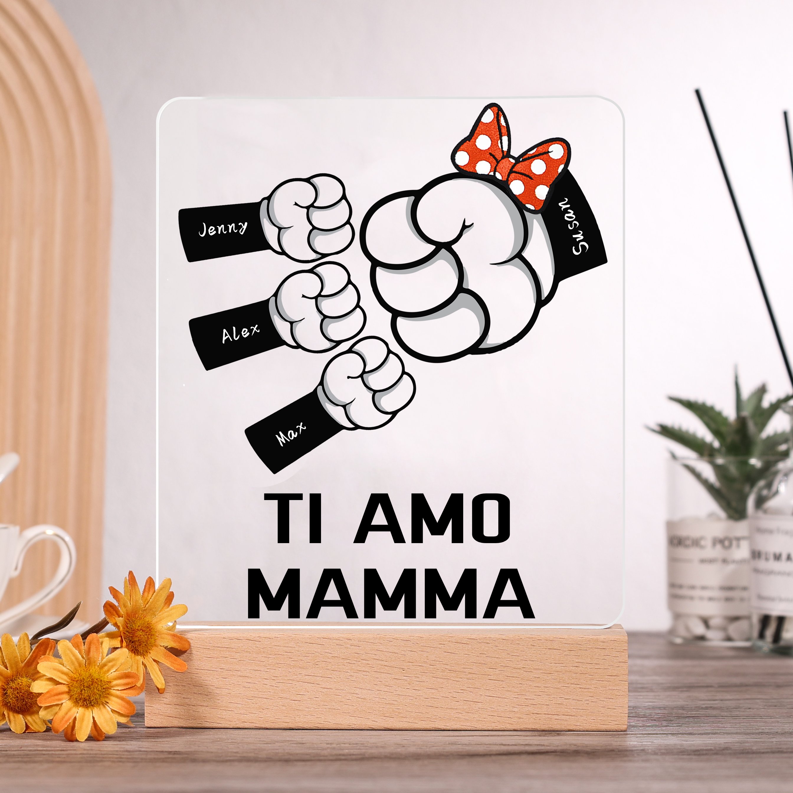 Lampada acrilica pugno a pugno 4 nomi e 1 testo personalizzabili per mamma