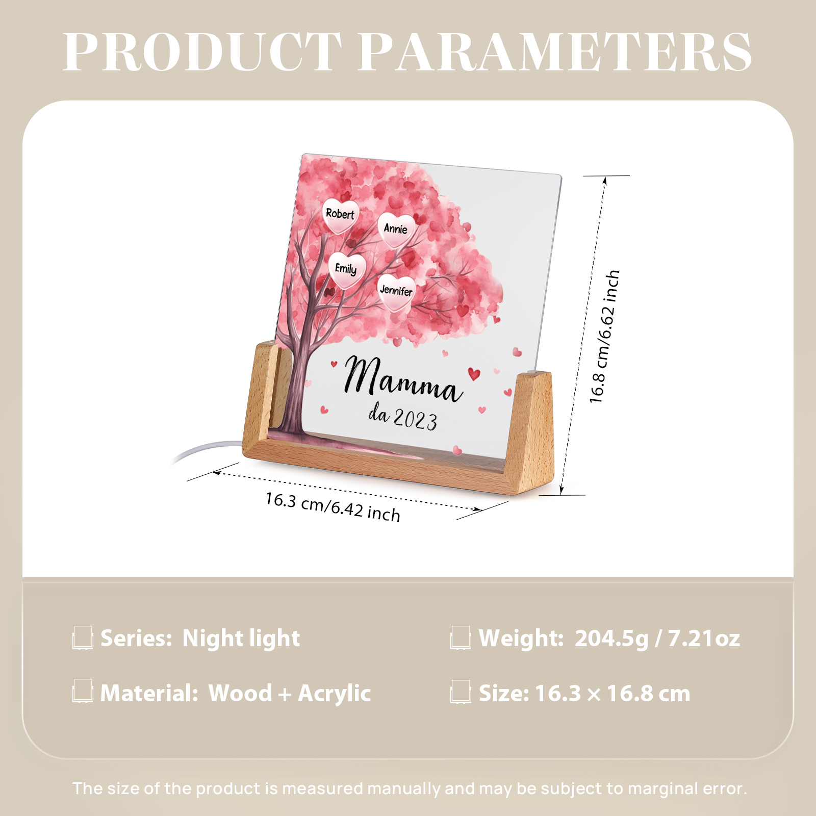 Lampada albero di cuore rosa con 3 tipi di colori di LED luce 4 nomi e 1 testo e 1 data personalizzati per mamma/nonna