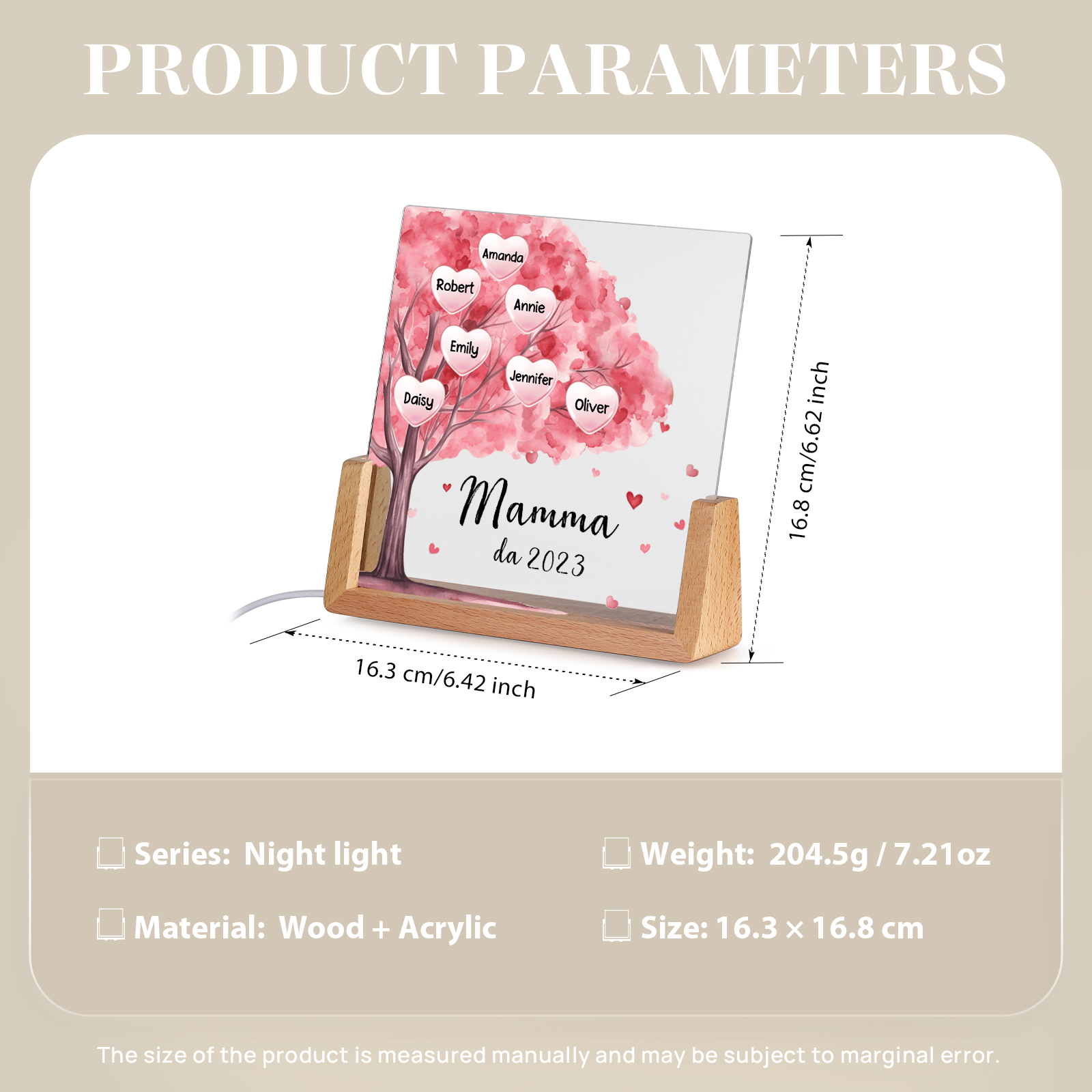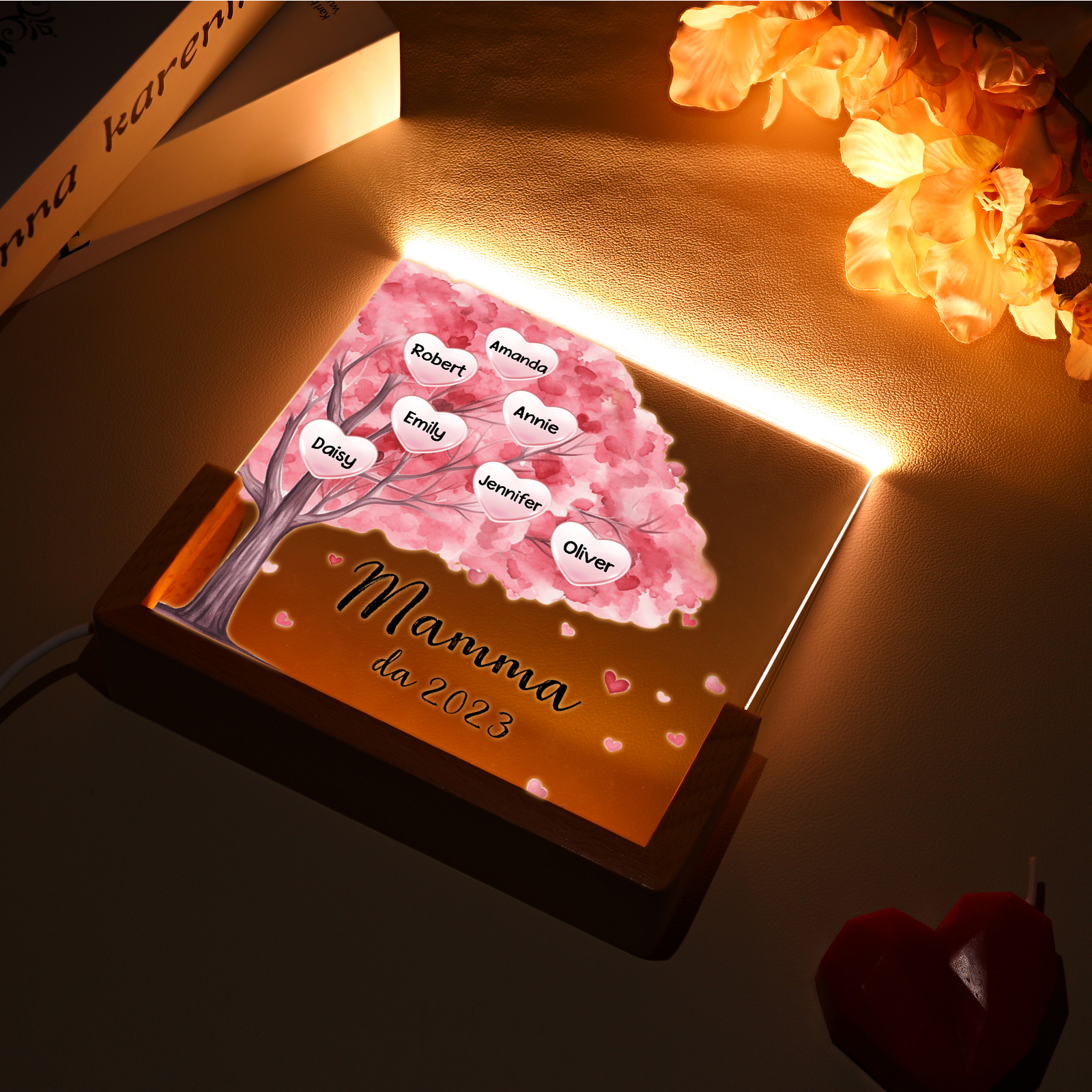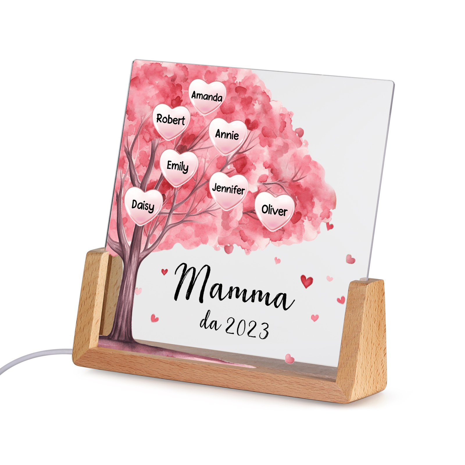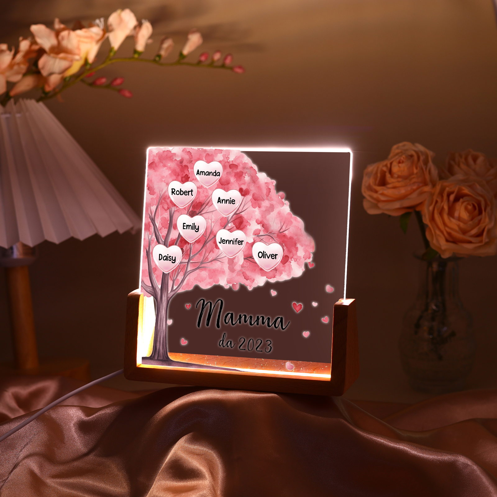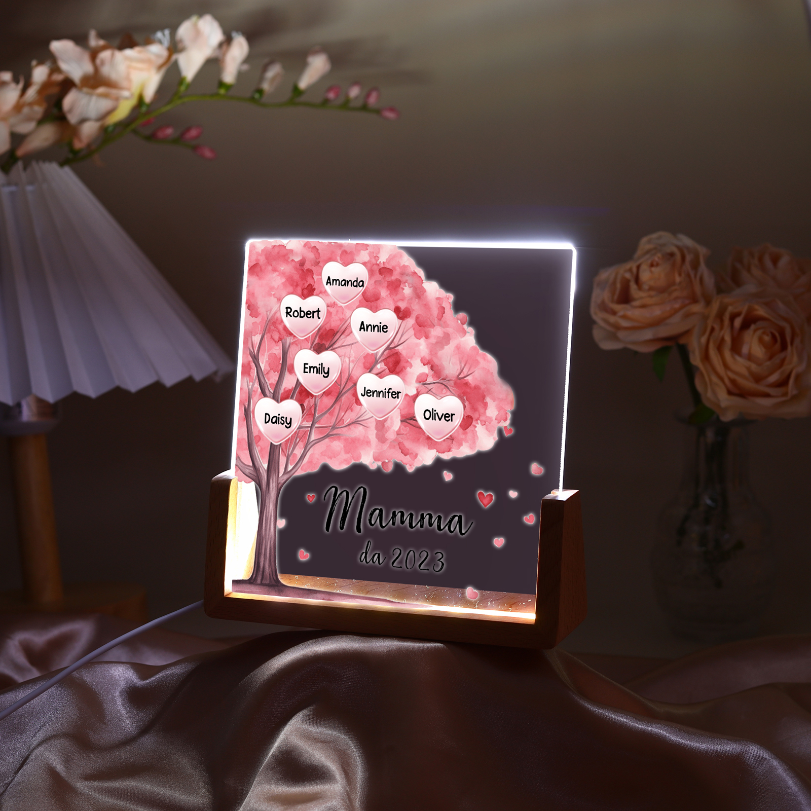 Lampada albero di cuore rosa con 3 tipi di colori di LED luce 7 nomi e 1 testo e 1 data personalizzati per mamma/nonna