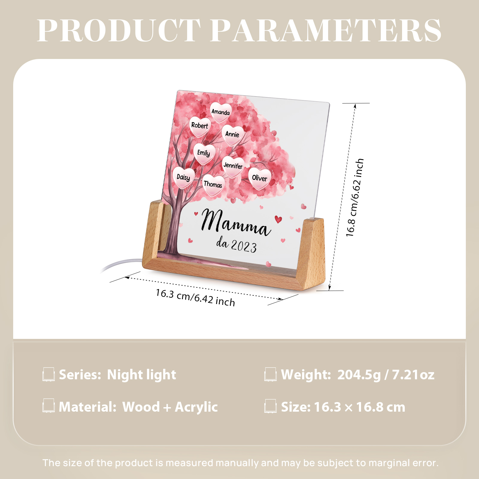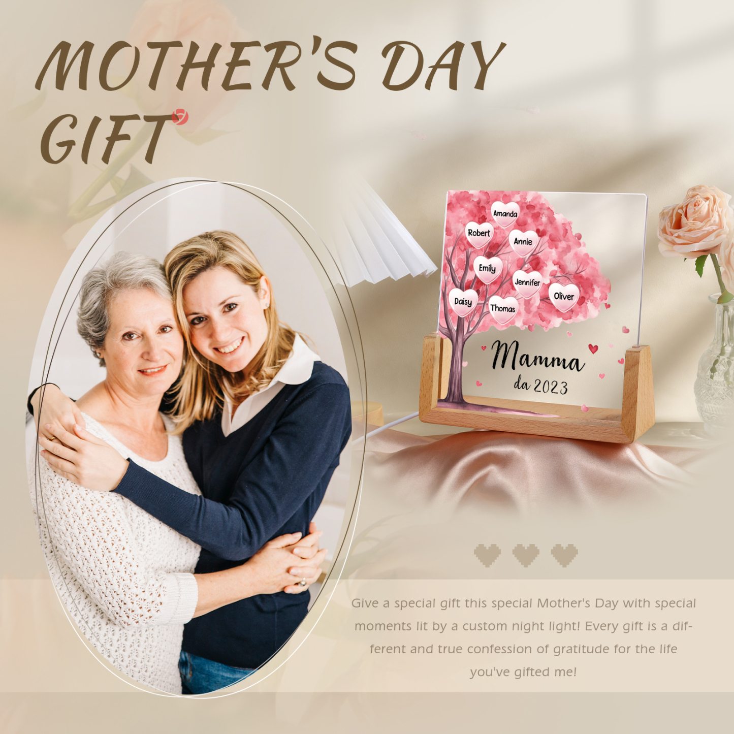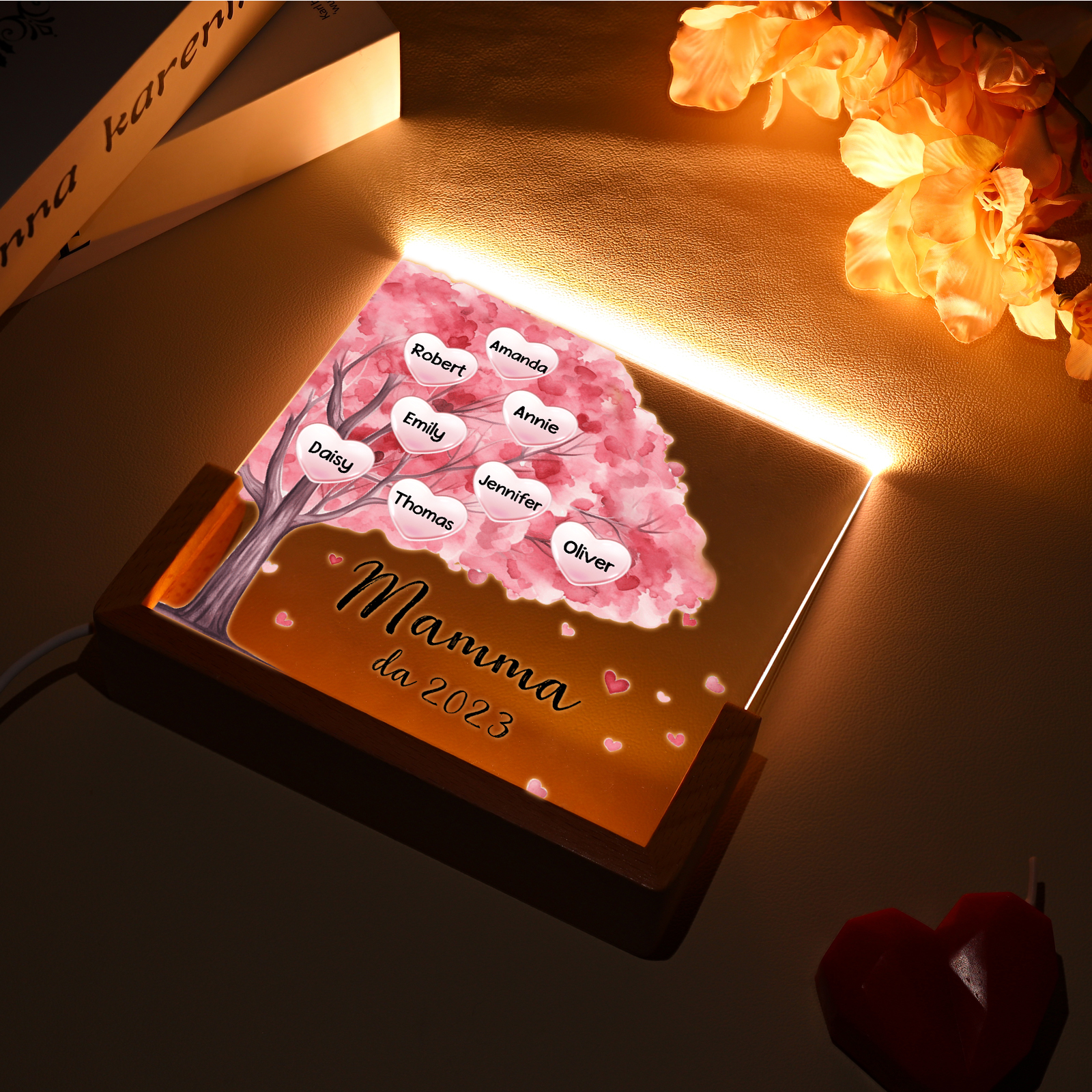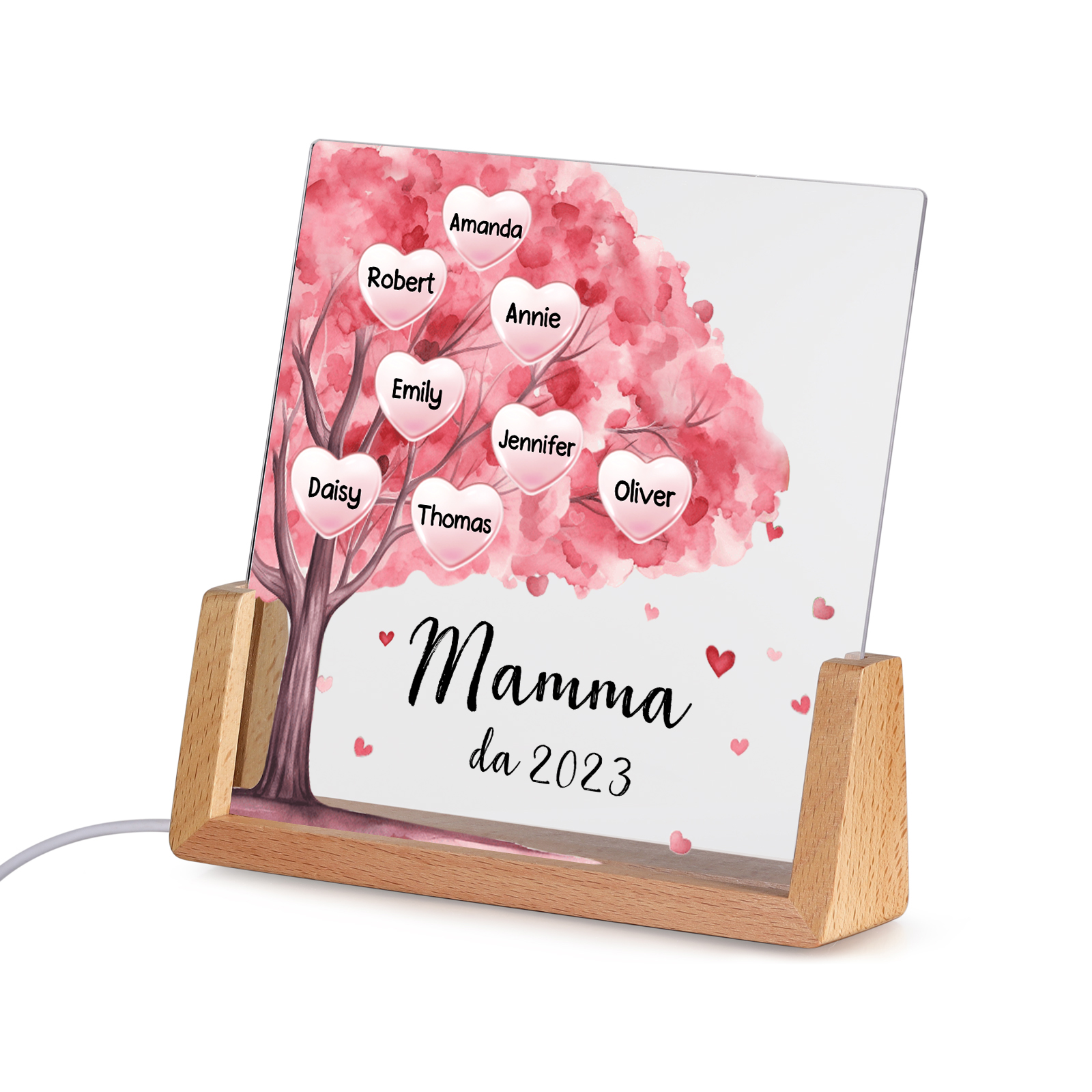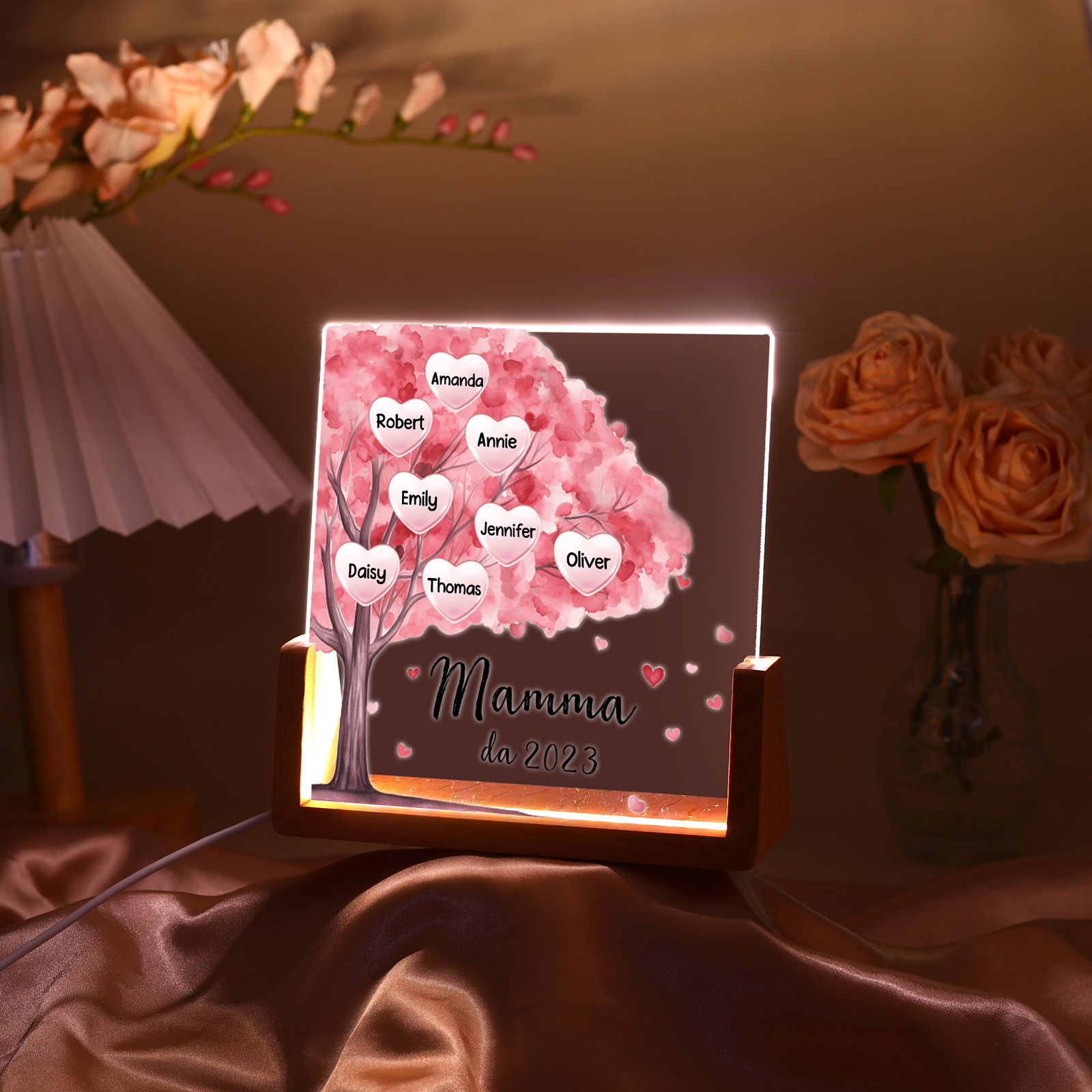 Lampada albero di cuore rosa con 3 tipi di colori di LED luce 8 nomi e 1 testo e 1 data personalizzati per mamma/nonna