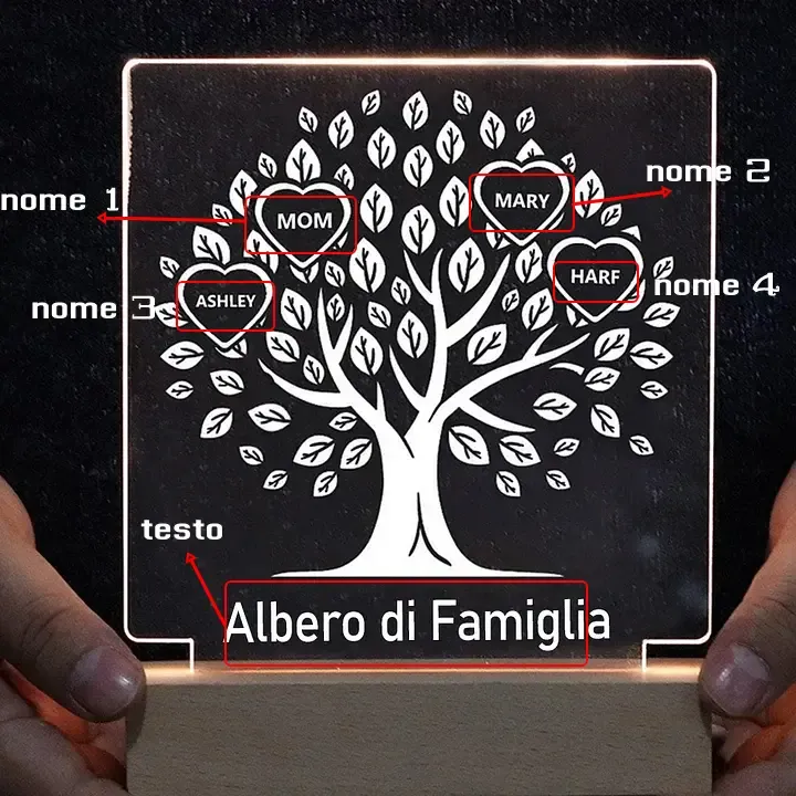 Lampada albero familiare personalizza con 4 nomi e testo