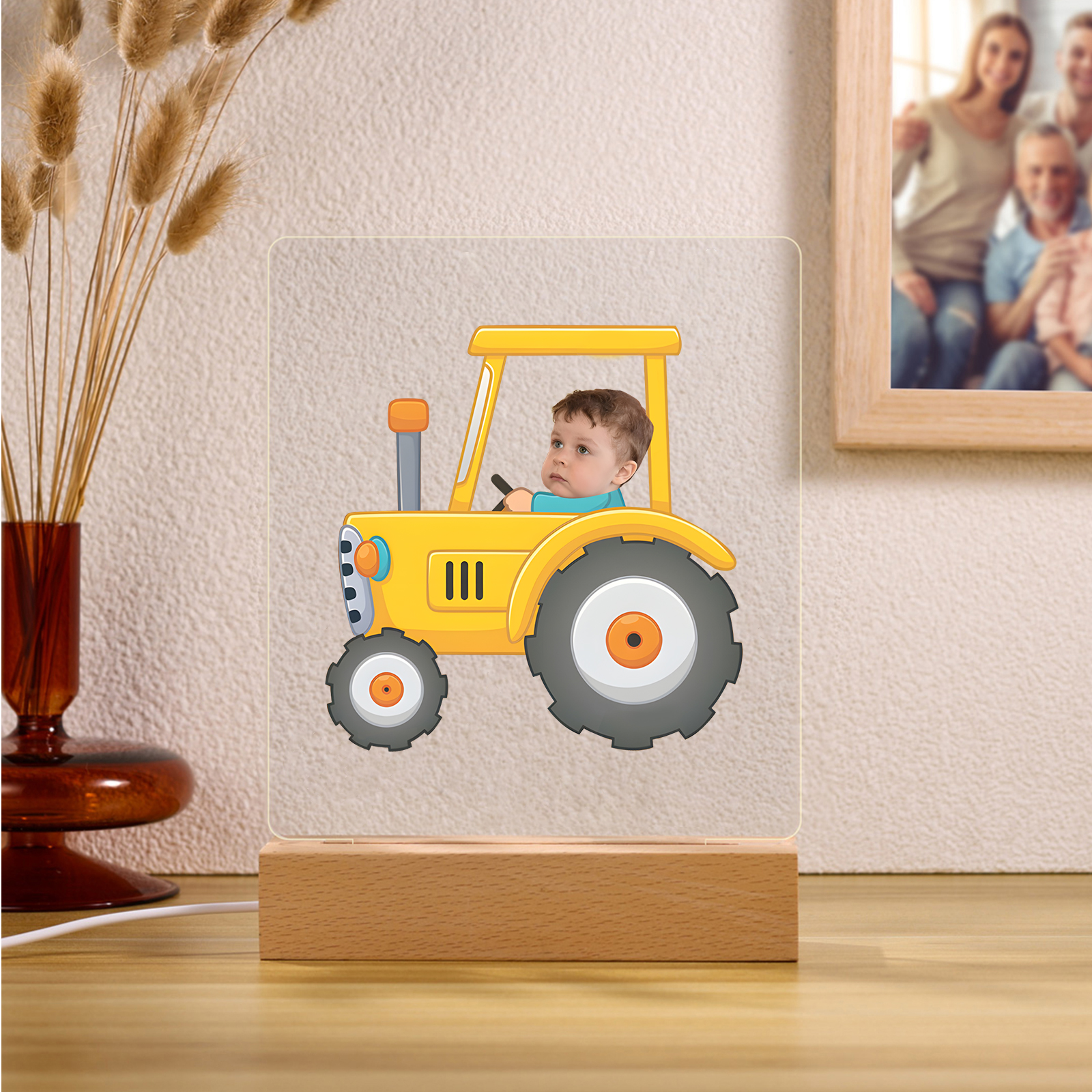 Lampada macchina gialla con 1 nome e 1 foto personalizzabili per bambino/bambina