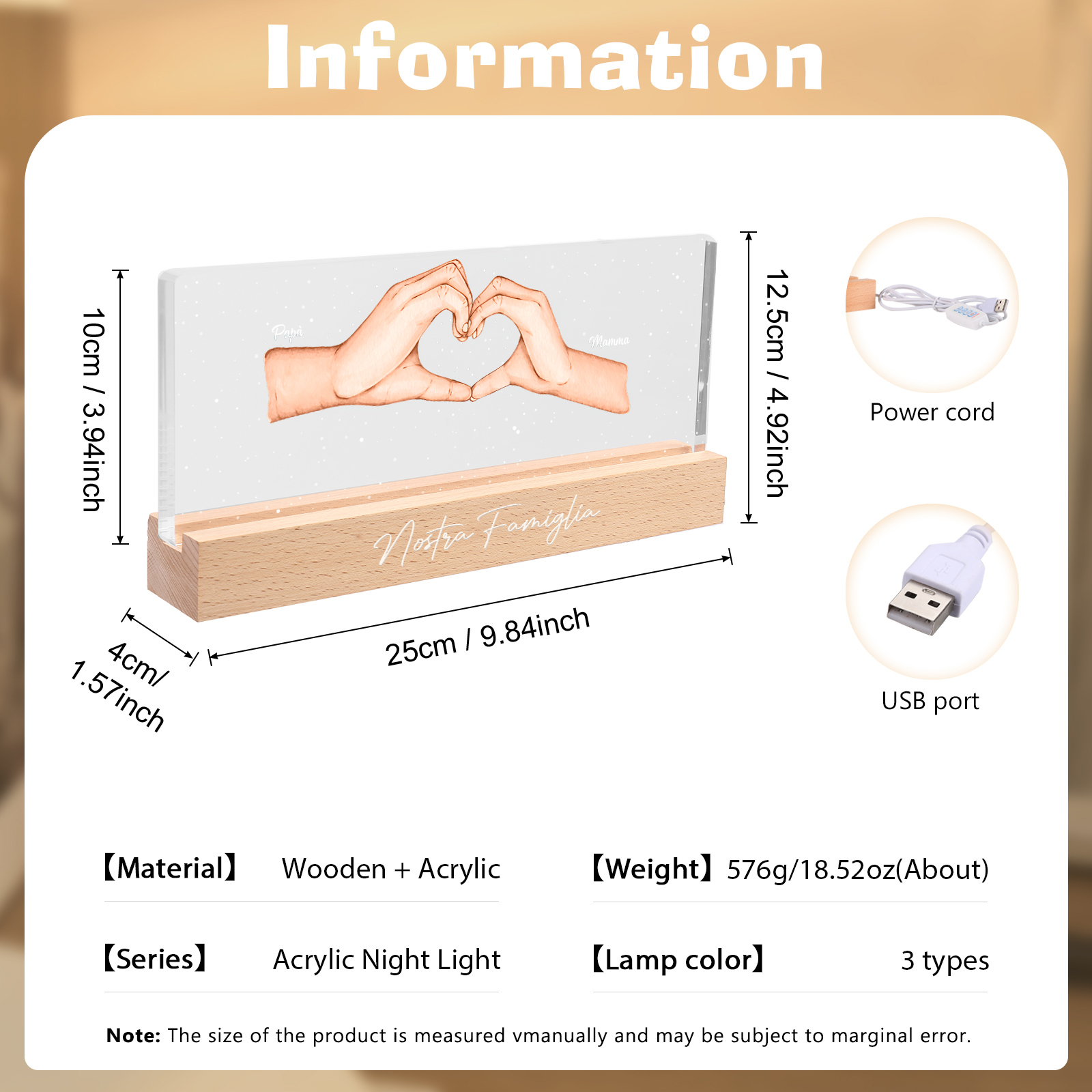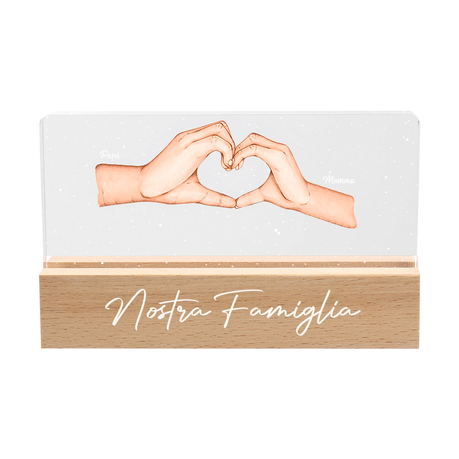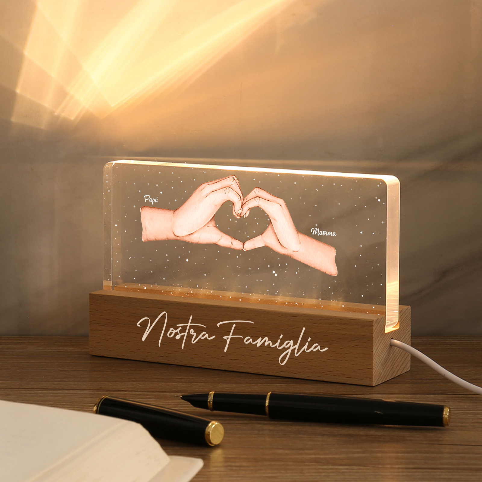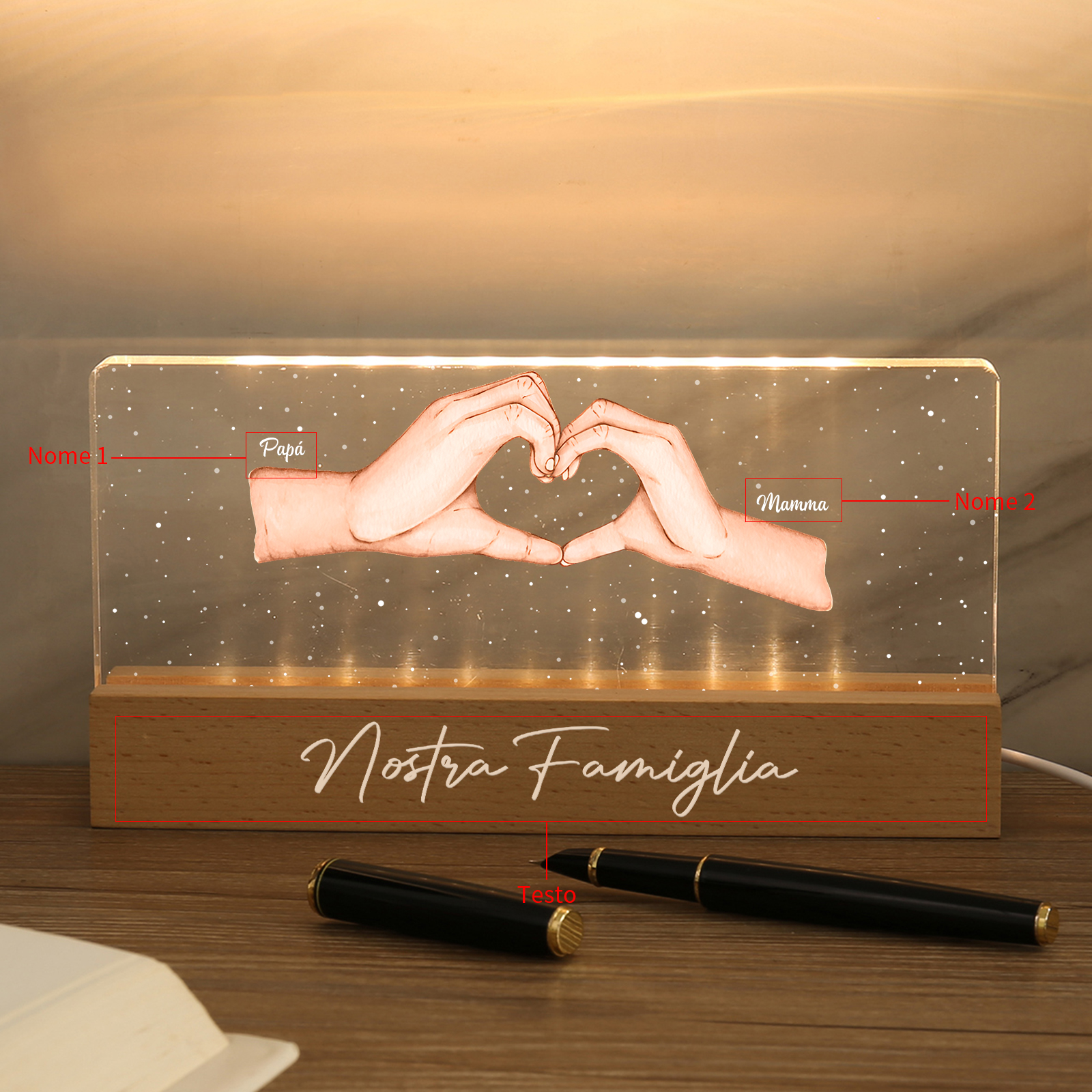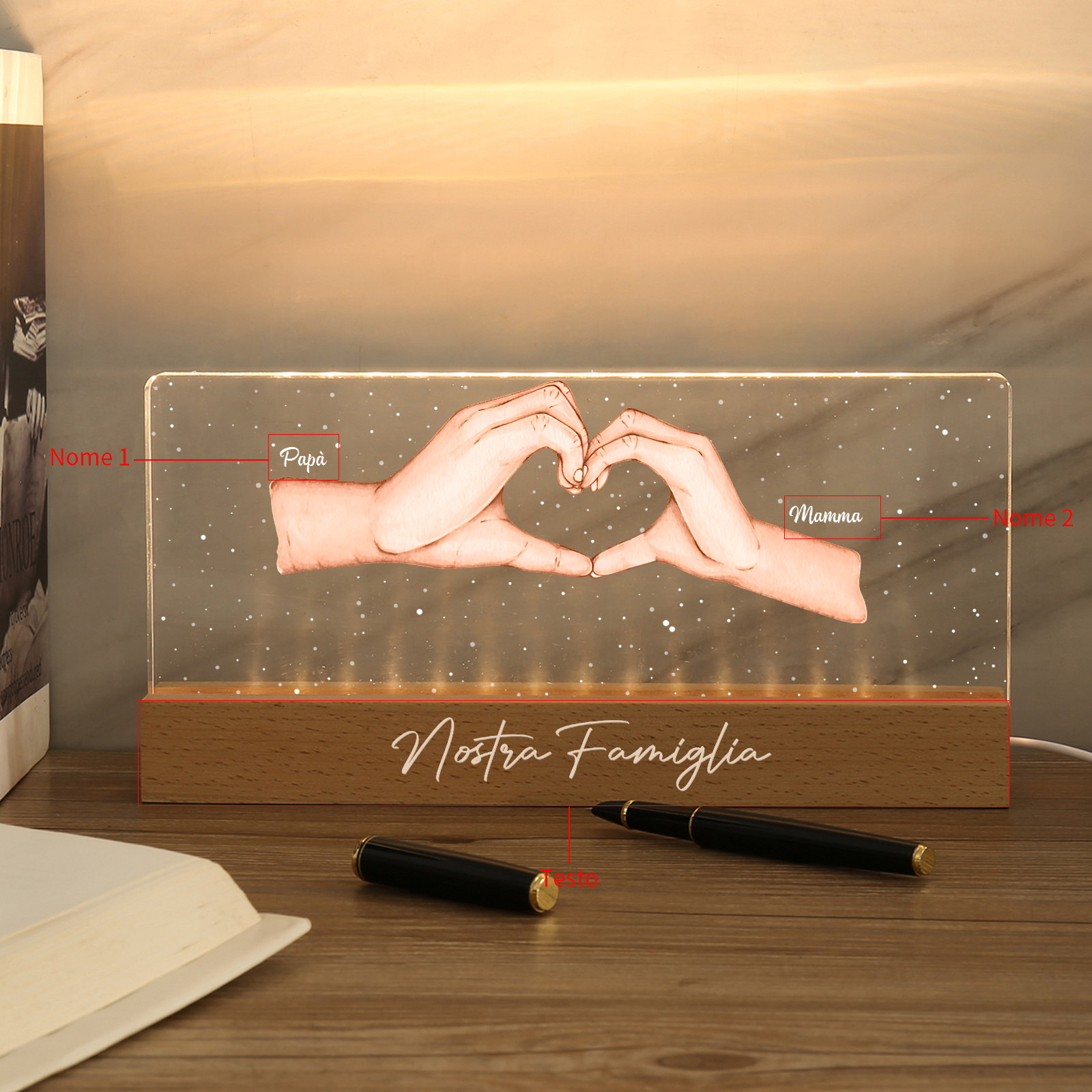 Lampada mano e mano a cuore a tre colori con 2 nomi e 1 testo personalizzati per famiglia